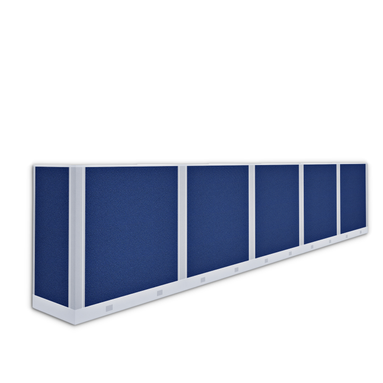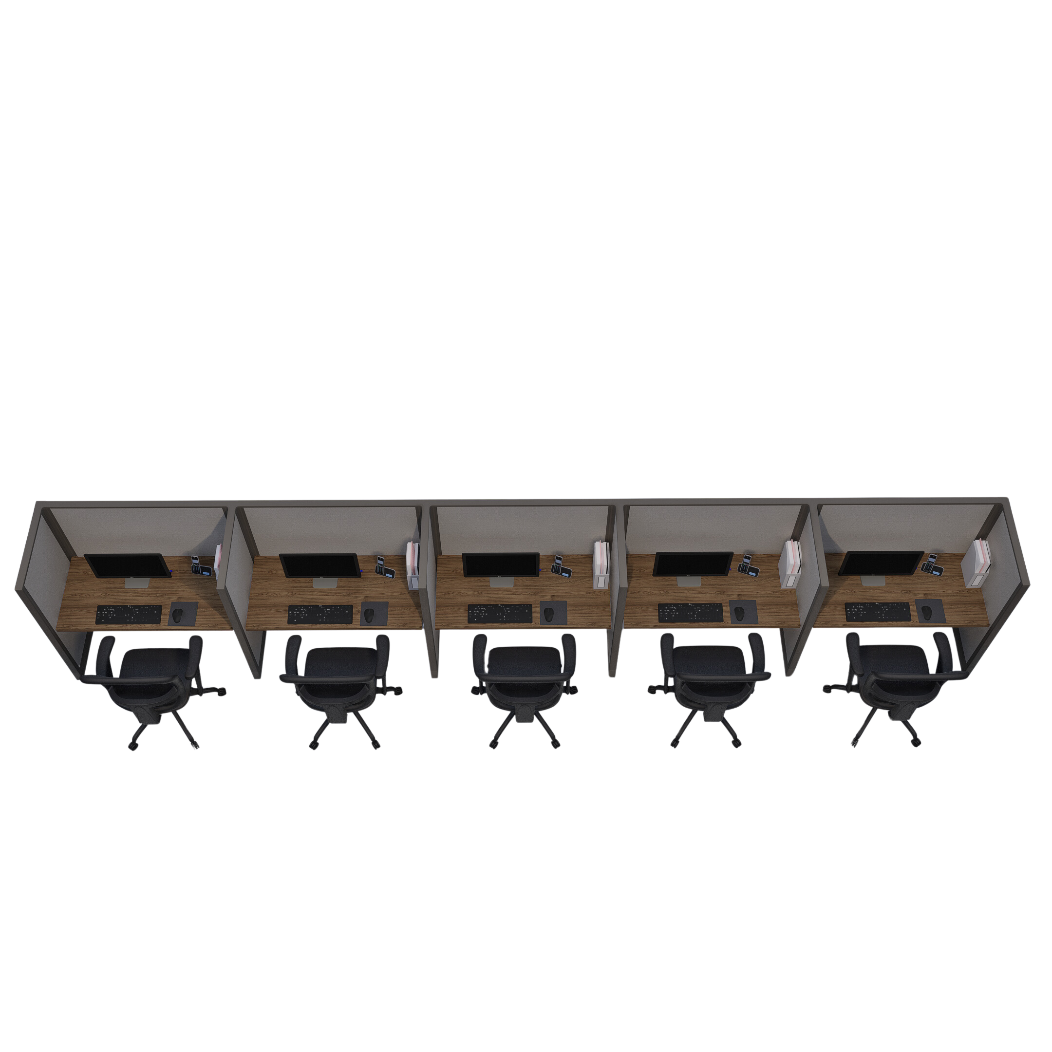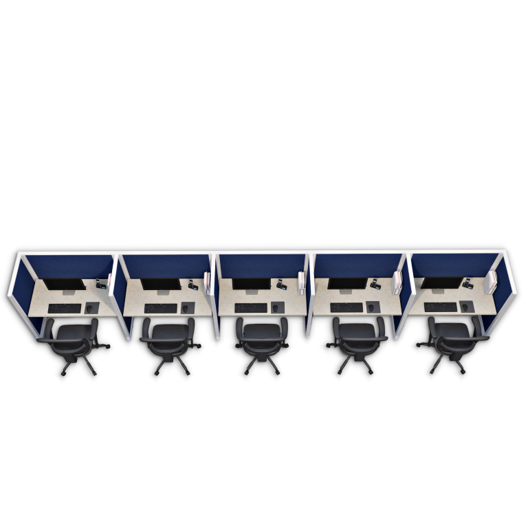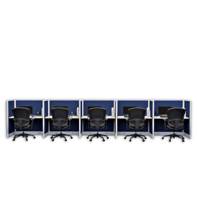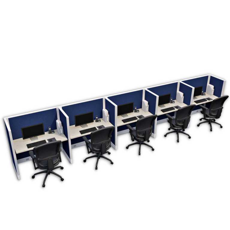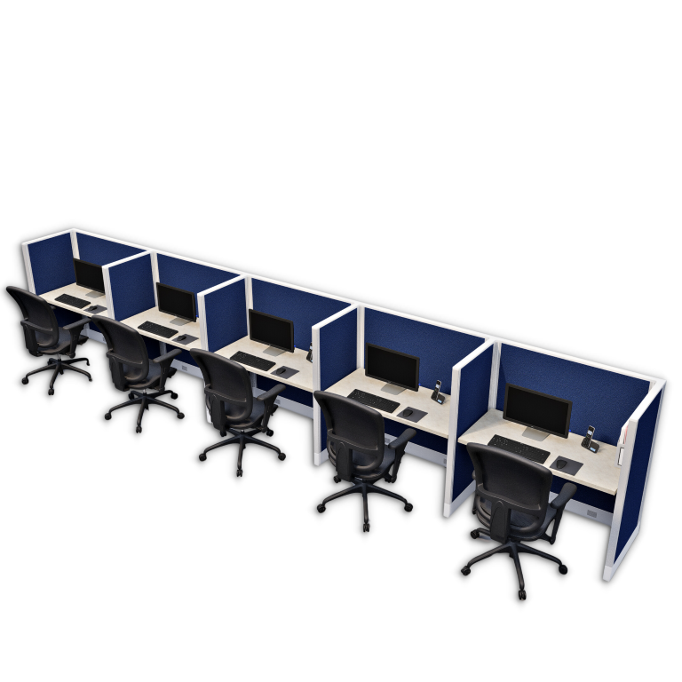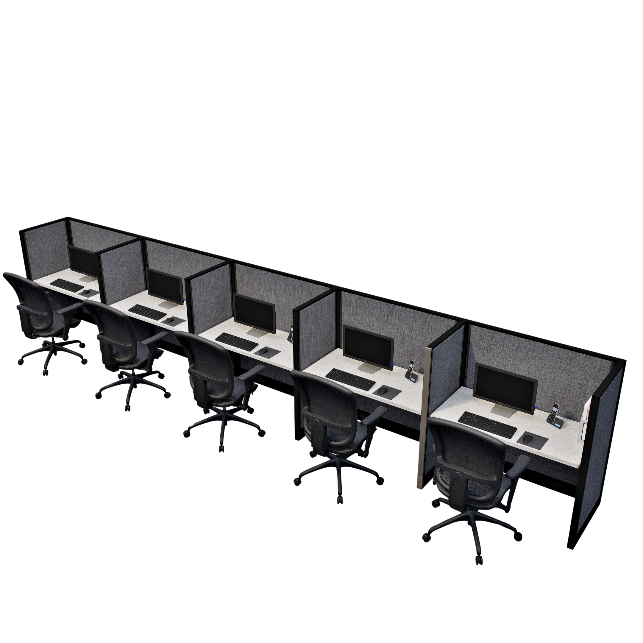This line of five 53-inch tall call center cubicles, each measuring 4 by 2 feet, is an efficient solution for creating organized workstations against a wall. The compact, streamlined design offers individual workspaces with essential privacy, while the 53-inch height allows supervisors clear visibility along the entire row. Ideal for call centers and high-traffic offices, this setup maximizes space, making it both functional and unobtrusive, with a layout that supports productivity while fitting seamlessly against a wall.