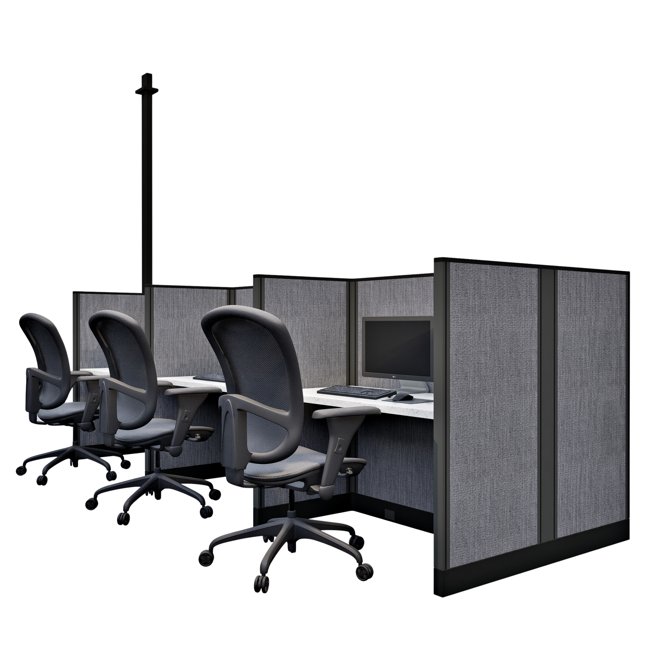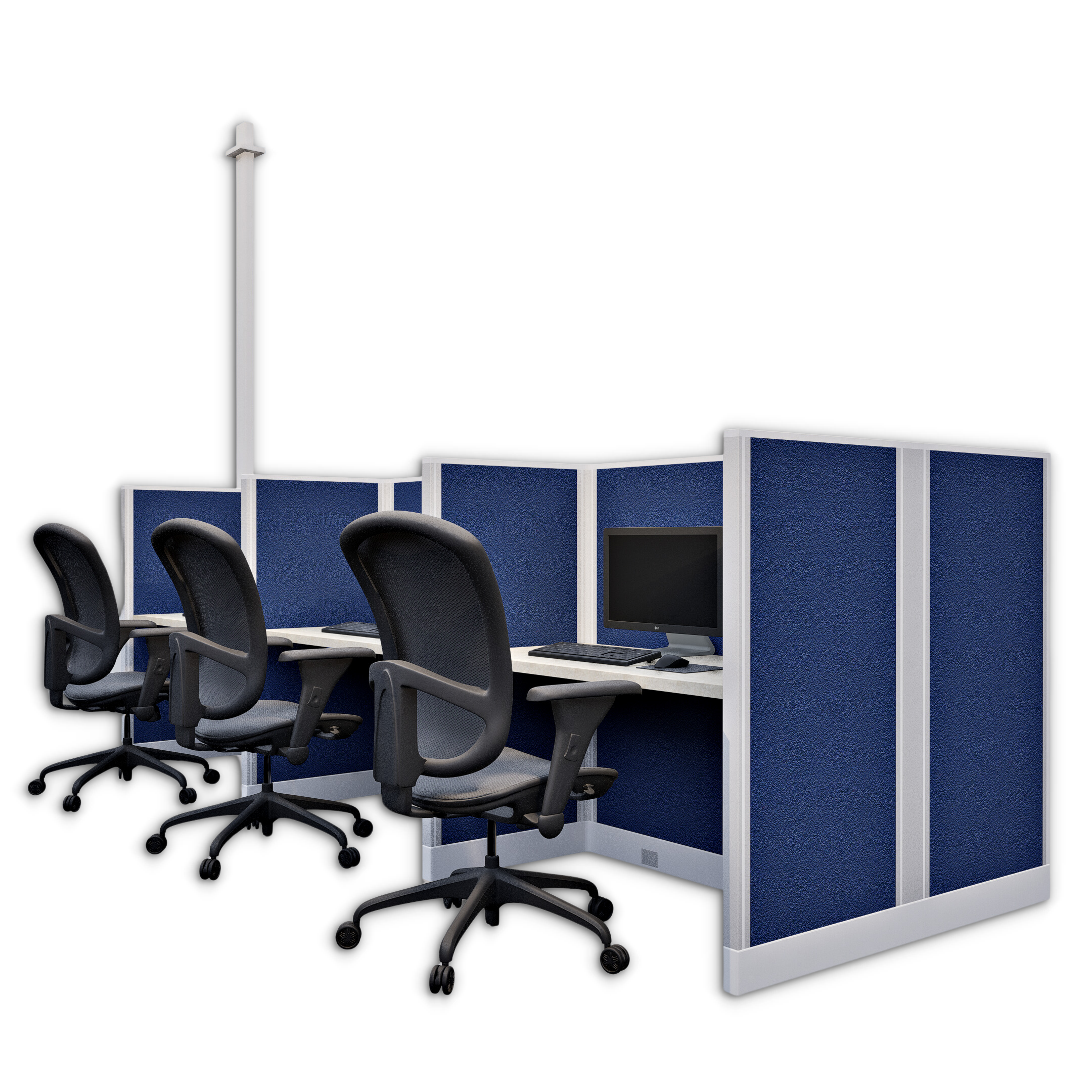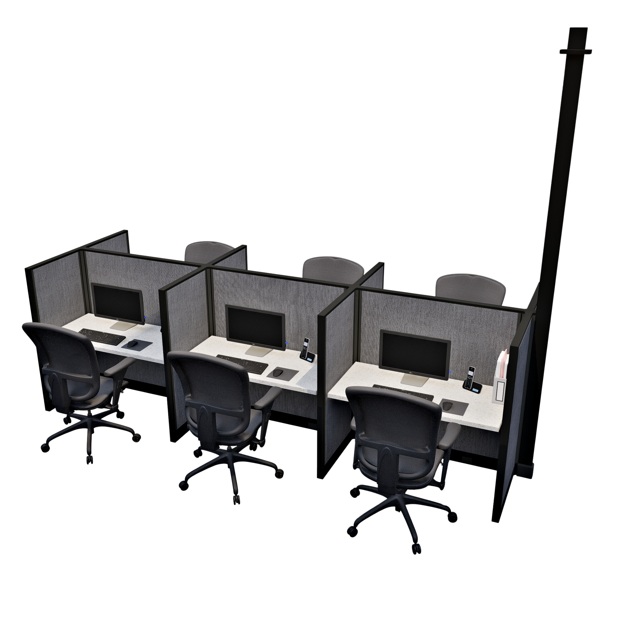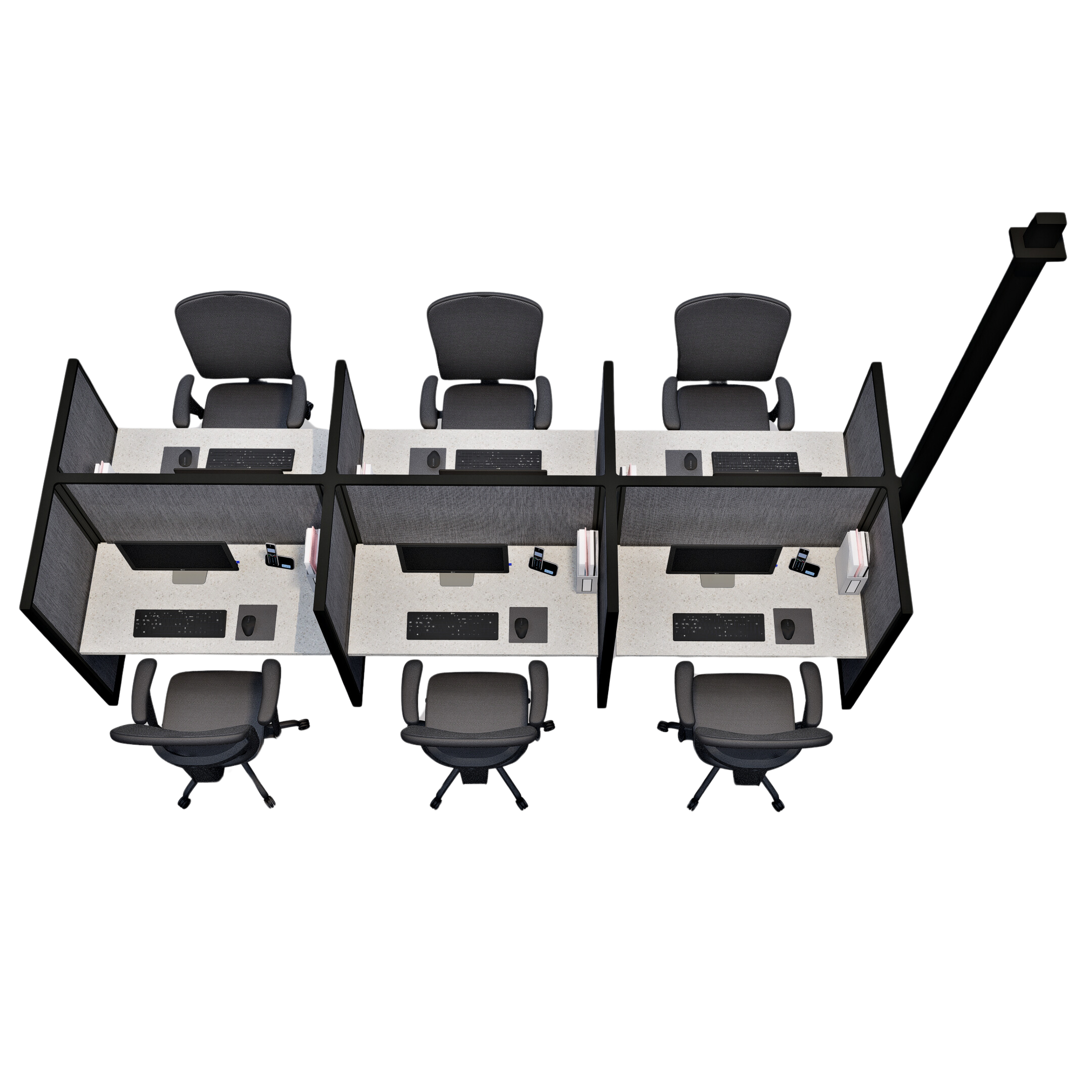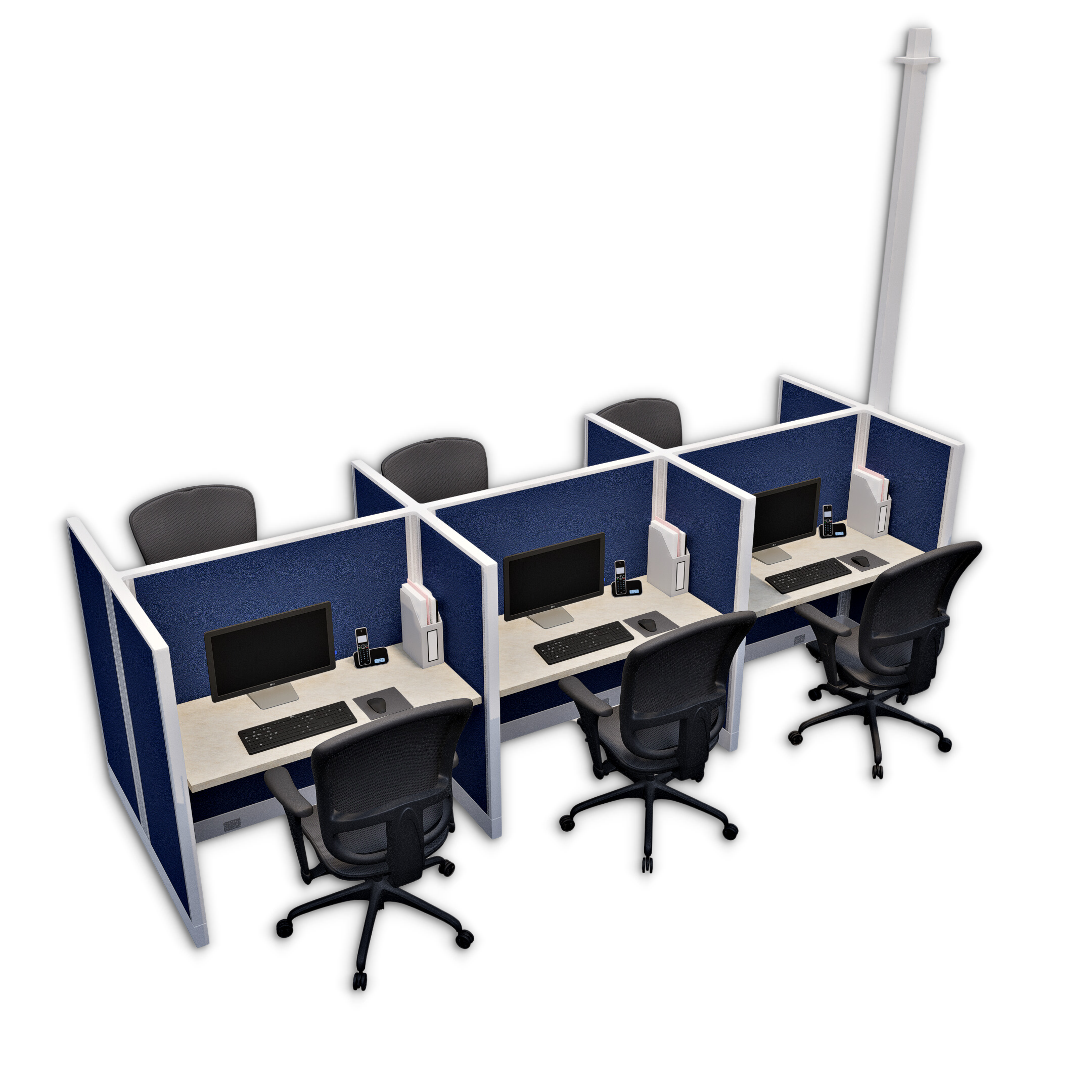 This pod of six 53-inch tall call center cubicles, each measuring 4 by 2 feet, is designed for efficient use of space in an open office layout. Featuring a ceiling power feed, these cubicles can be placed in the center of a room without the need for wall outlets, making them highly adaptable. Each station provides individual privacy while still allowing clear visibility for supervisors. Ideal for call centers, this configuration supports high productivity, collaboration, and flexibility in the office environment.