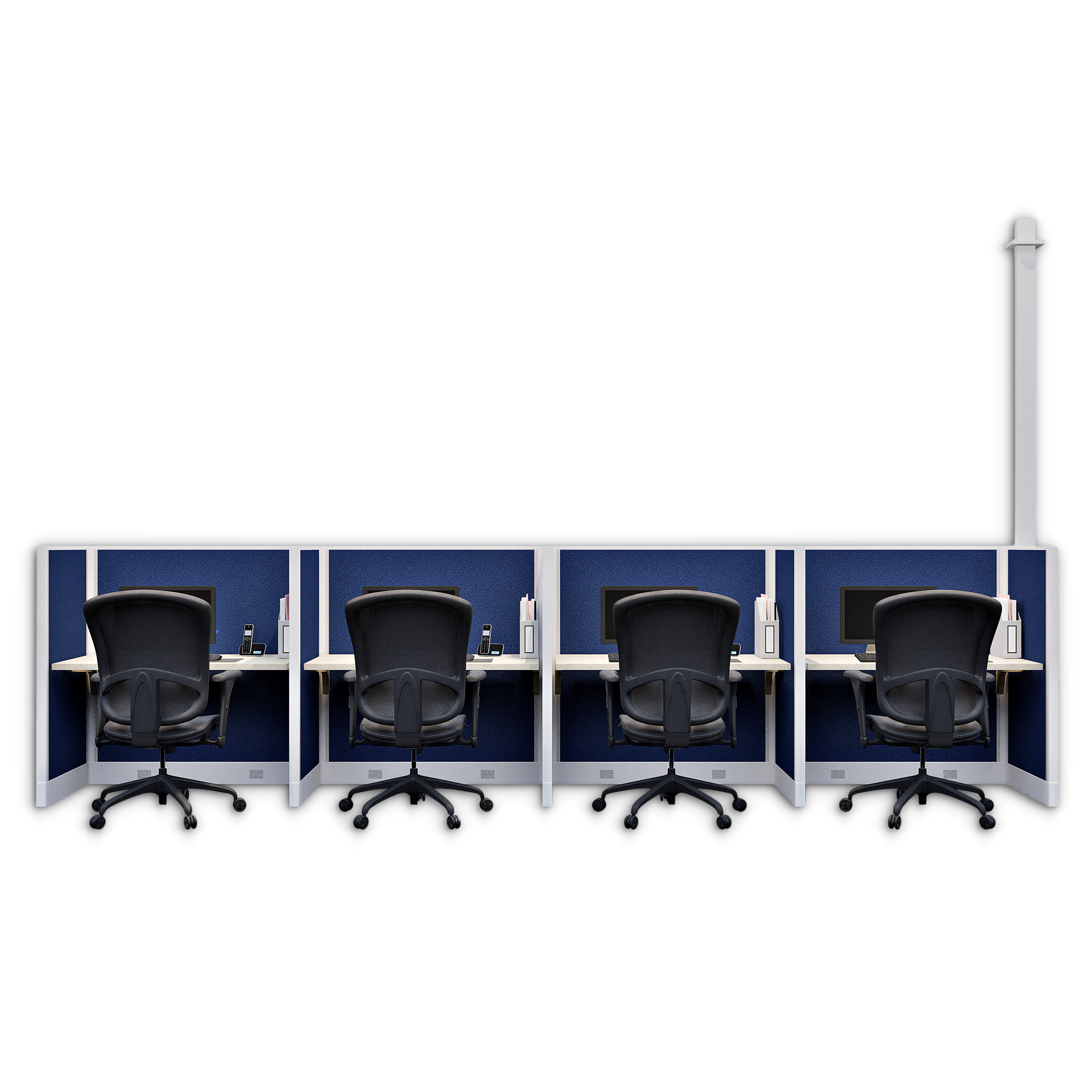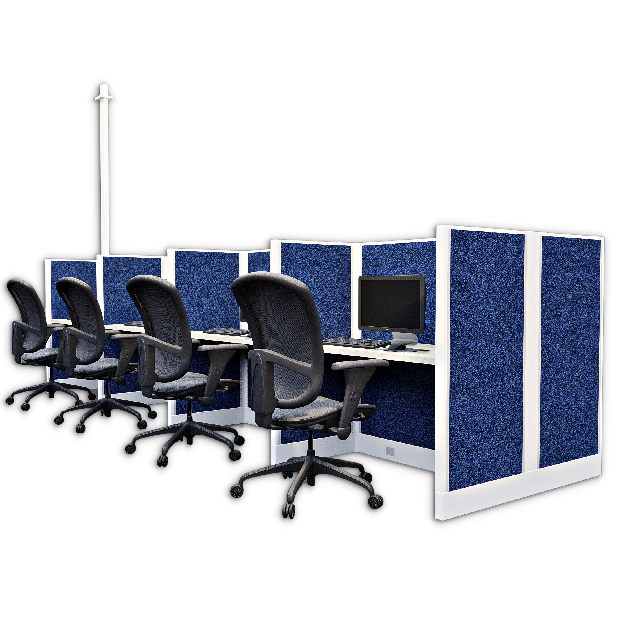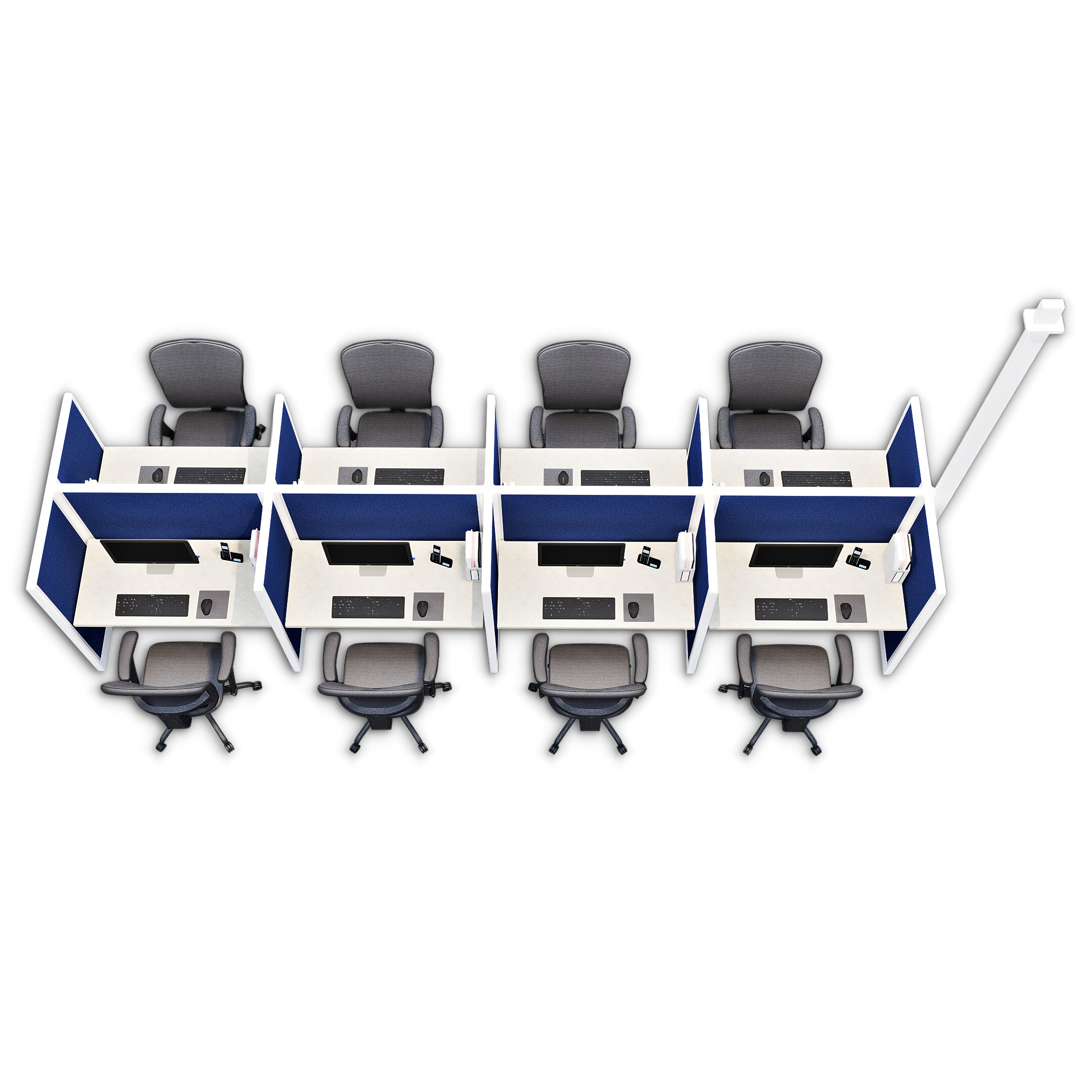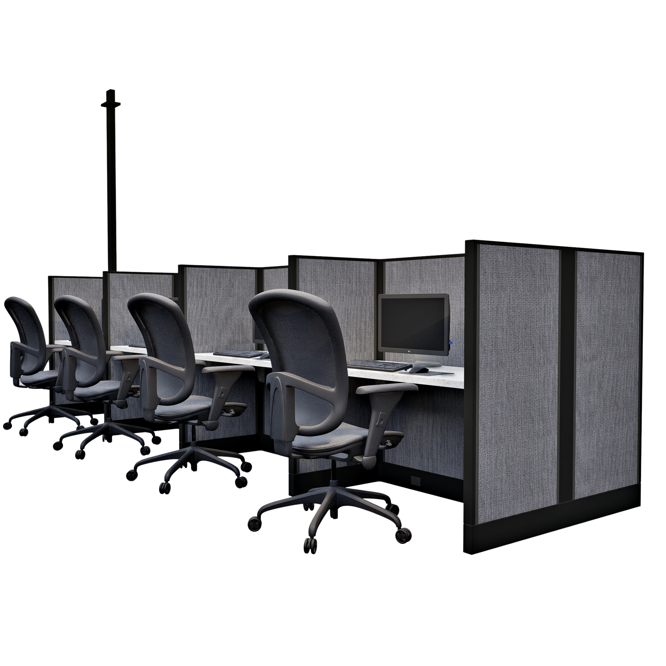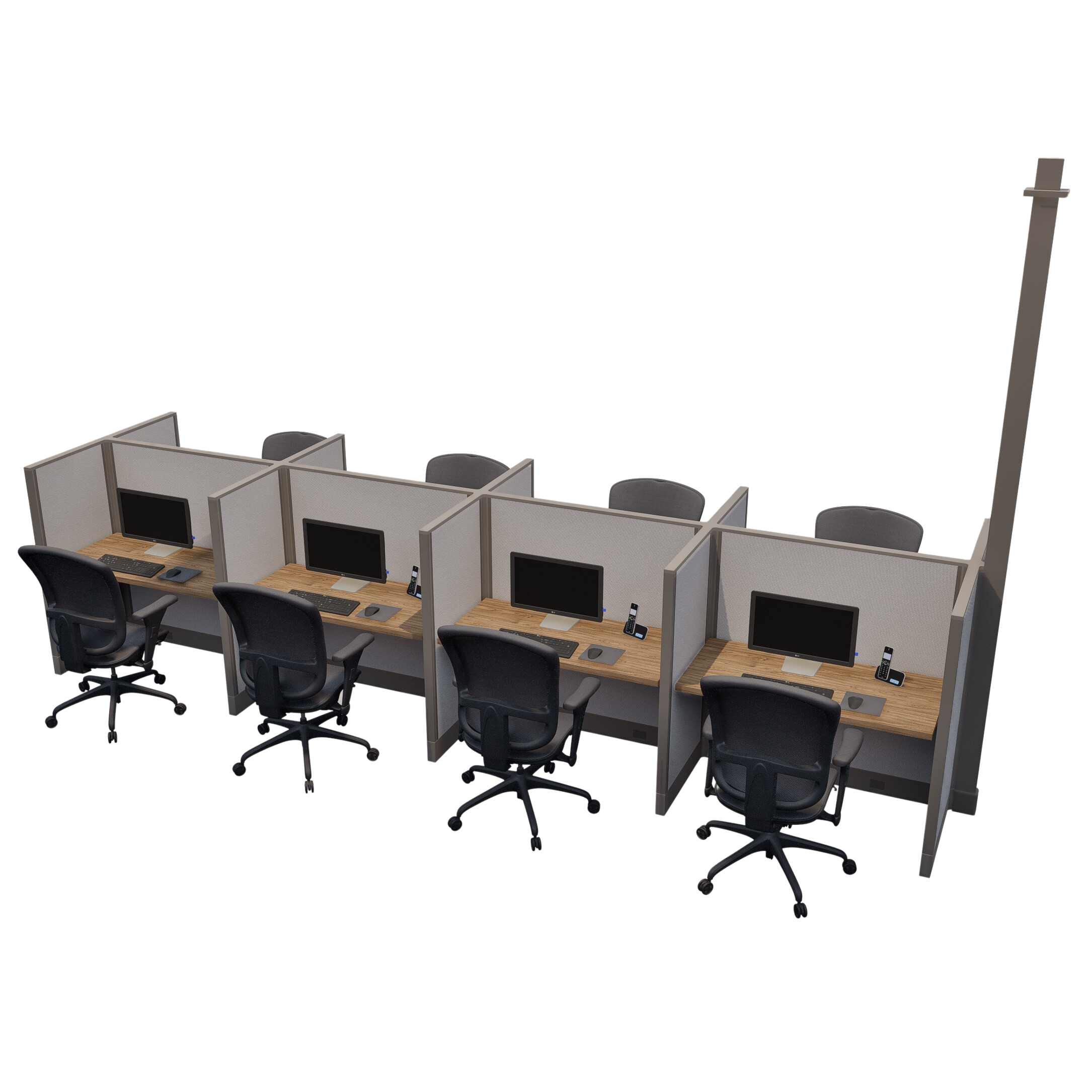 This pod of eight 53-inch tall call center cubicles, each measuring 4 by 2 feet, is designed for optimal space efficiency and flexibility in an open office layout. Equipped with a ceiling power feed, these cubicles can be placed centrally within a room without relying on wall outlets. The compact design ensures individual privacy while allowing supervisors clear visibility over the entire pod. Perfect for call centers, this configuration supports a productive and collaborative environment, maximizing space while maintaining accessibility and ease of movement.