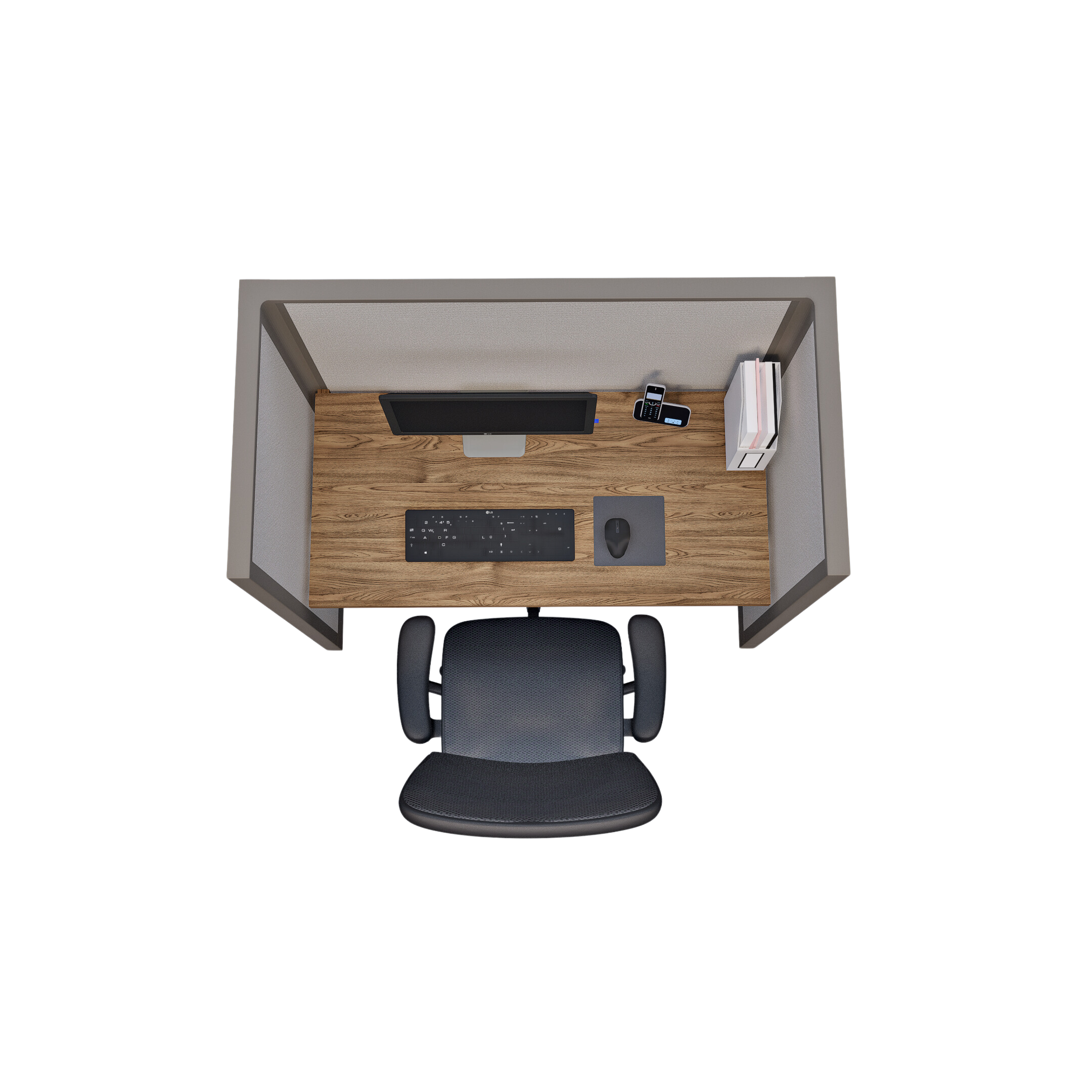 This 53-inch tall single call center cubicle, measuring 4 by 2 feet, is designed with a compact and streamlined layout to maximize efficiency. With no pedestal or overhead storage, this minimalist setup provides an individual workstation focused on essential privacy while still allowing clear visual access for supervisors. Ideal for call centers or high-activity offices, this configuration promotes productivity, offering the perfect balance between privacy and oversight in a busy work environment.