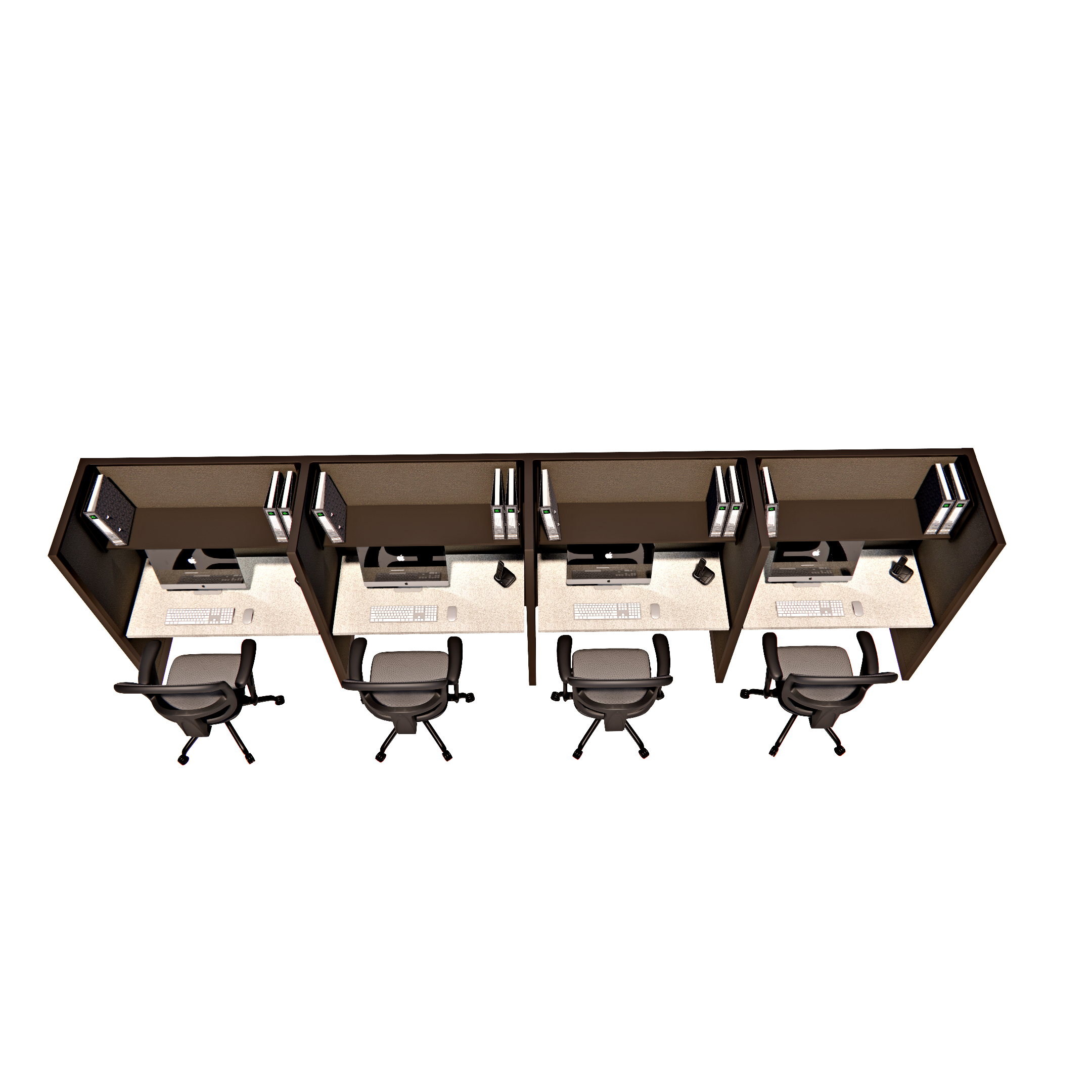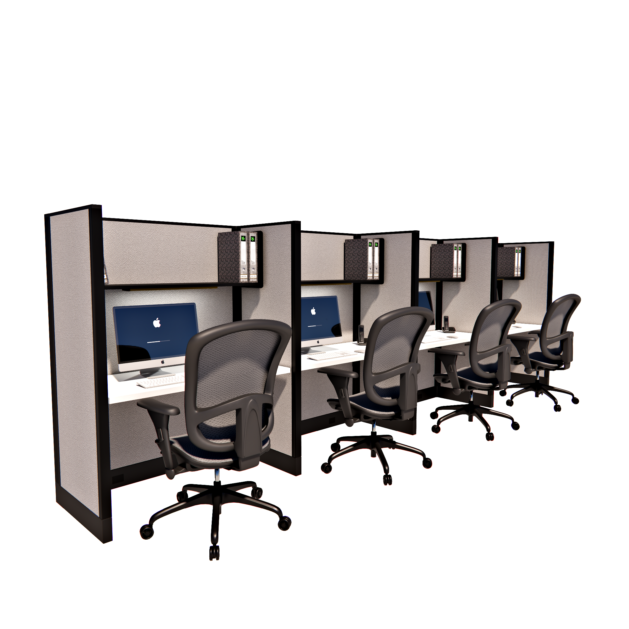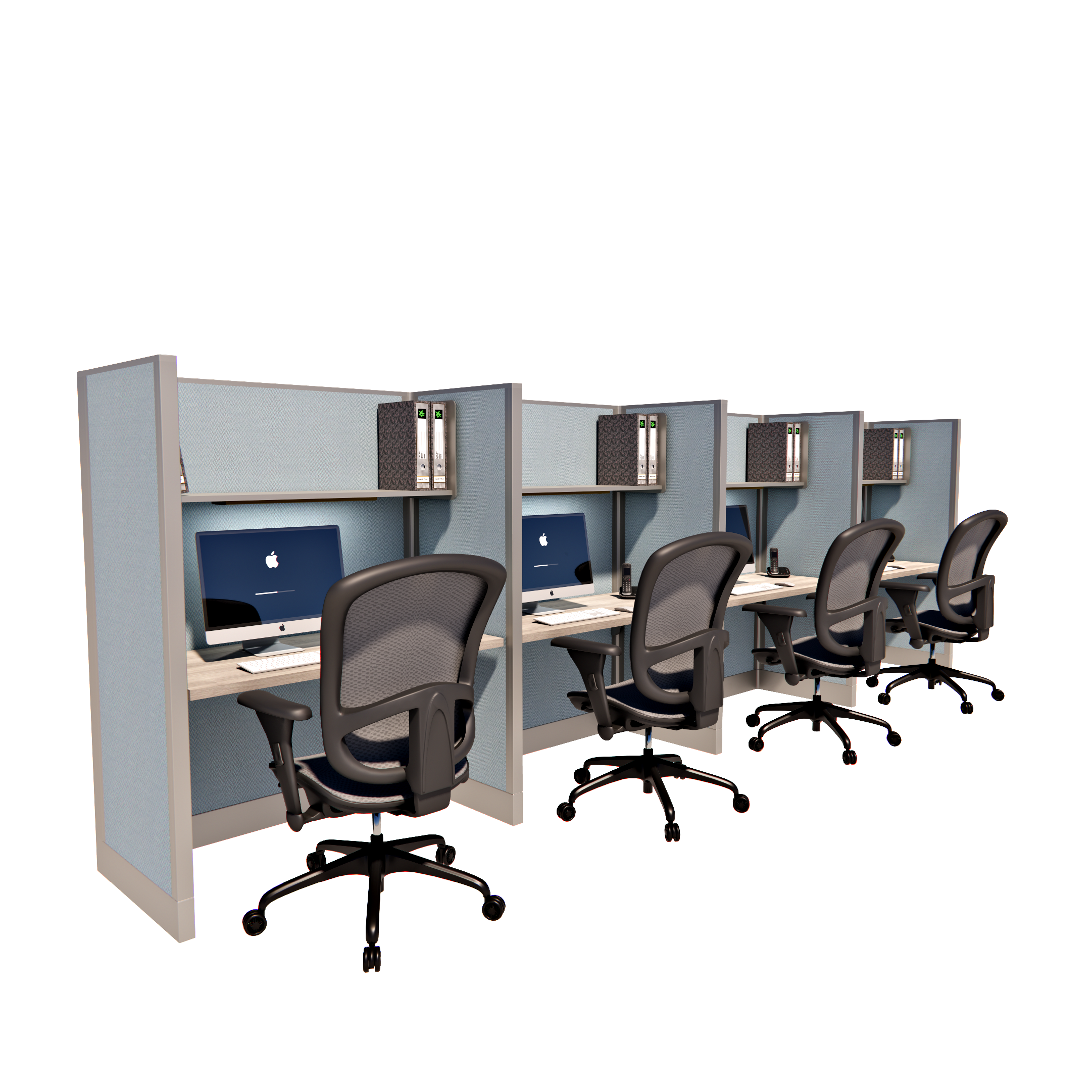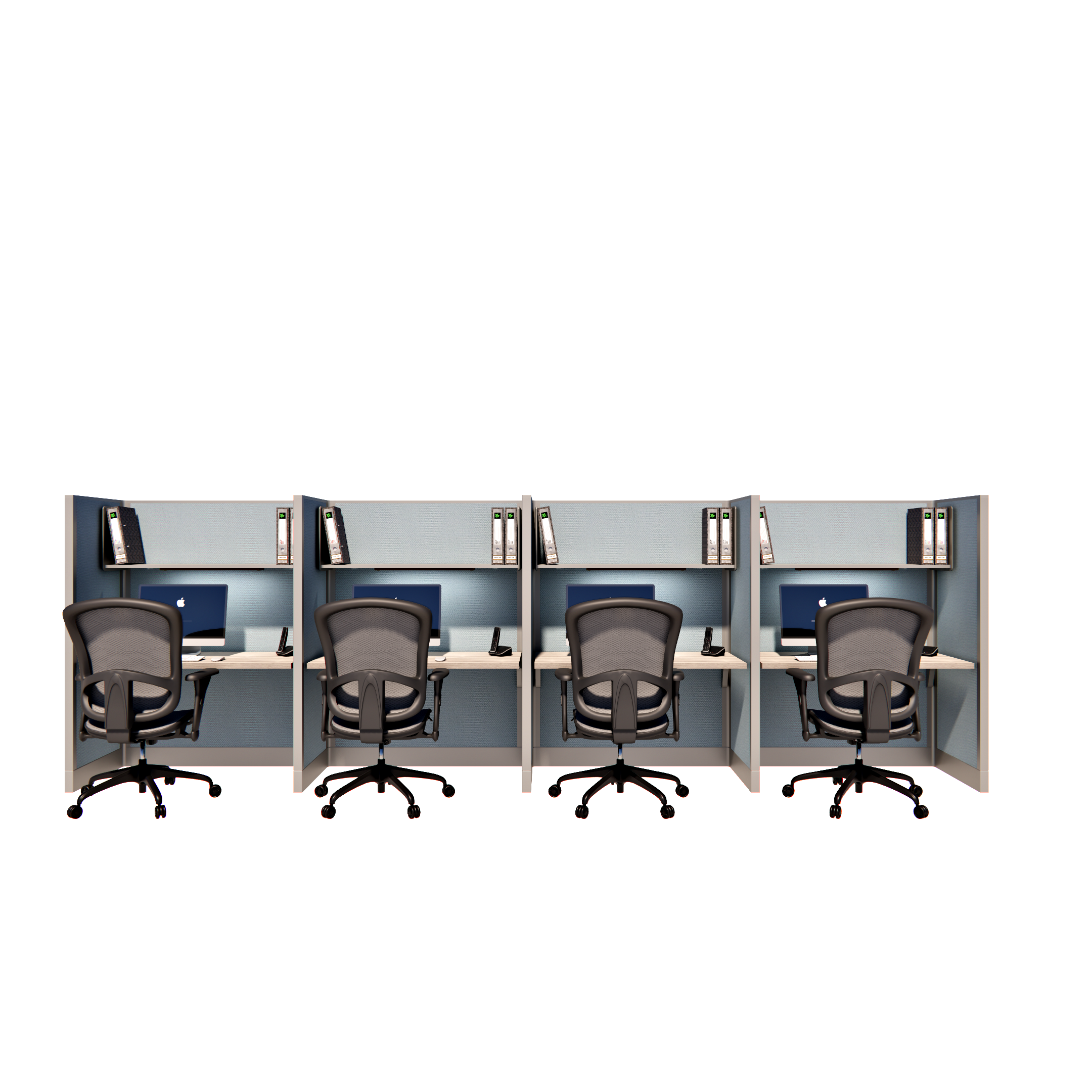 This line of four 67-inch tall 4′ x 2′ call center cubicles is designed to provide a functional and organized workspace while maximizing floor space. The 67-inch height offers a good balance of privacy and openness, allowing for easy supervision while maintaining individual workspaces. Each cubicle is equipped with an LED tasklight for optimal lighting and a shelf for additional storage, keeping essential materials within reach. This configuration is ideal for call centers or offices that need an efficient, space-saving layout with added features to enhance productivity and organization.