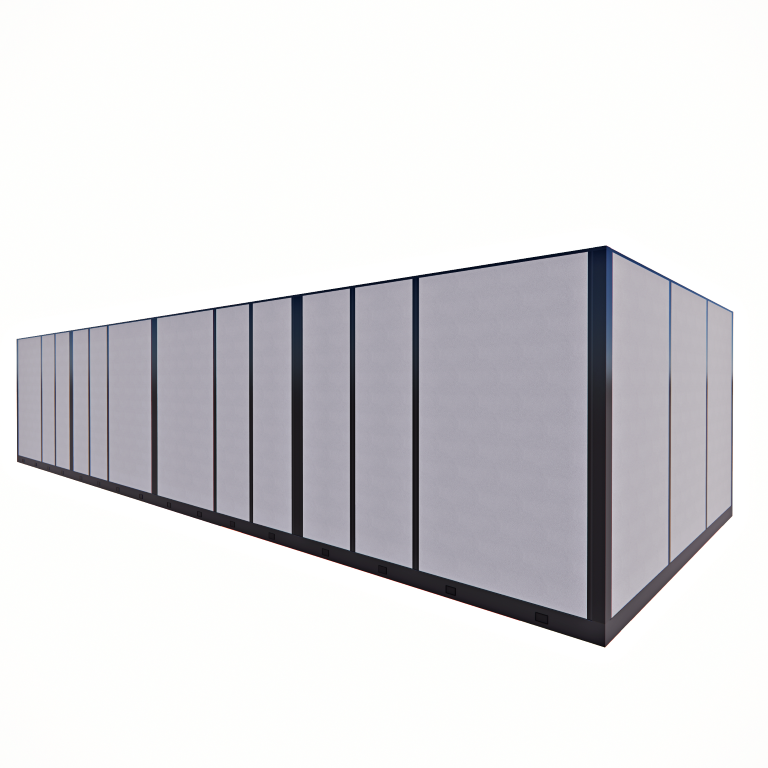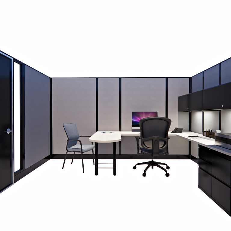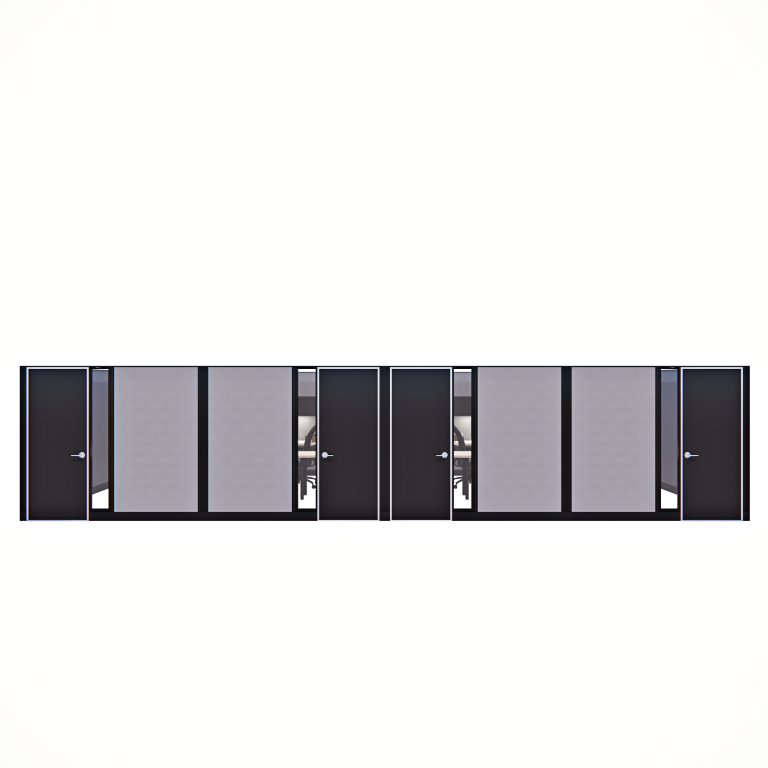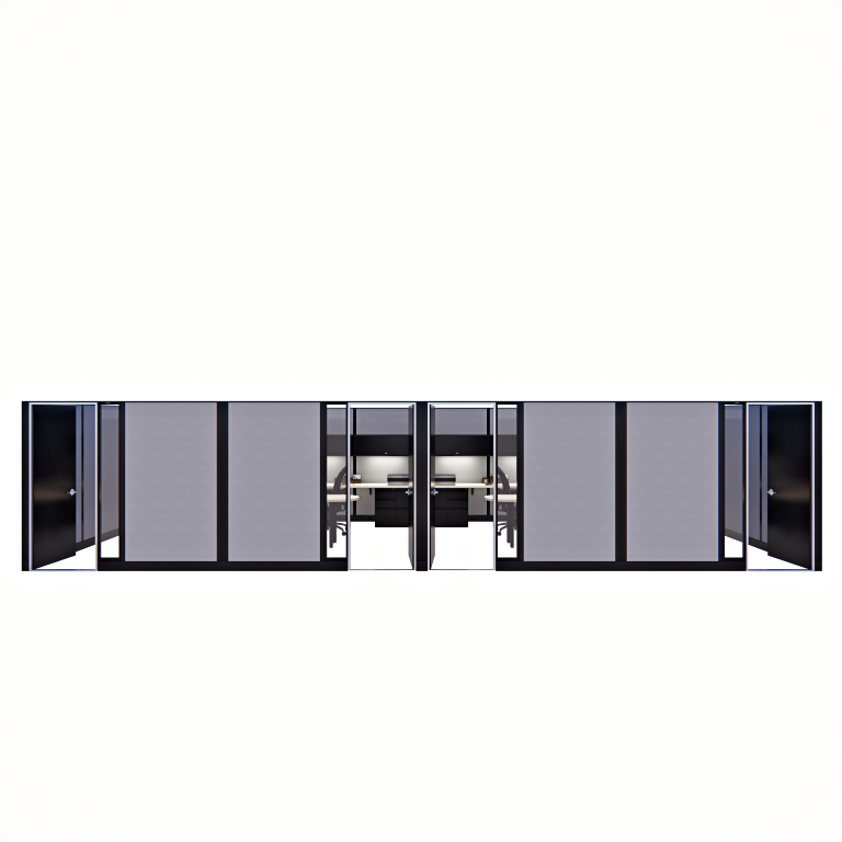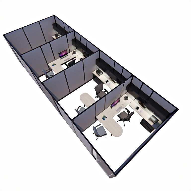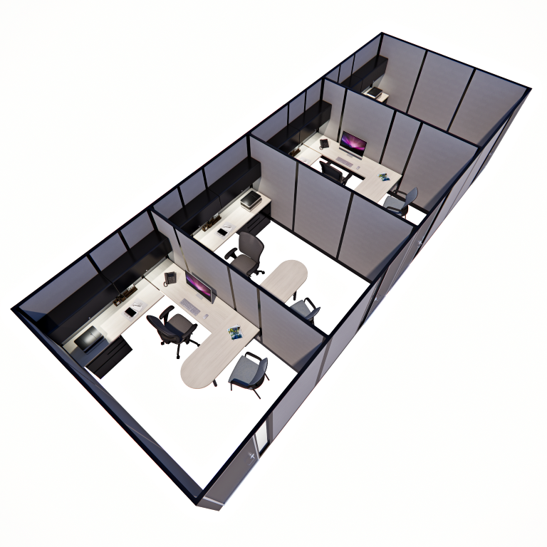 Optimize your office layout with our 85″ tall, 8′ x 12′ Private Offices, arranged in a line of four. Each office provides complete privacy with locking doors and full-height panels, offering a quiet and secure environment. This configuration is perfect for mid-sized teams who need dedicated, private spaces to focus and work effectively.