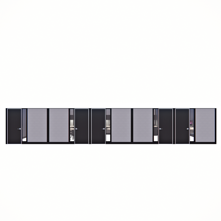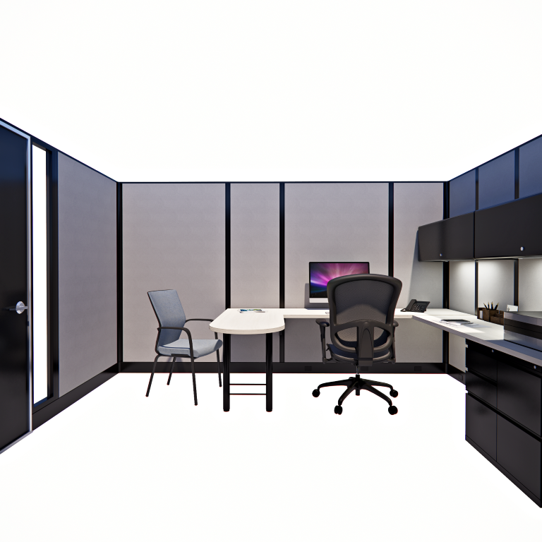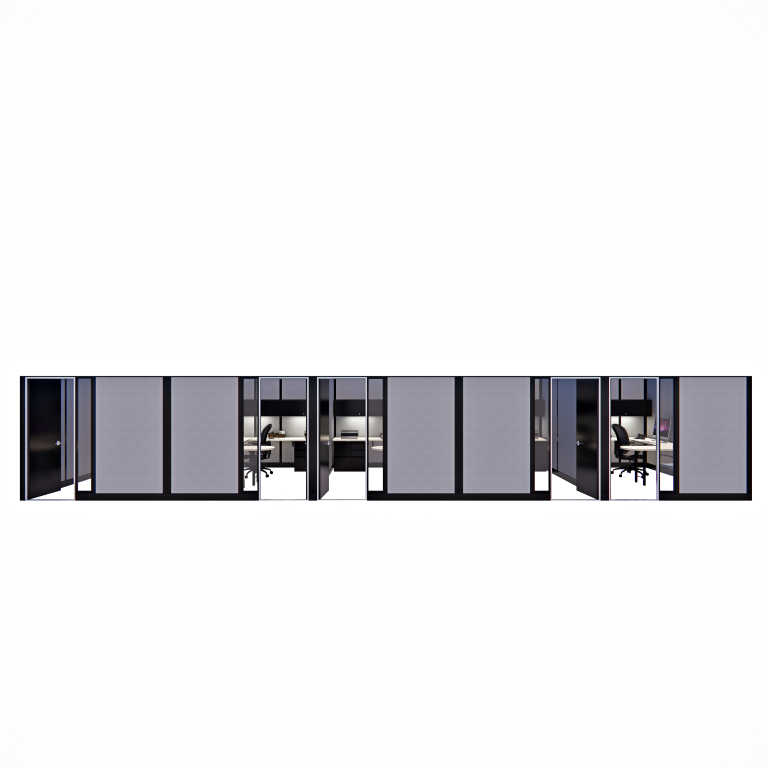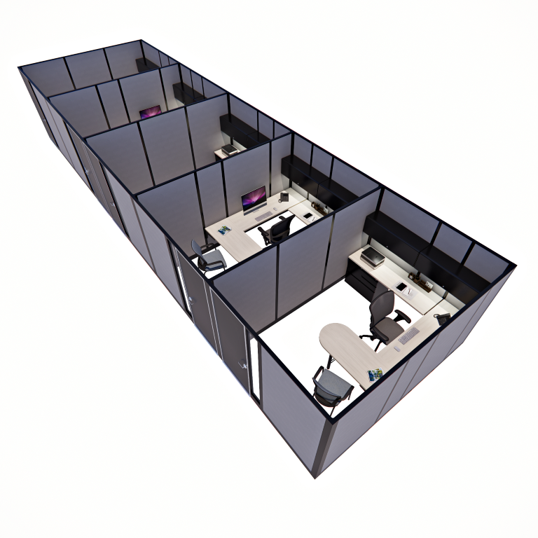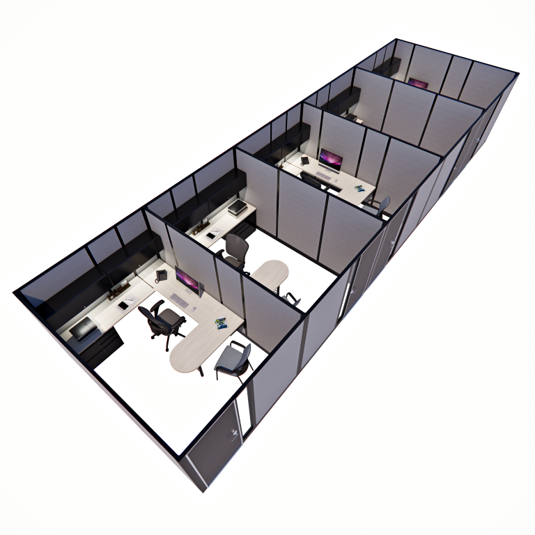 Maximize workspace efficiency with our 85″ tall, 8′ x 12′ Private Offices, arranged in a line of five. Designed for larger teams, each office includes a locking door and full-height panels, ensuring privacy and professionalism. This setup is perfect for creating a streamlined, secure, and productive office environment.