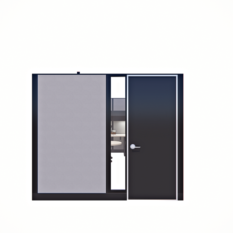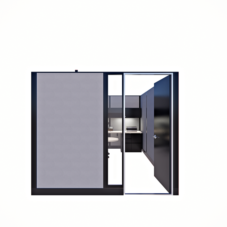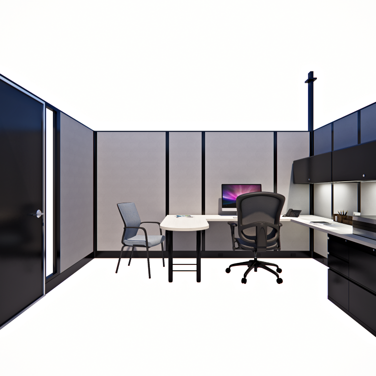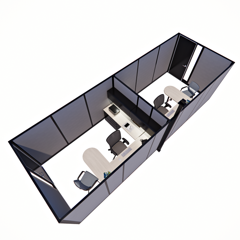 Our 85″ tall, 8′ x 12′ Private Offices, arranged in a pod of two, are ideal for close collaboration or paired workspaces. Each office features a locking door and full-height panels for privacy and security. This compact yet functional layout promotes productivity while maintaining a sleek, professional look.