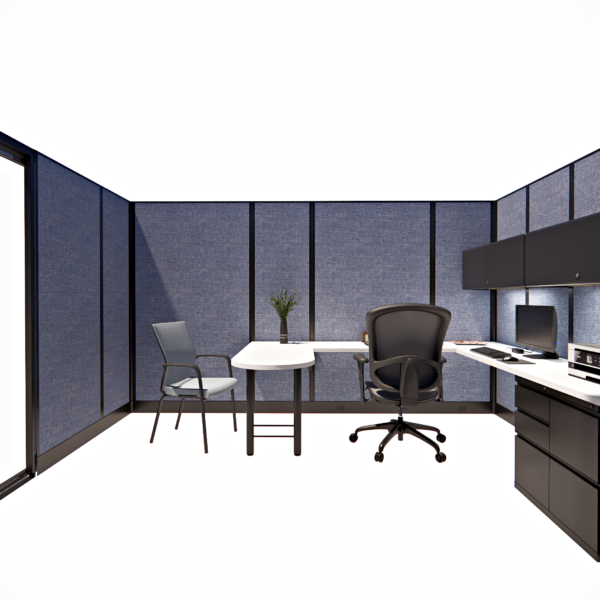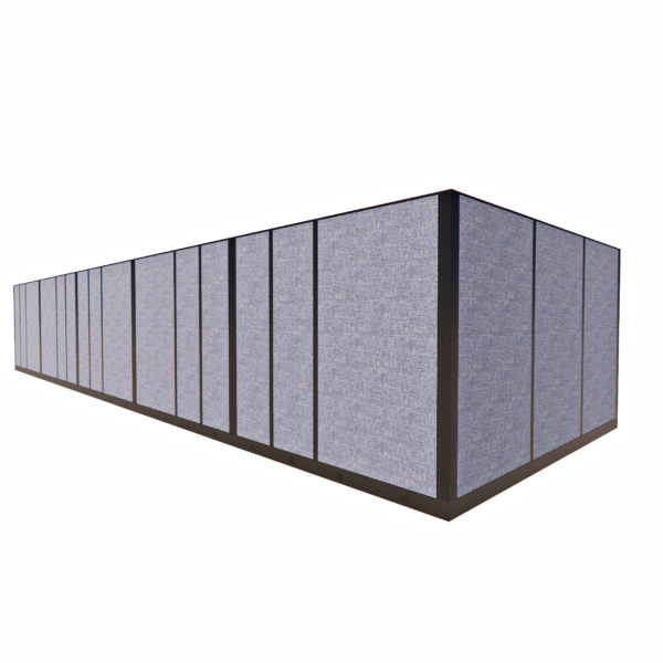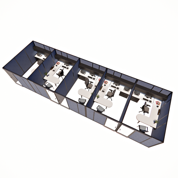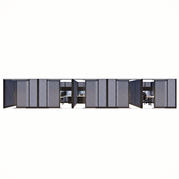 This line of five 85-inch tall private office cubicles, each measuring 8 by 12 feet, provides a spacious and professional environment for individual workstations. Each cubicle features a sliding glass door, offering easy access while maintaining a sleek, modern aesthetic. The 85-inch height ensures privacy and creates a quiet, enclosed space conducive to productivity. Perfect for offices that require a balance of openness and seclusion, this configuration maximizes space efficiency with sliding doors, while offering both privacy and visibility for a contemporary and functional workspace layout.