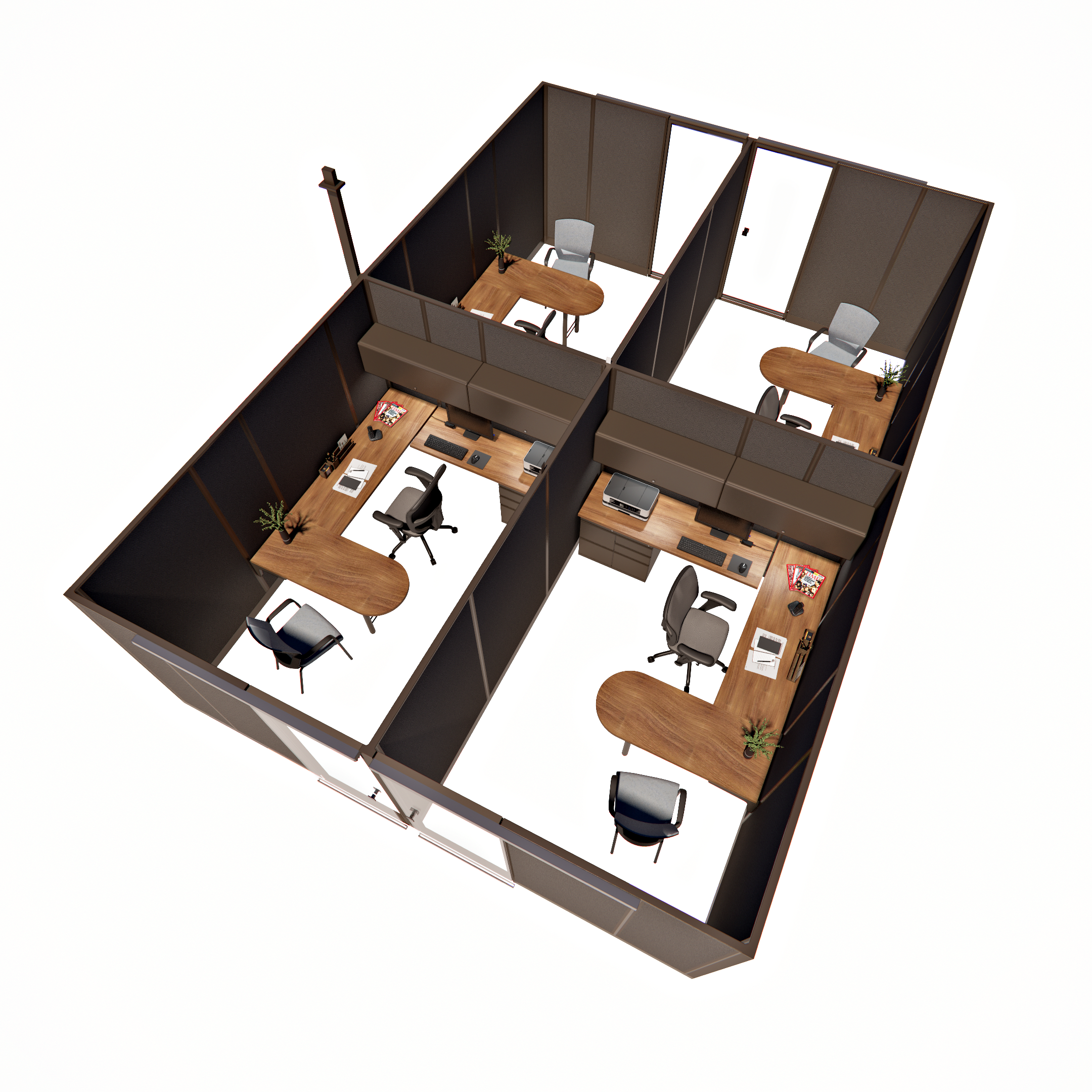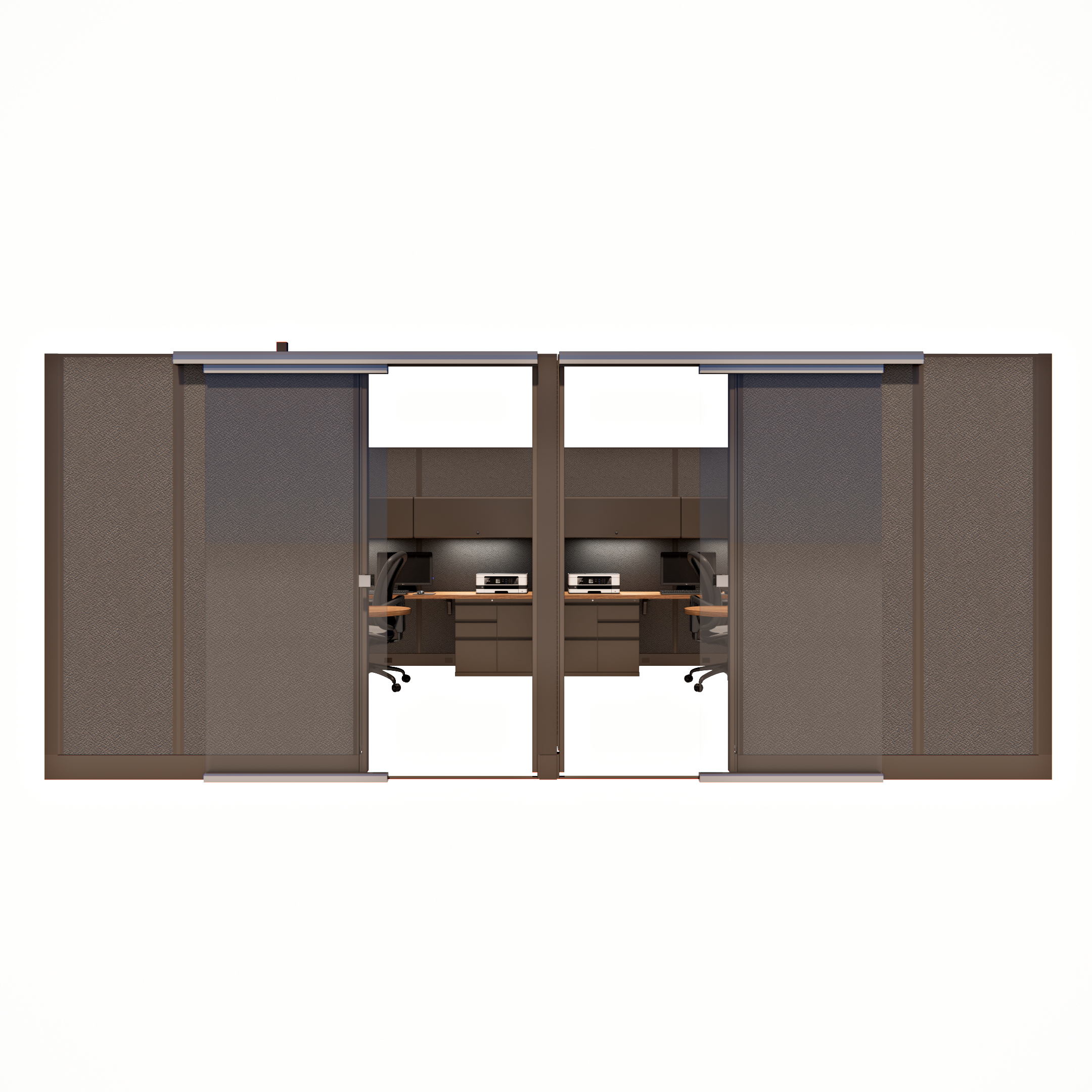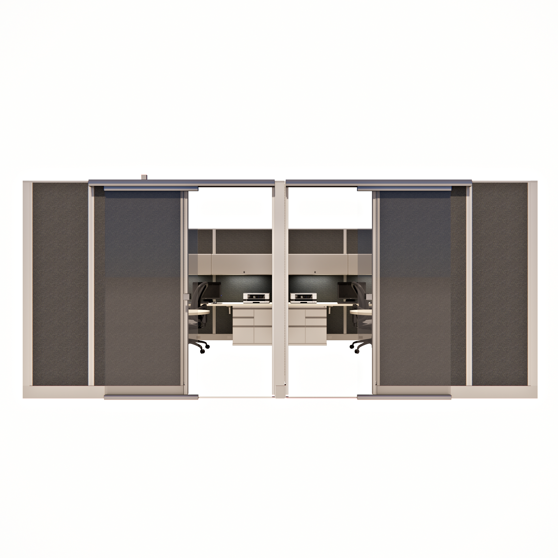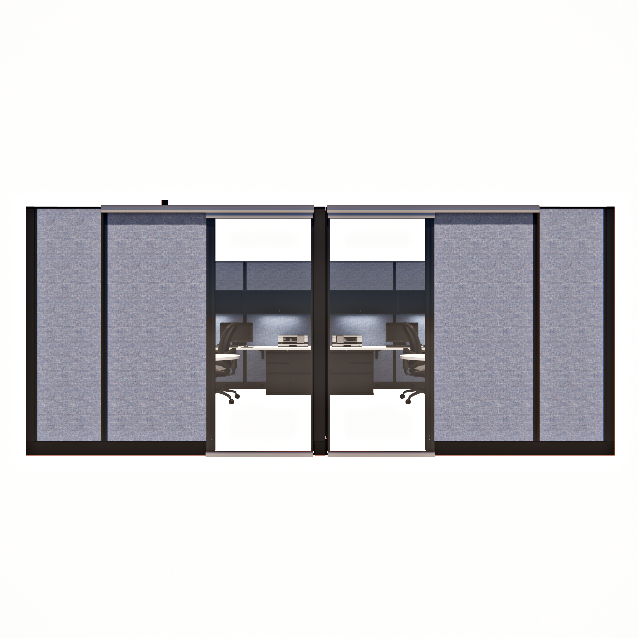 This pod of four 85-inch tall private office cubicles, each measuring 8 by 12 feet, offers a spacious and professional work environment. Each cubicle is equipped with a sliding glass door, providing easy access while maintaining a sleek, modern aesthetic. The 85-inch height ensures ample privacy and creates an enclosed, quiet space ideal for focused work. Perfect for offices needing multiple individual workspaces, this configuration combines functionality with style, utilizing space-saving sliding glass doors to enhance both accessibility and privacy in a contemporary office layout.