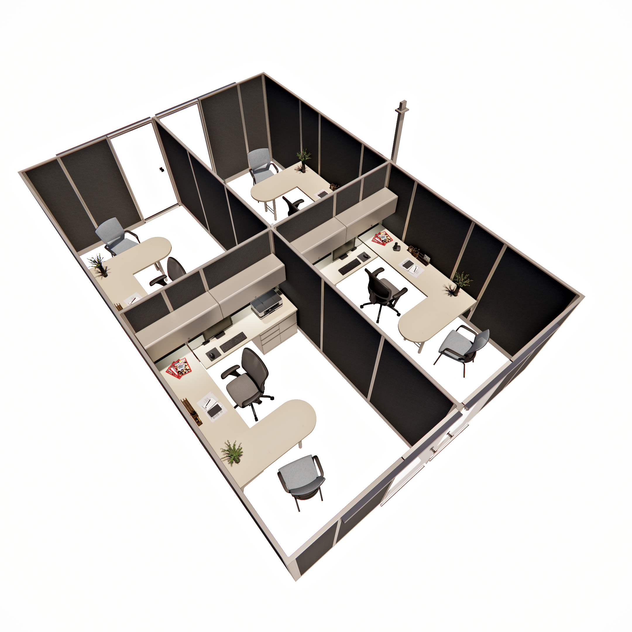 This is a standard cubicle configuration available in any quantity, with a combination of configurations and heights. They can be customized and modified to perfectly suit your space and specific needs. We offer discounts; options can be added or removed to accommodate your budget. Standard configurations provide a clear cost, while a space plan delivers a tailored solution.