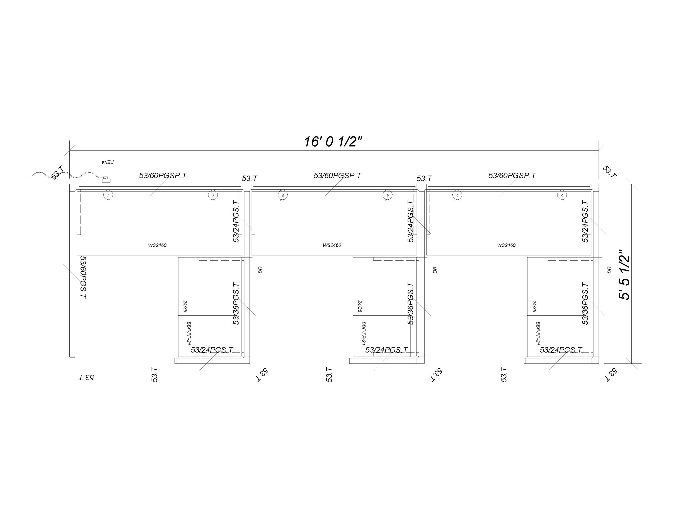 53″ Tall 5’x 5′ Line Of 3 Office Cubicles with Glass