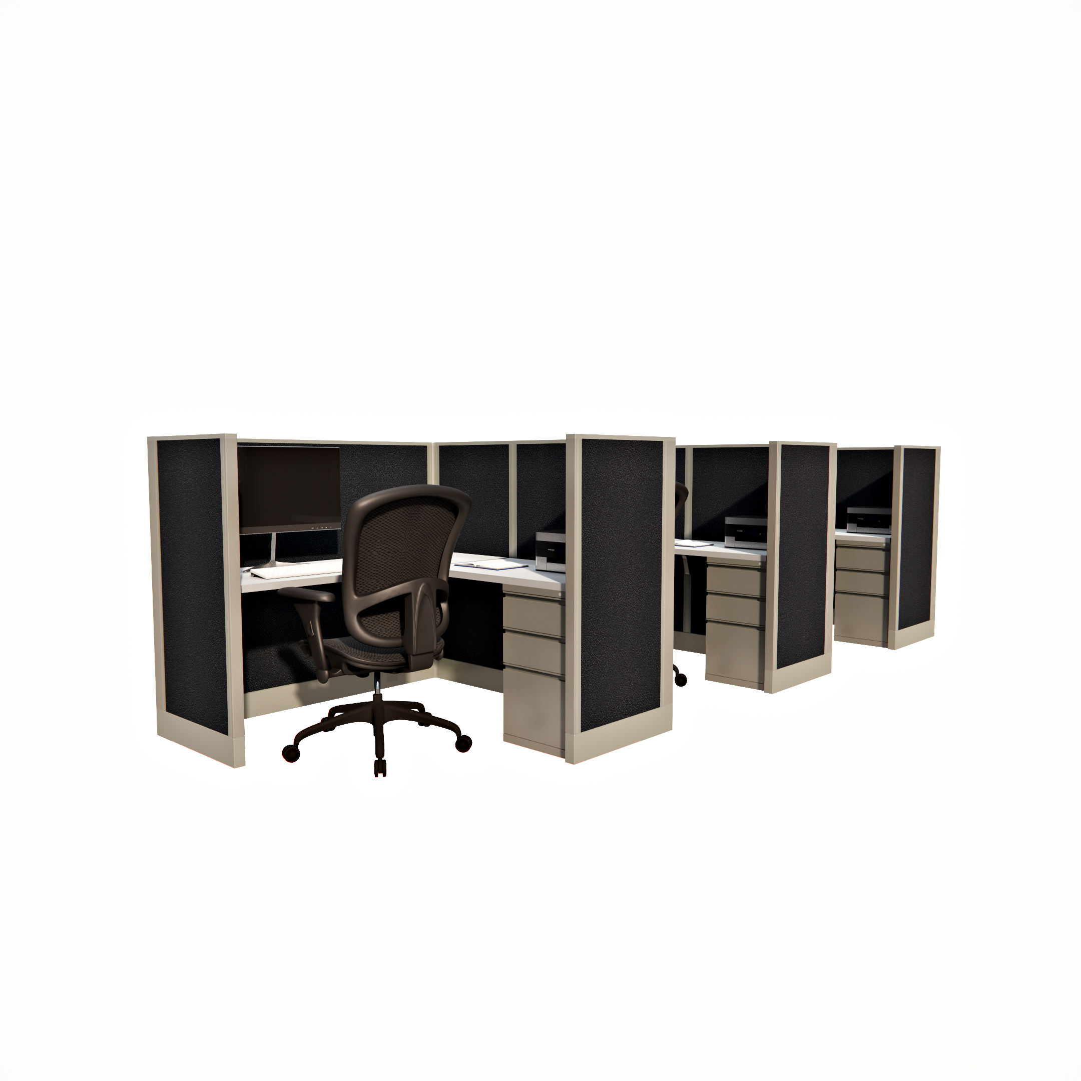 This is a standard cubicle configuration available in any quantity, with a combination of configurations and heights. They can be customized and modified to perfectly suit your space and specific needs. We offer discounts; options can be added or removed to accommodate your budget. Standard configurations provide a clear cost, while a space plan delivers a tailored solution.