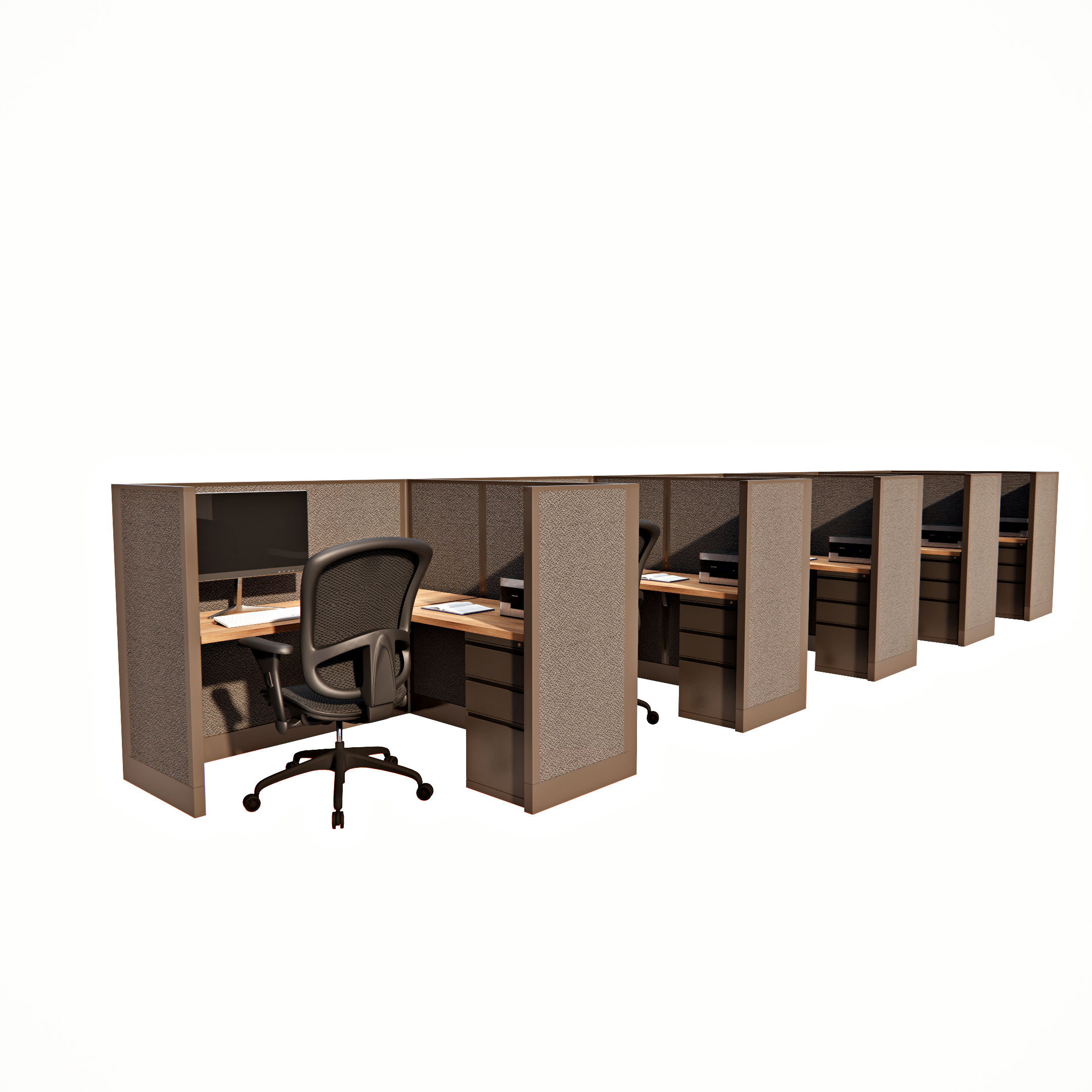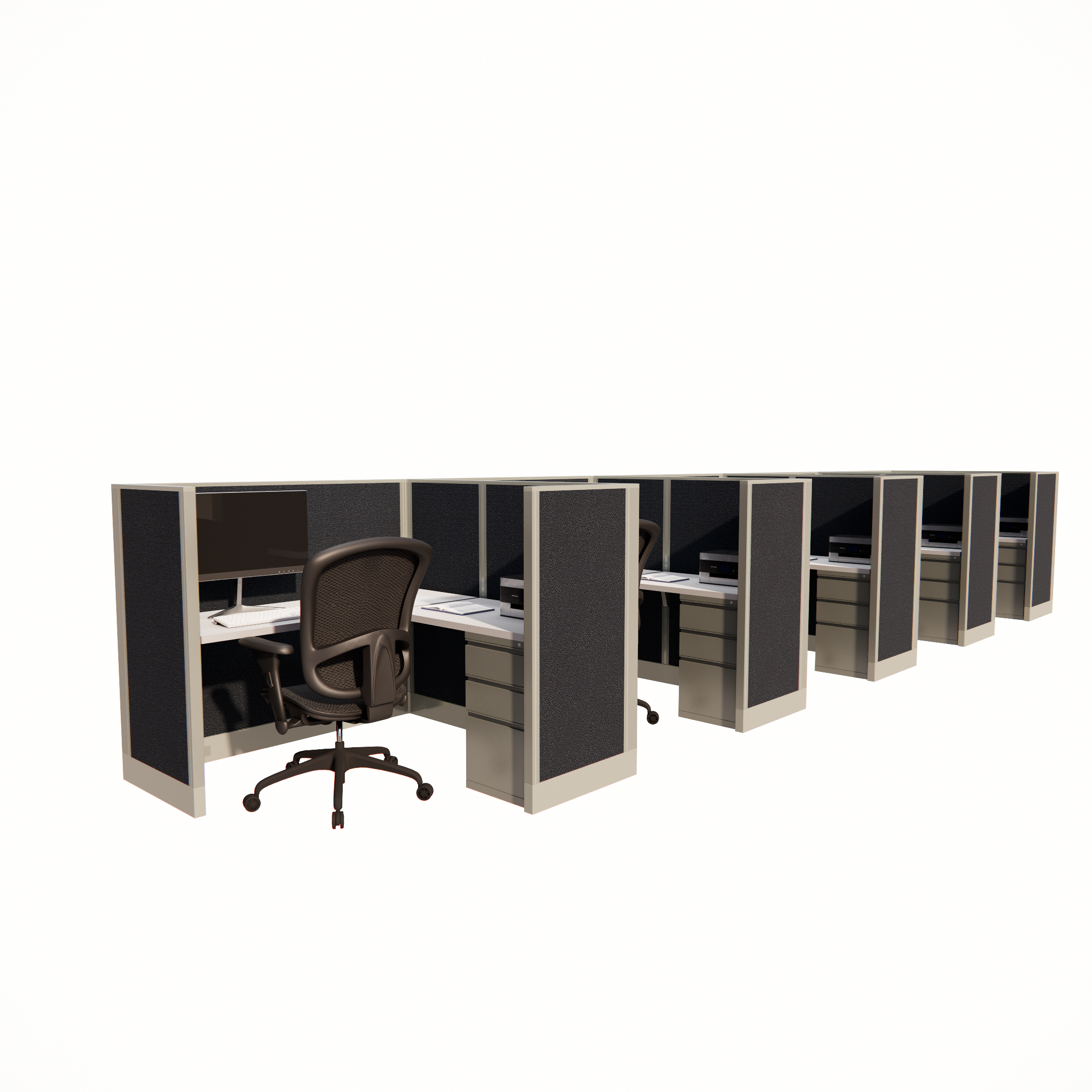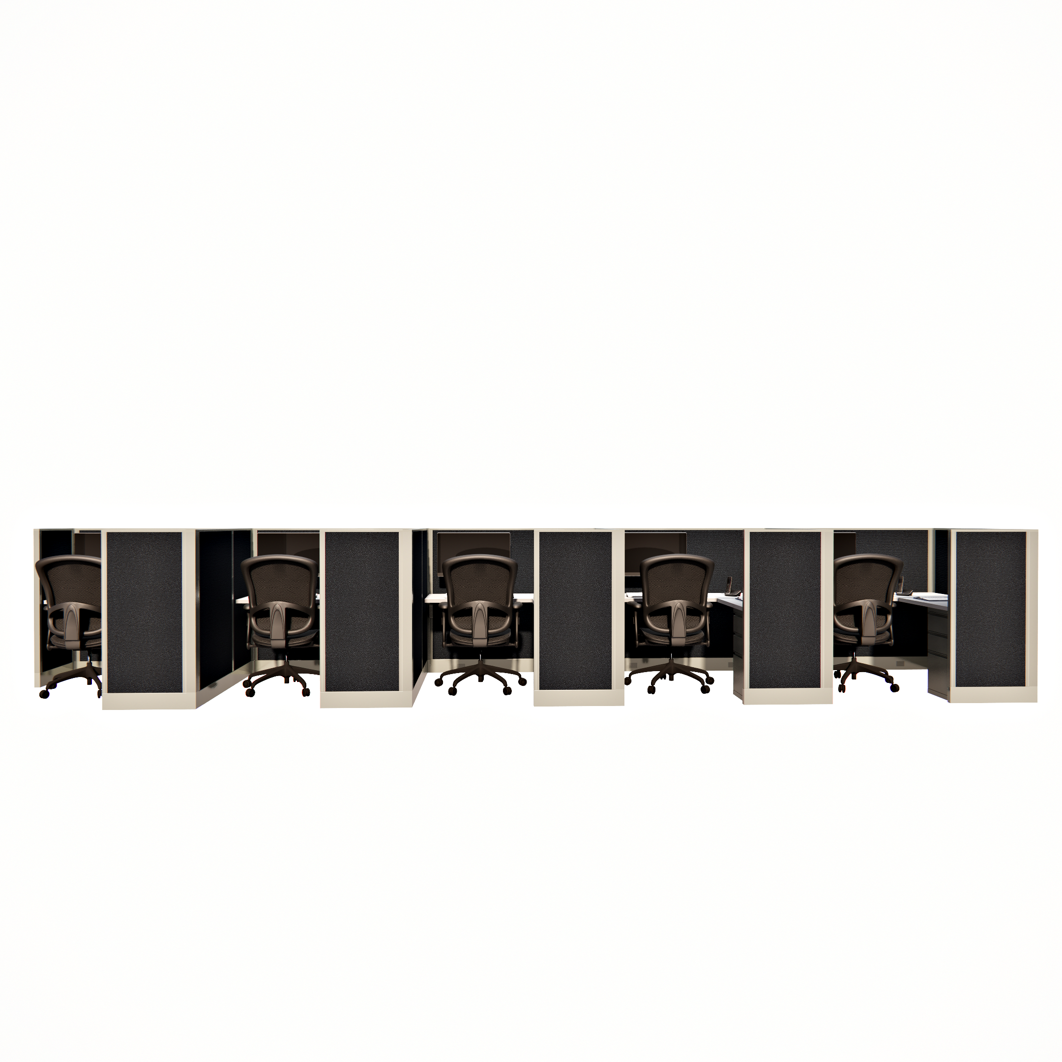 This line of five 5’x5′ office cubicles, standing at 53″ tall, is a highly functional setup for larger teams that need both individual focus and a collaborative environment. Each cubicle features fabric panels that aid in noise reduction and sleek, durable laminate worksurfaces that add a modern touch to the workspace. The integrated power modules provide convenient access to charging and connectivity, making this configuration ideal for teams that value efficiency and organization in a shared yet structured space.