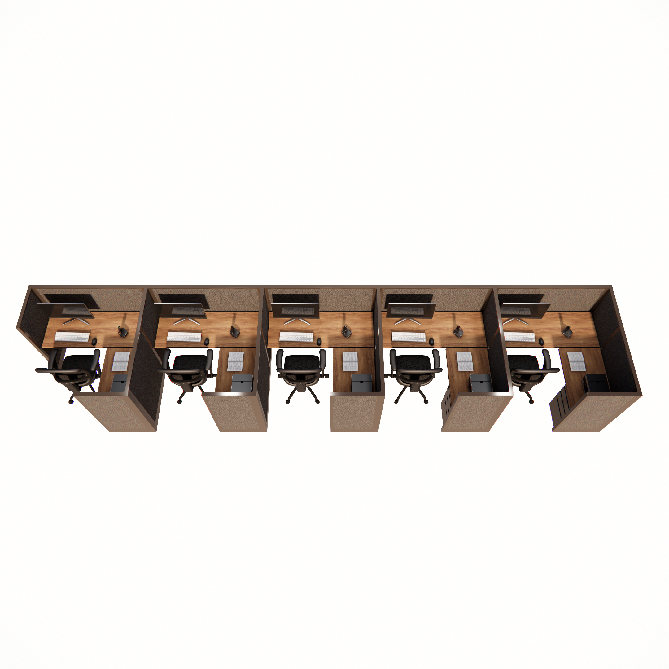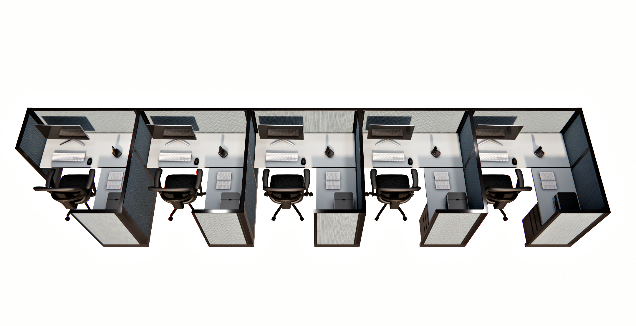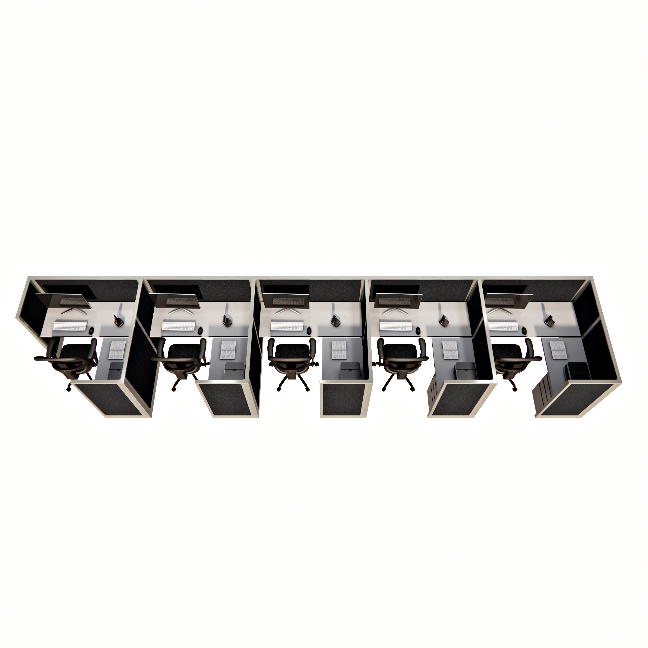 This line of five 5’x5′ office cubicles, standing at 53″ tall, is a highly functional setup for larger teams that need both individual focus and a collaborative environment. Each cubicle features fabric panels that aid in noise reduction and sleek, durable laminate worksurfaces that add a modern touch to the workspace. The integrated power modules provide convenient access to charging and connectivity, making this configuration ideal for teams that value efficiency and organization in a shared yet structured space.