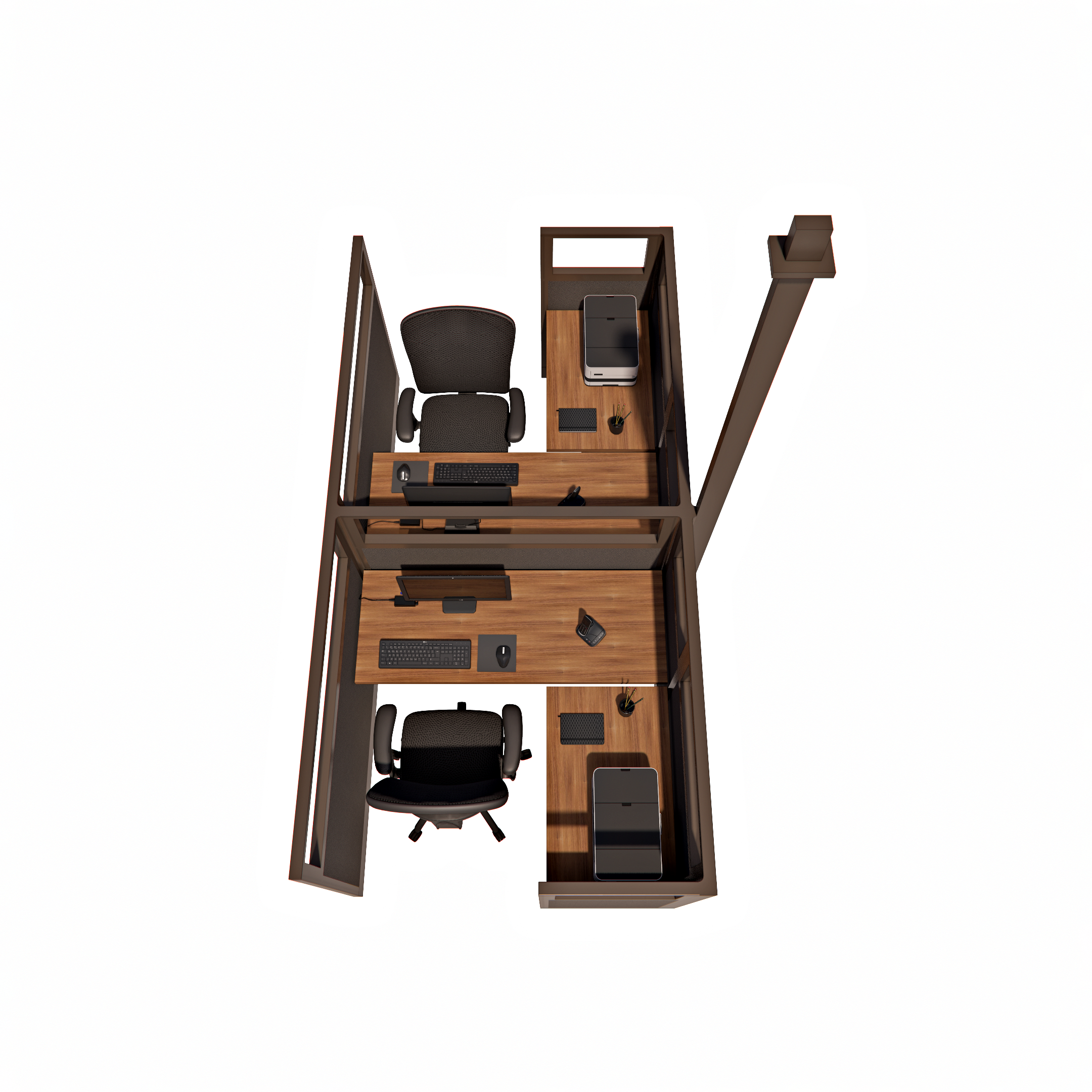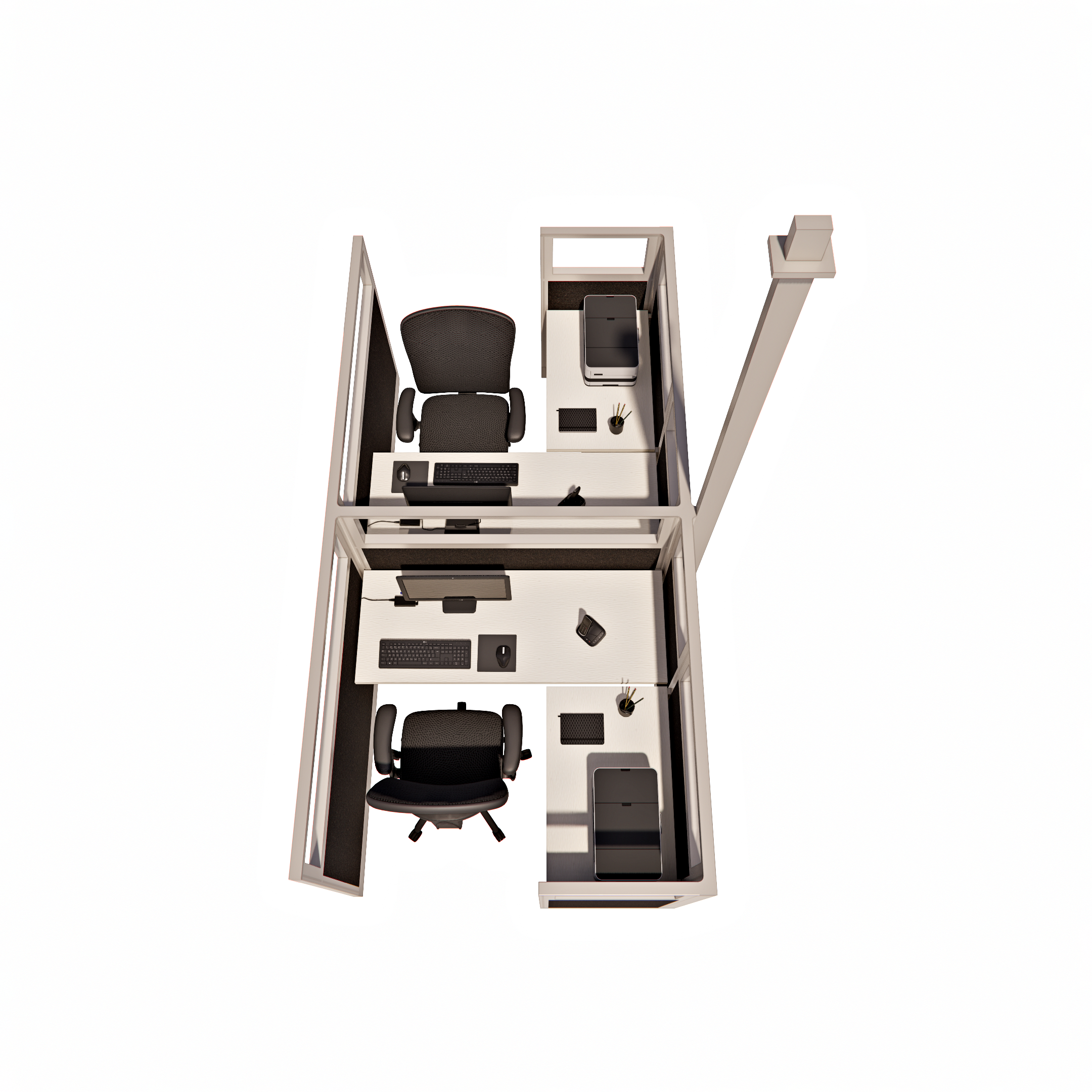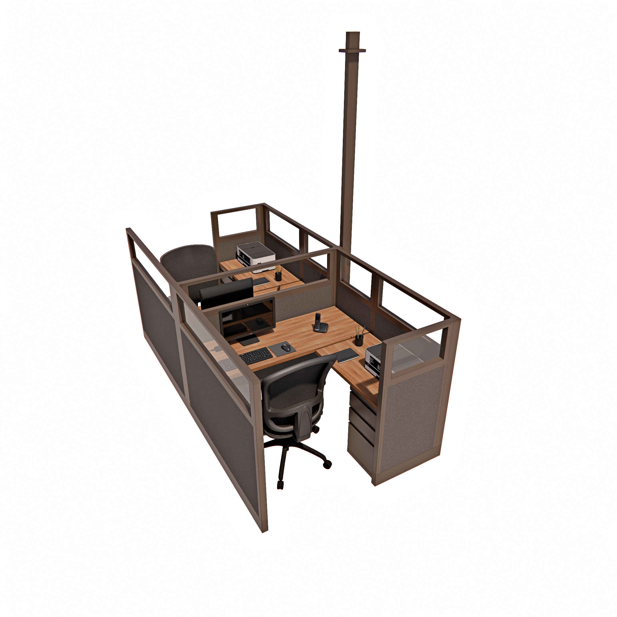 This pod of two 53-inch tall office cubicles, each with a 5 by 5-foot layout, features glass panels that add brightness and openness to the workspace. The glass allows natural light to pass through, creating a more connected and airy feel while still providing individual work areas. This setup is ideal for small teams or pairs who need private workstations but benefit from visibility and proximity. The 53-inch height provides a comfortable level of privacy while fostering an open, collaborative atmosphere.