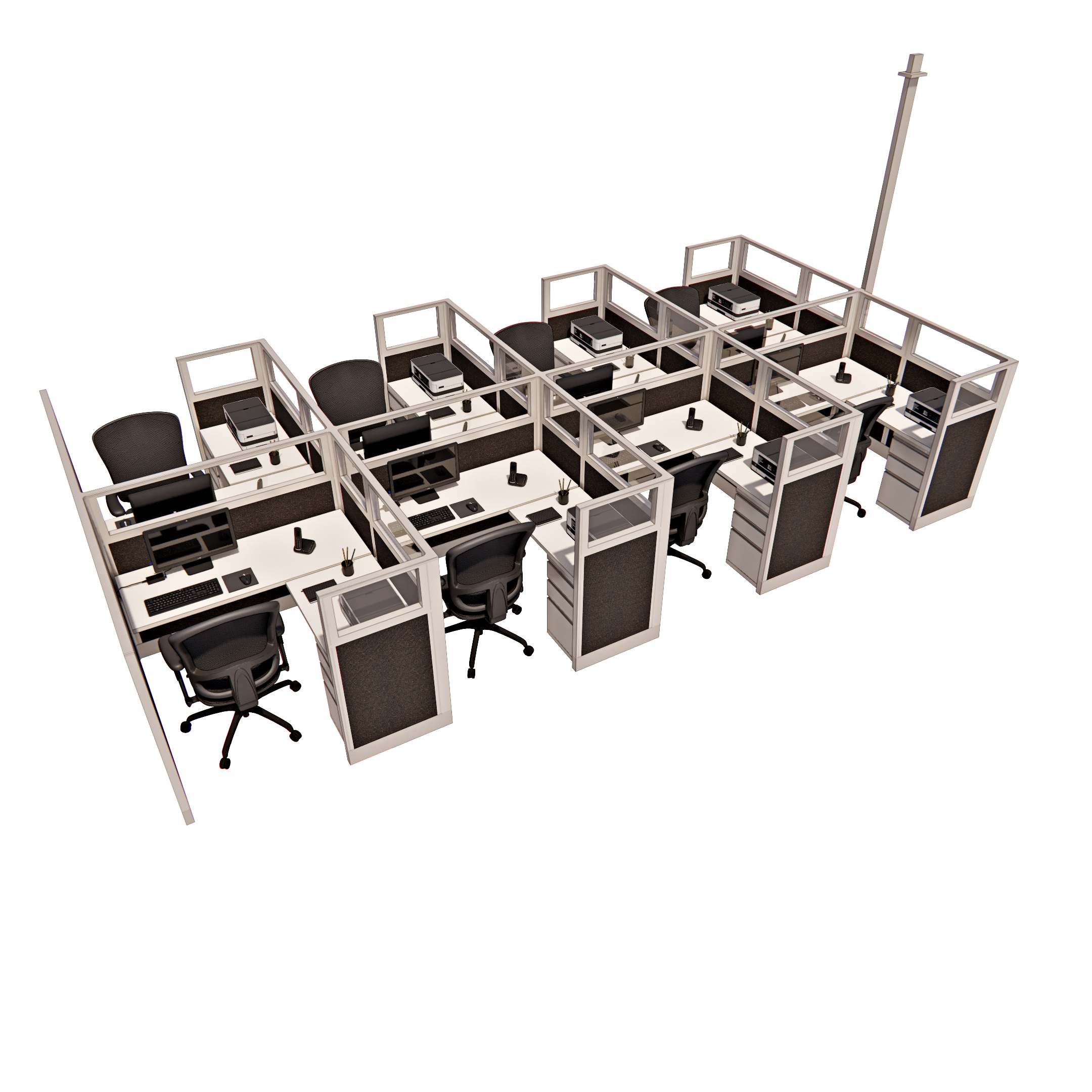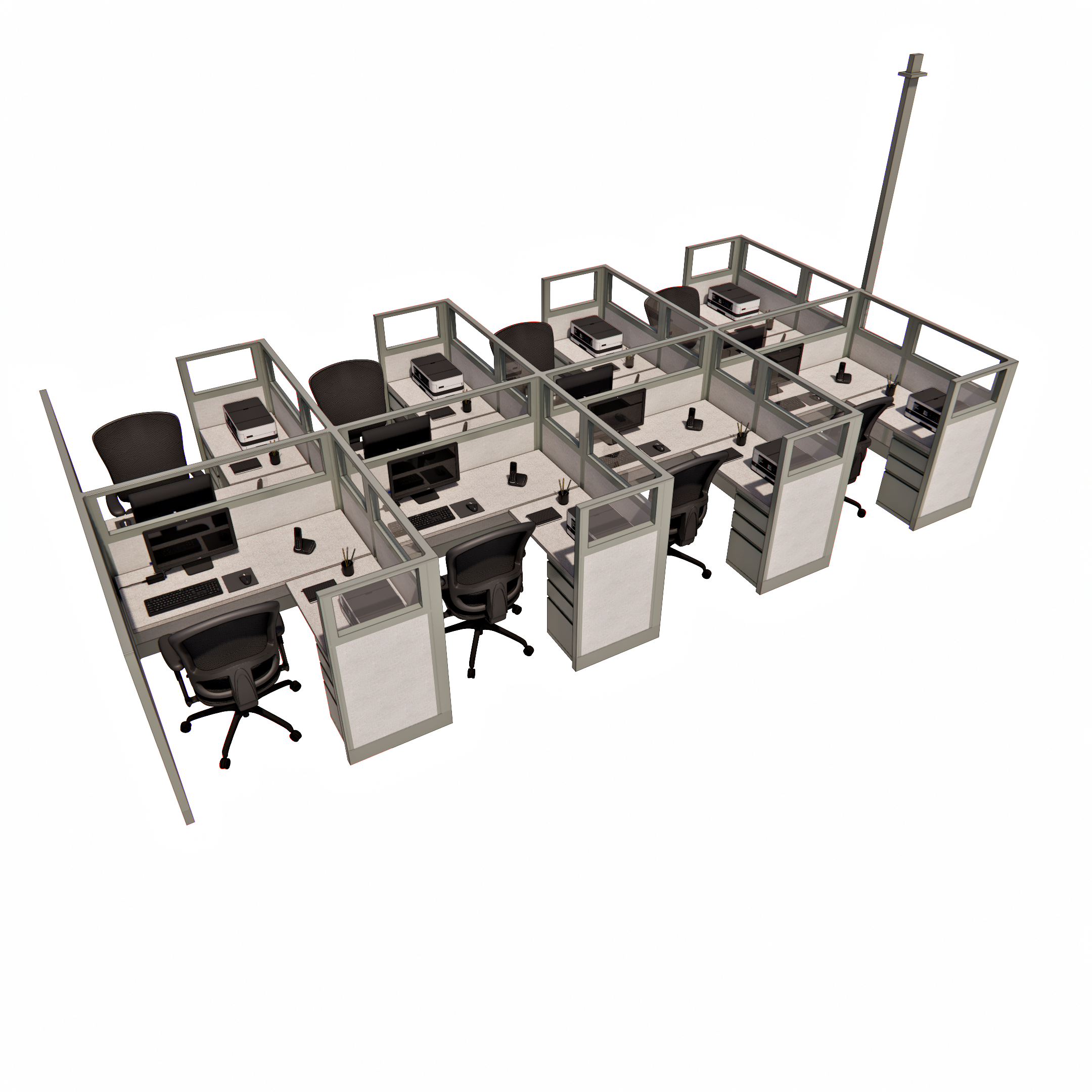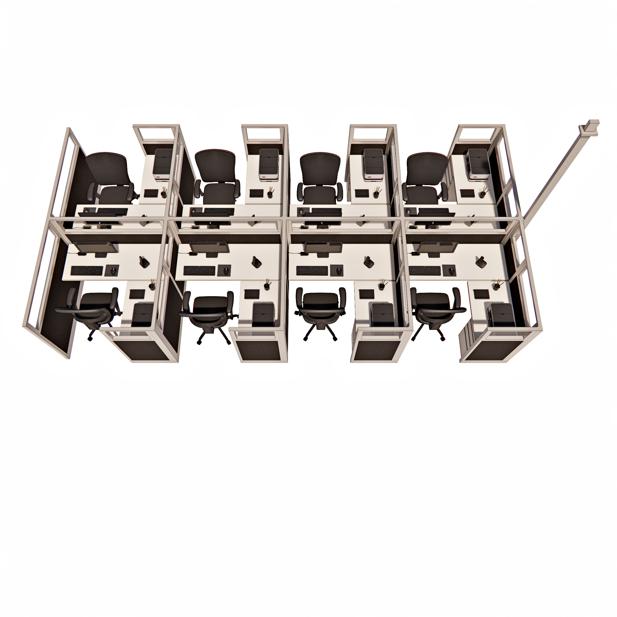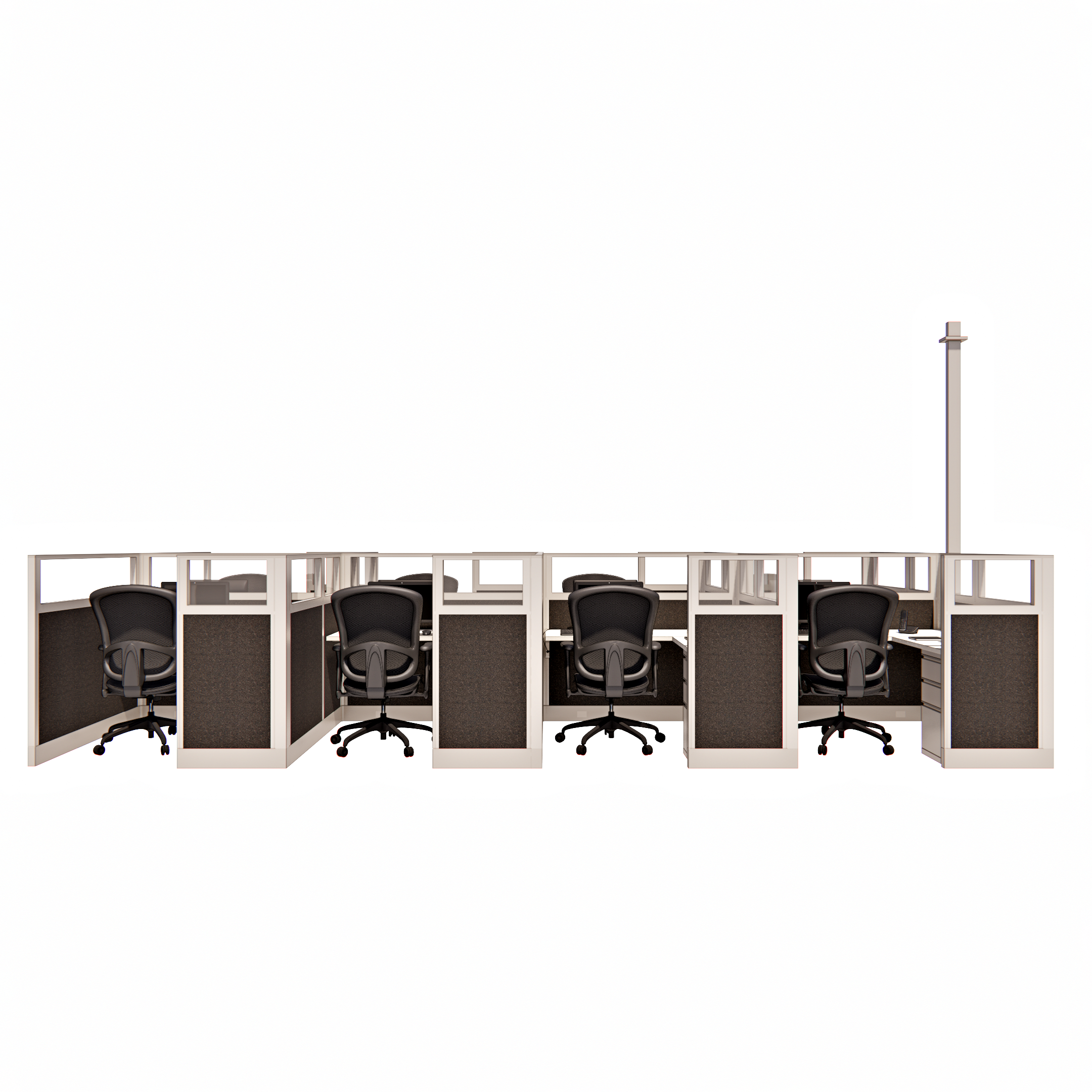 This pod of eight 53-inch tall office cubicles, each measuring 5 by 5 feet, is designed with glass stacker panels that extend the height and allow natural light to permeate the workspace. The glass stackers add a modern, open feel while maintaining a sense of privacy, making each cubicle feel both spacious and connected. Ideal for larger teams, this configuration provides individual workstations that support focused productivity while fostering a collaborative environment through visibility and proximity. The design strikes a balance between personal workspace and team interaction, enhancing both functionality and style in a shared office setting.