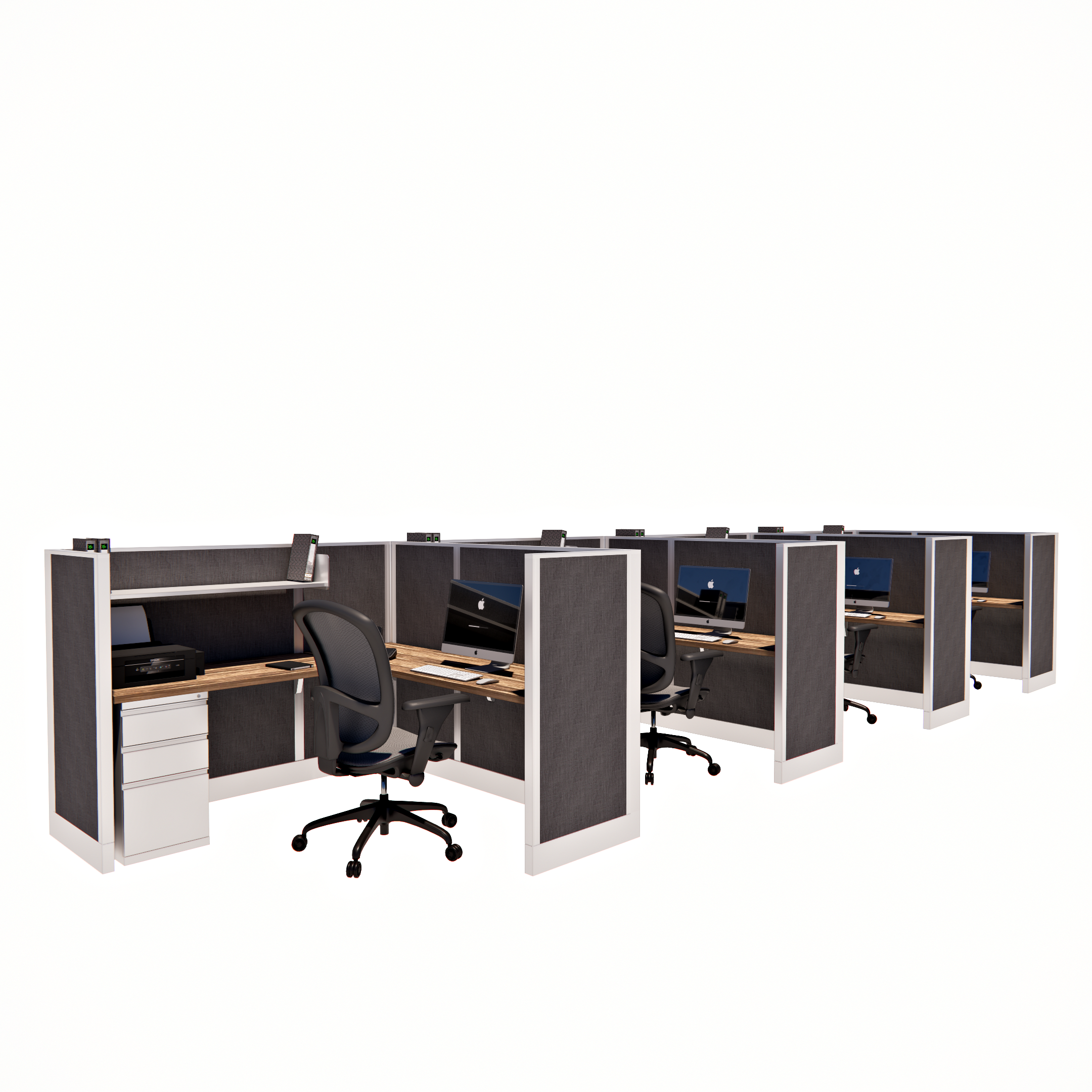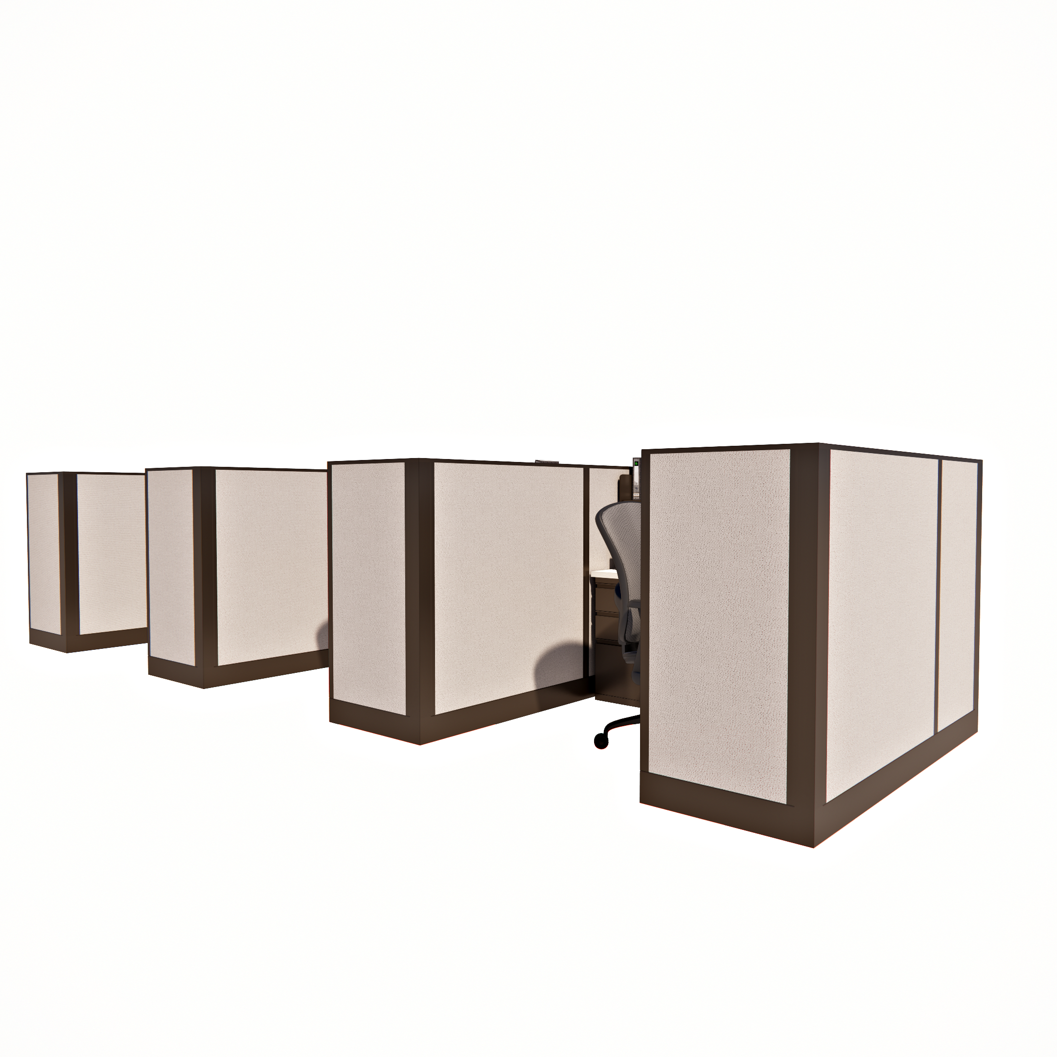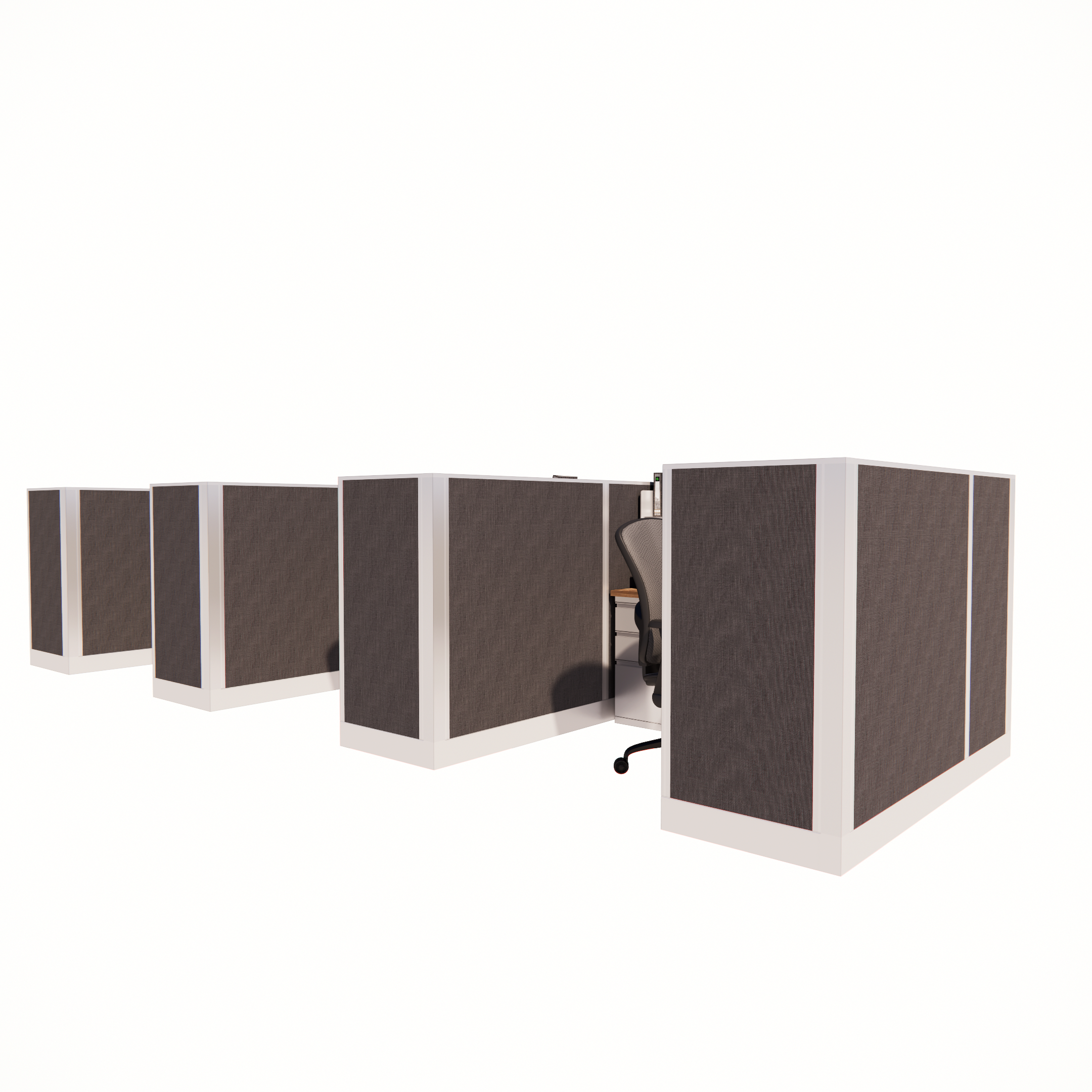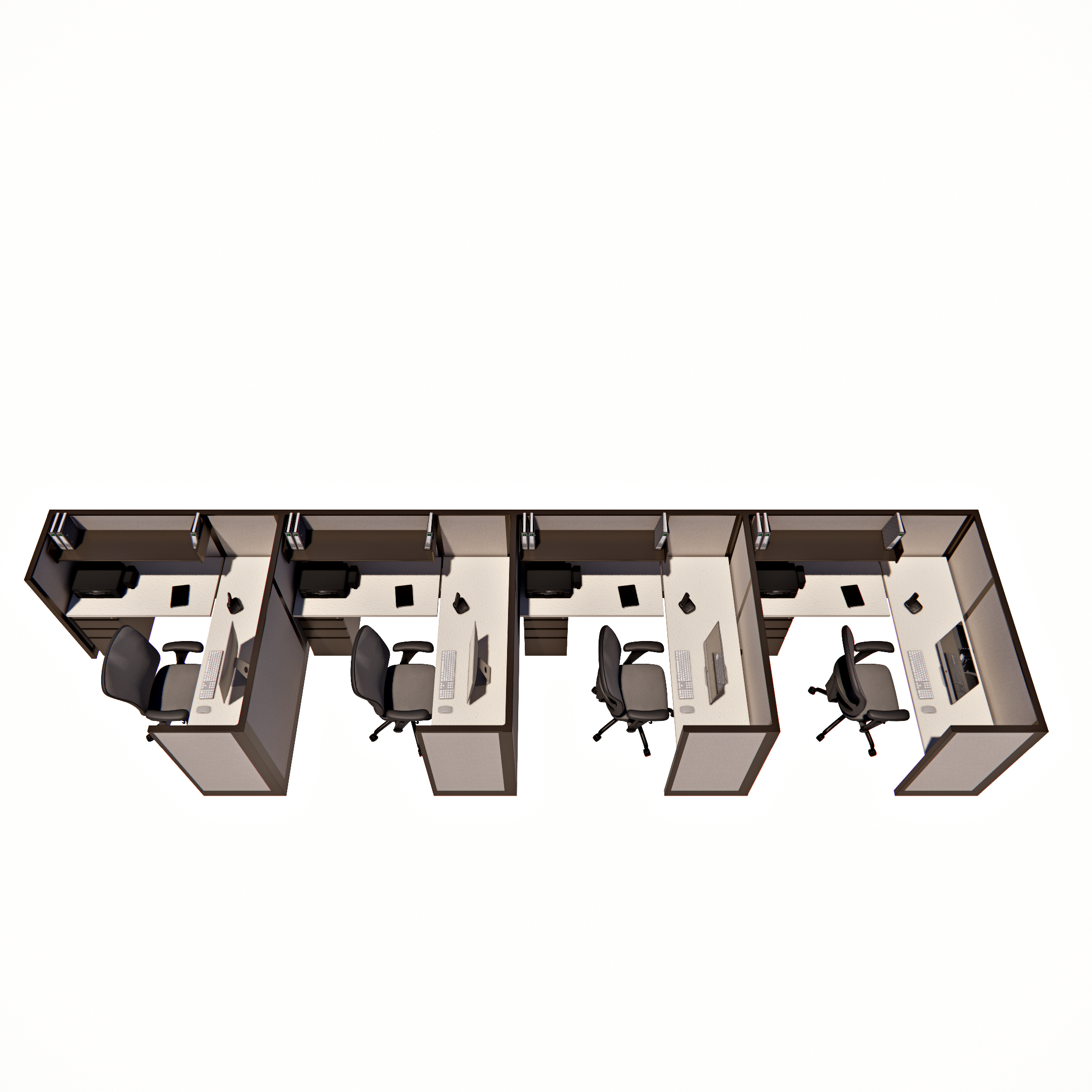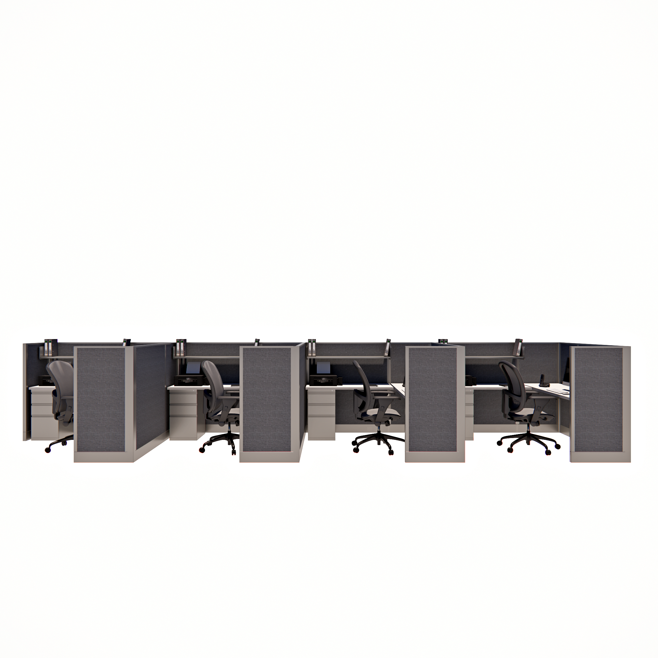 This line of four 53-inch tall office cubicles, each sized at 6 by 6 feet, offers a balanced setup for productivity and teamwork. The 53-inch height provides partial privacy while maintaining open sightlines, promoting a collaborative work environment. Each cubicle offers ample space for personal organization and comfort within an efficient, shared layout. Ideal for offices looking to support individual focus and team interaction, this configuration combines functionality with accessibility in a streamlined design.