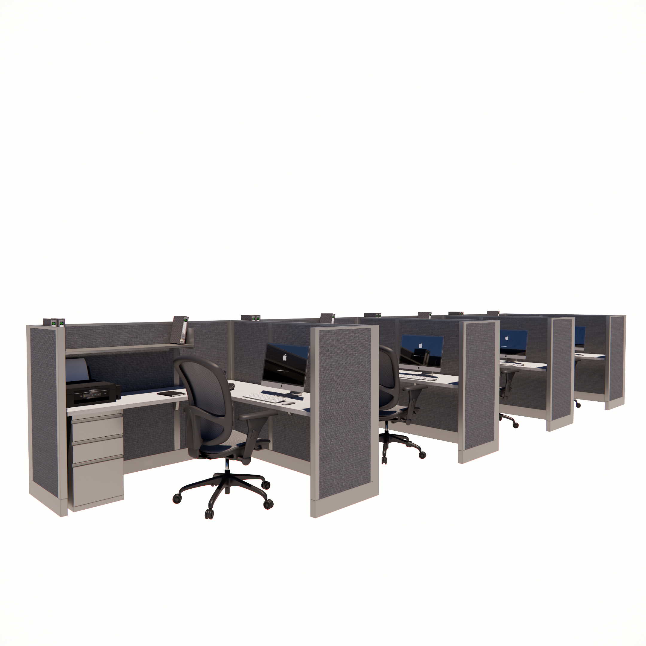 This is a standard cubicle configuration available in any quantity, with a combination of configurations and heights. They can be customized and modified to perfectly suit your space and specific needs. We offer discounts; options can be added or removed to accommodate your budget. Standard configurations provide a clear cost, while a space plan delivers a tailored solution.