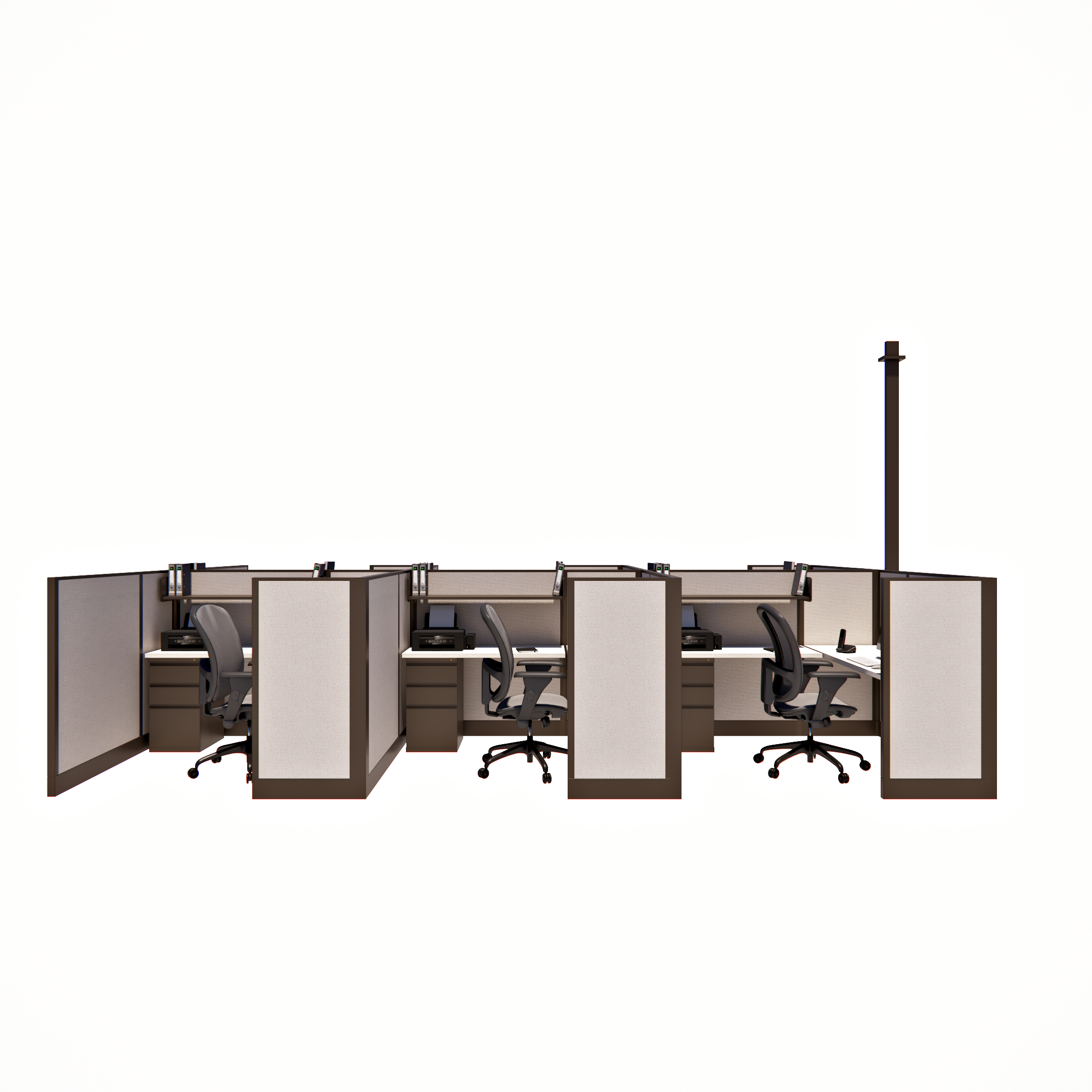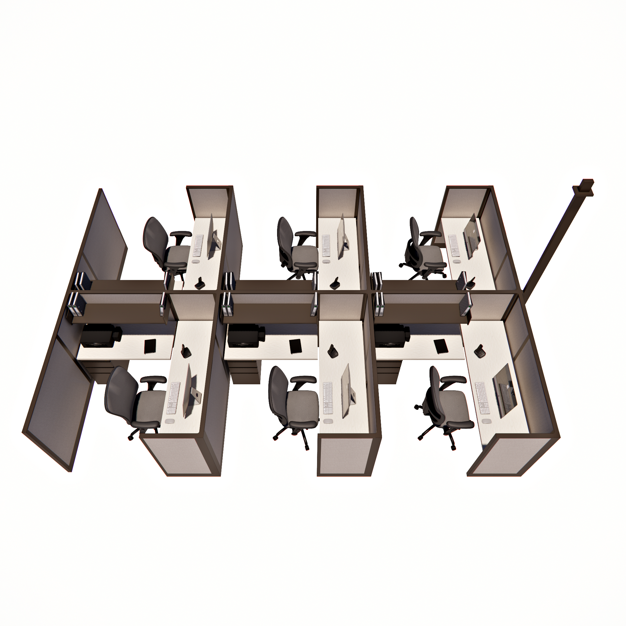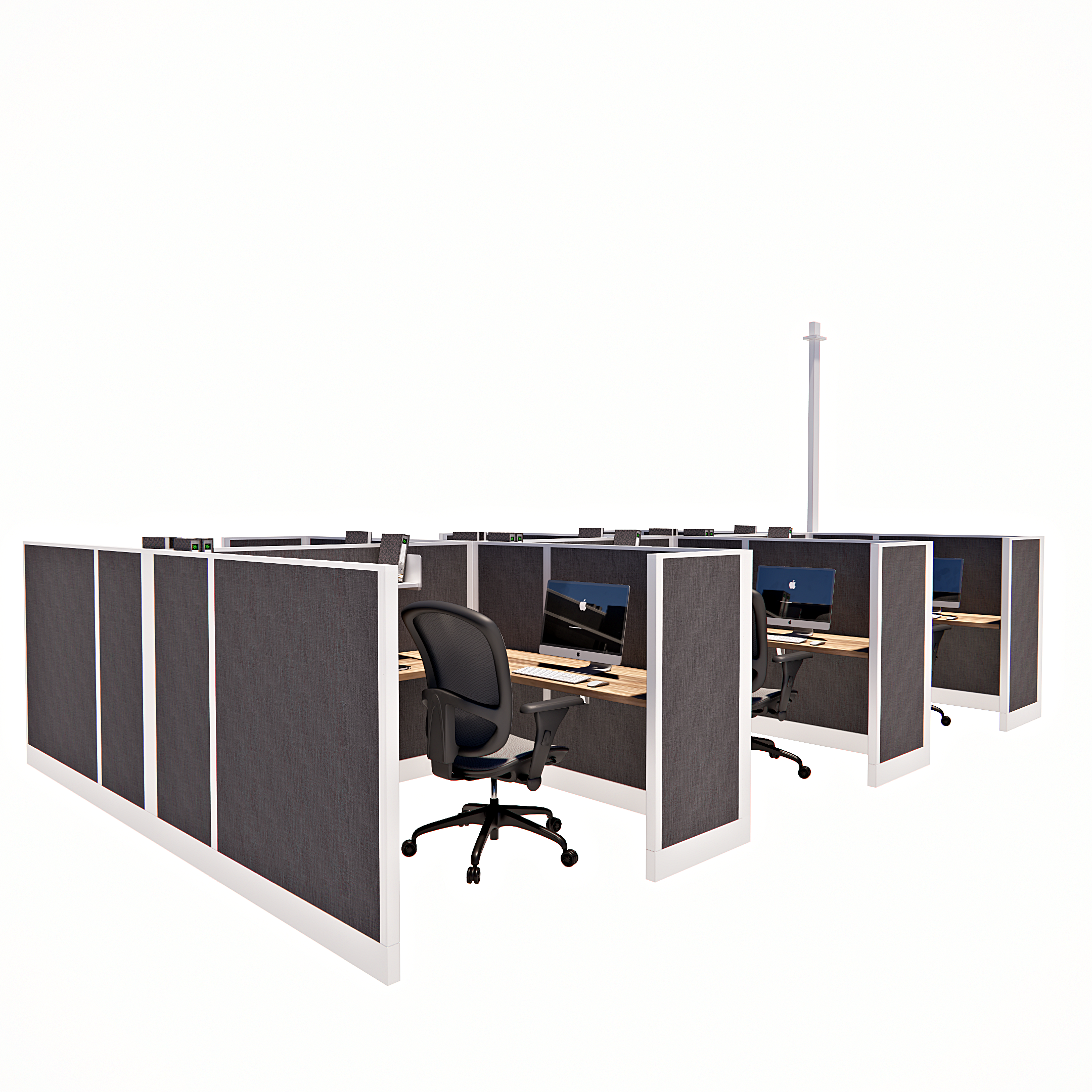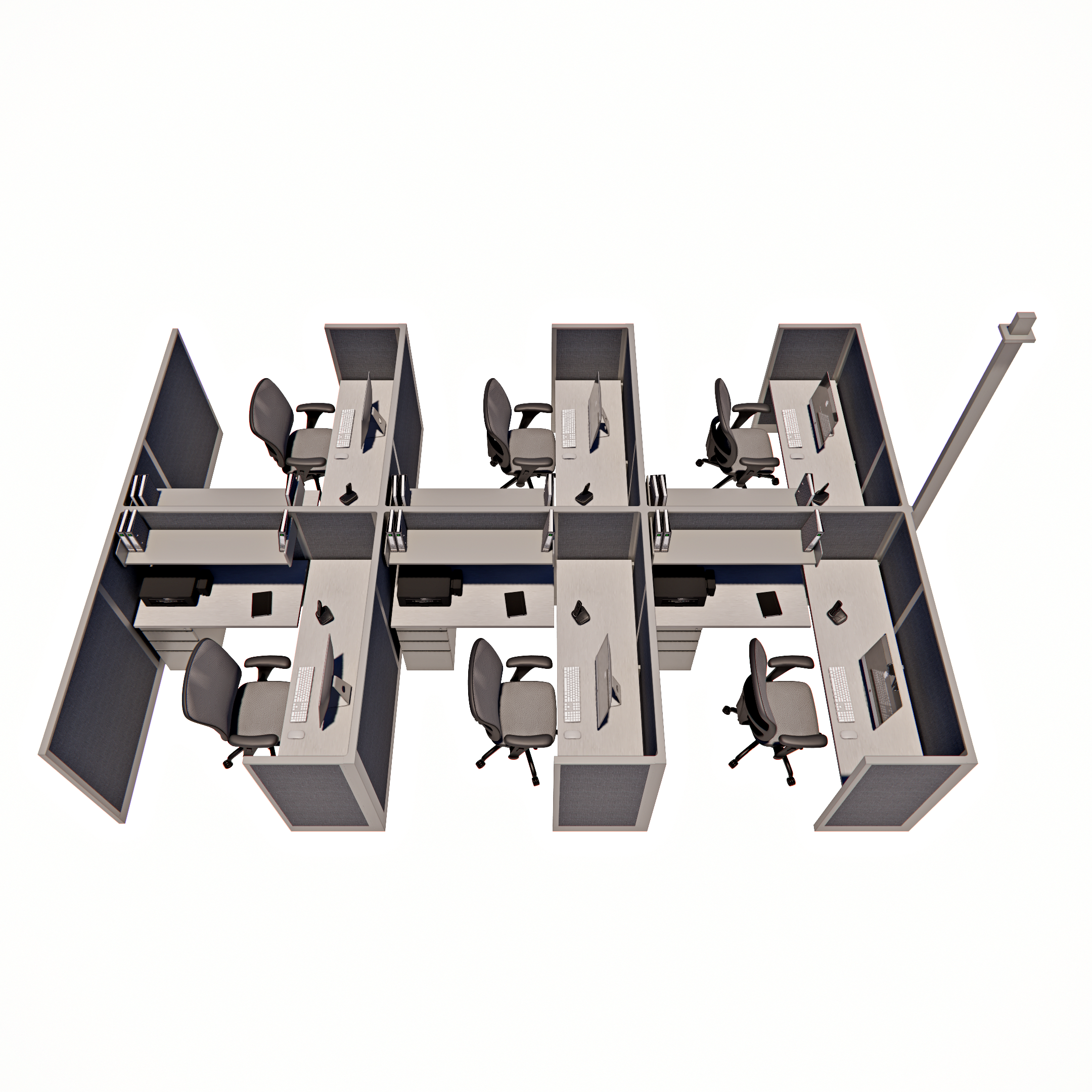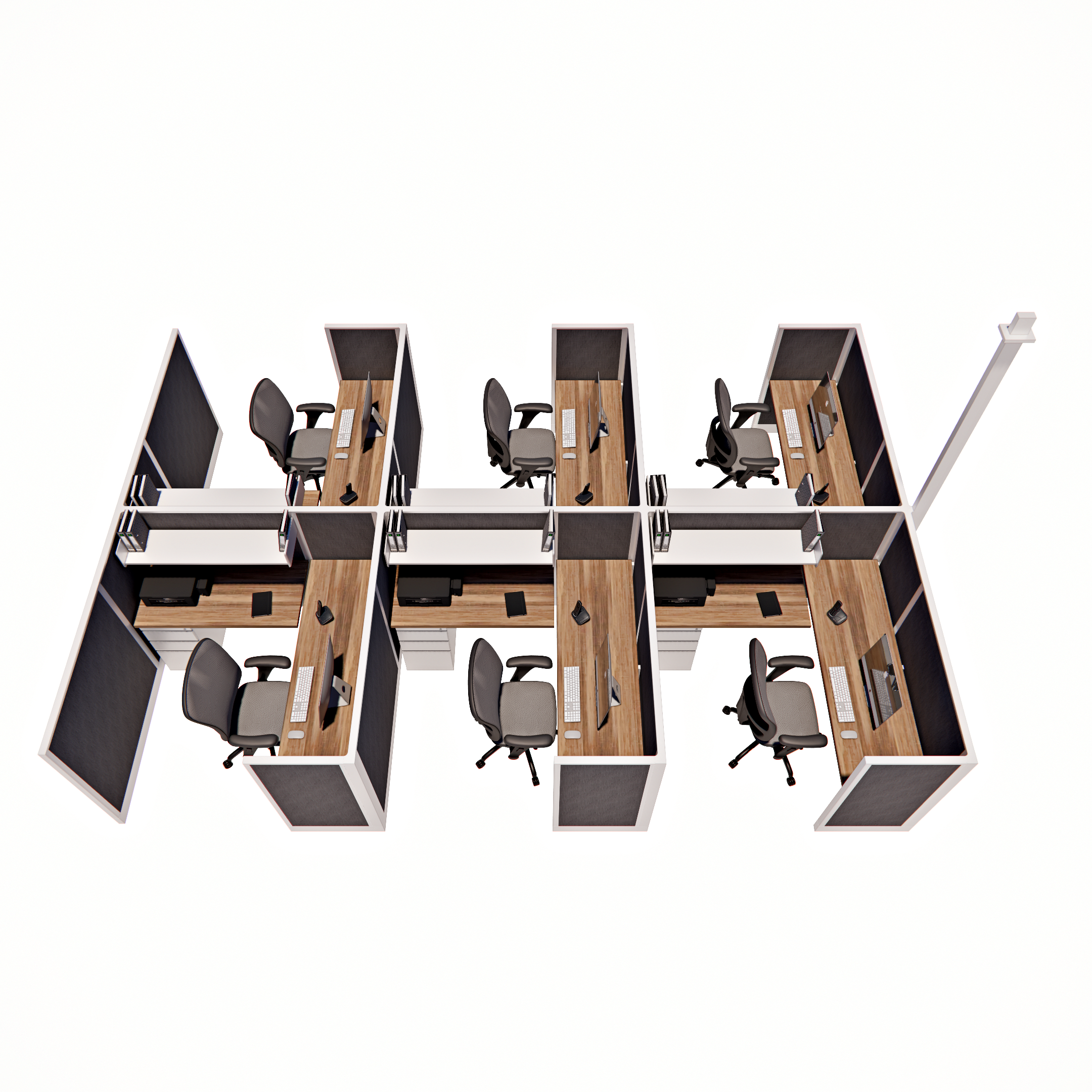 This pod of six 53-inch tall office cubicles, each measuring 6 by 6 feet, is crafted for an efficient, collaborative workspace. The 53-inch panel height provides moderate privacy while keeping the layout visually open, making it easy for team members to communicate. Each cubicle offers a spacious work surface and ample room for personal organization, perfect for offices that need a balance between individual focus and team interaction. This configuration is ideal for maximizing productivity and functionality within a shared, compact setup.
