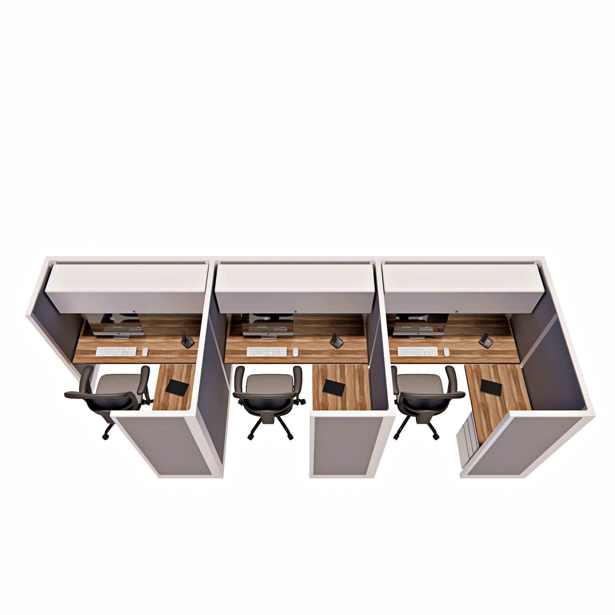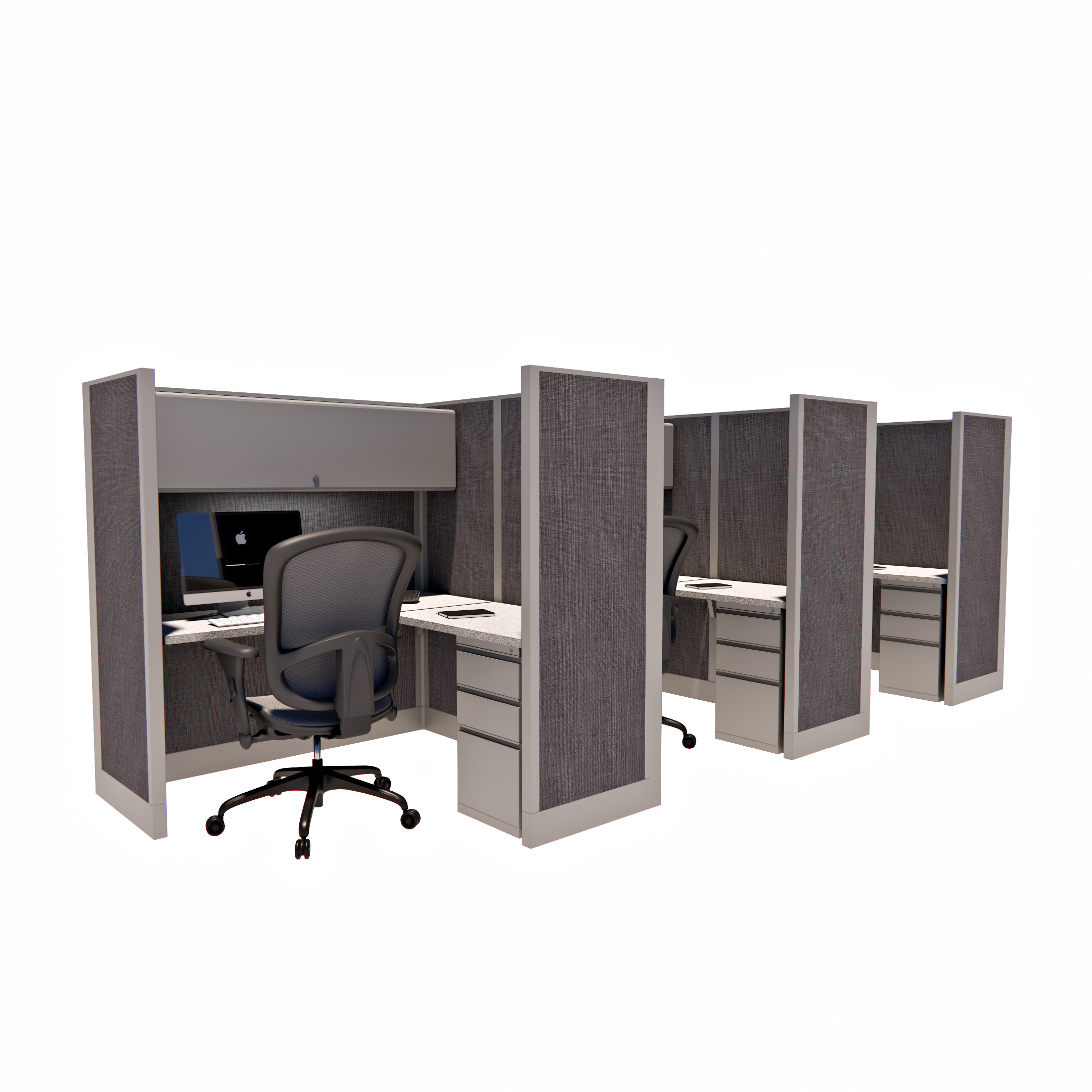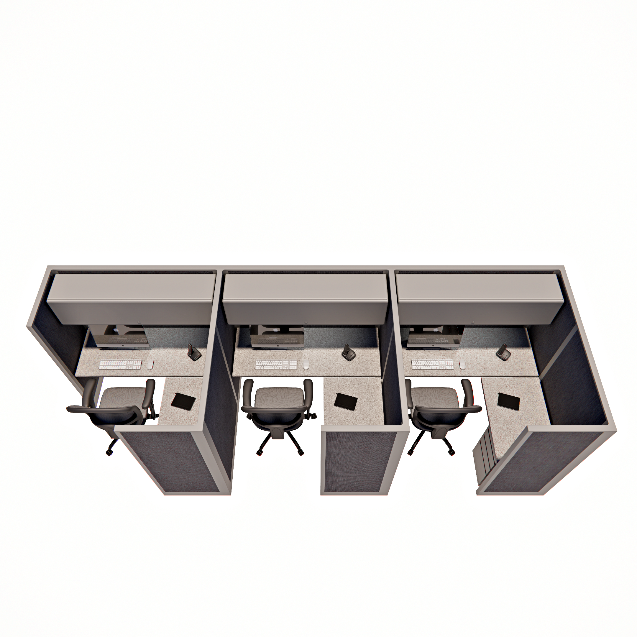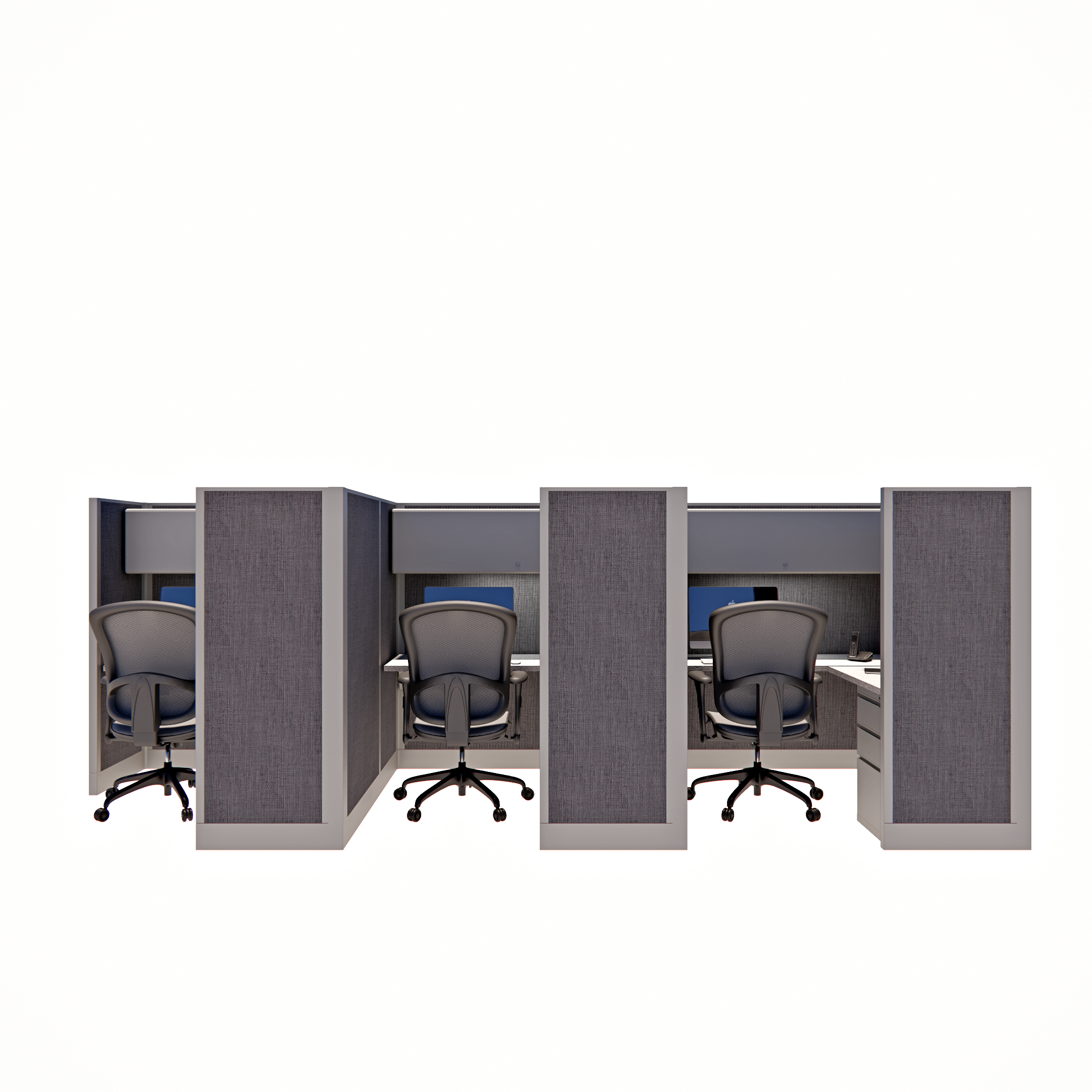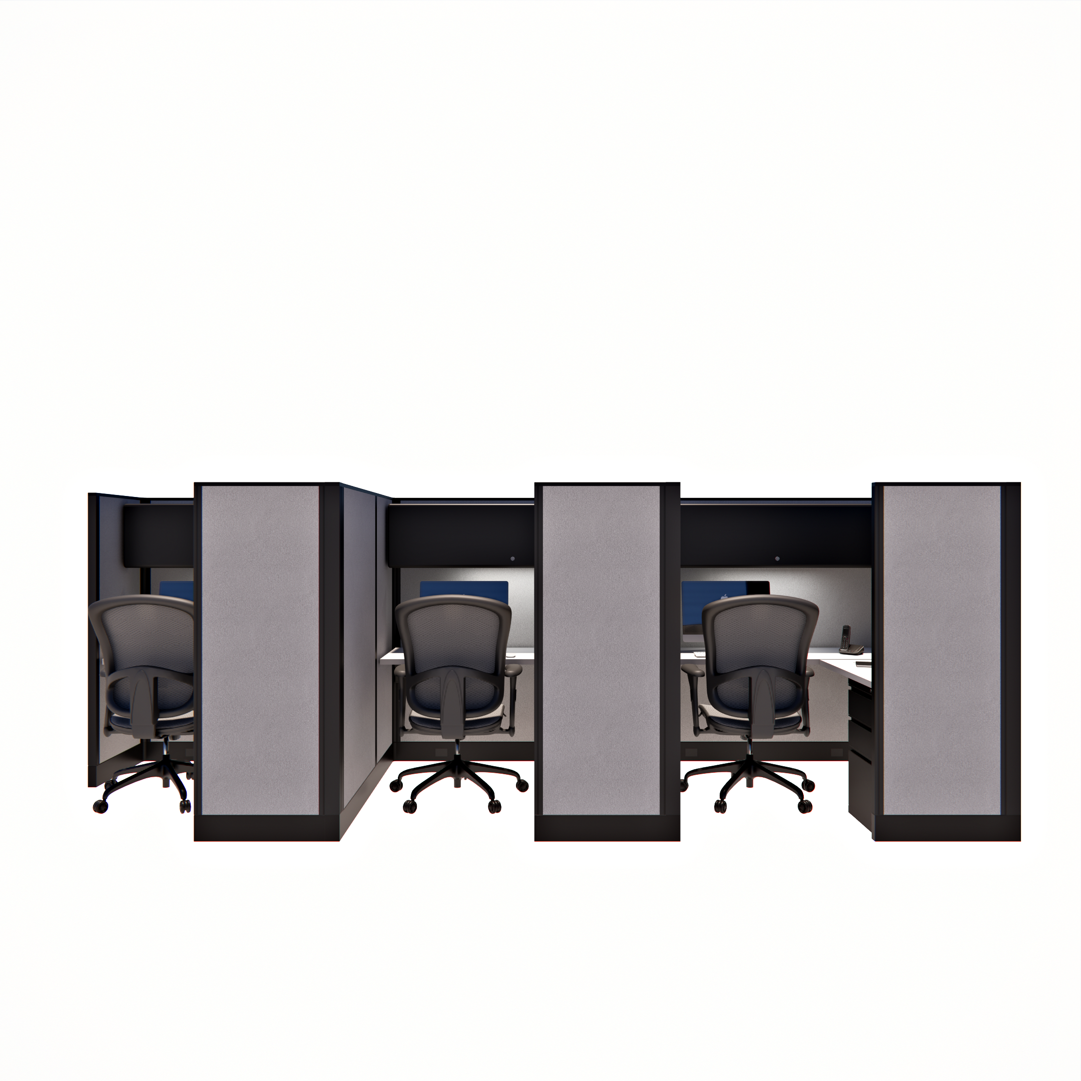 This line of three office cubicles is 67 inches tall, with each cubicle providing a 5 by 5-foot workspace. Each cubicle is equipped with a box-box-file pedestal for organized storage, an overhead bin for additional space, and an LED task light to ensure optimal lighting at each station. This setup offers both privacy and functionality, making it ideal for focused work in a shared office environment.