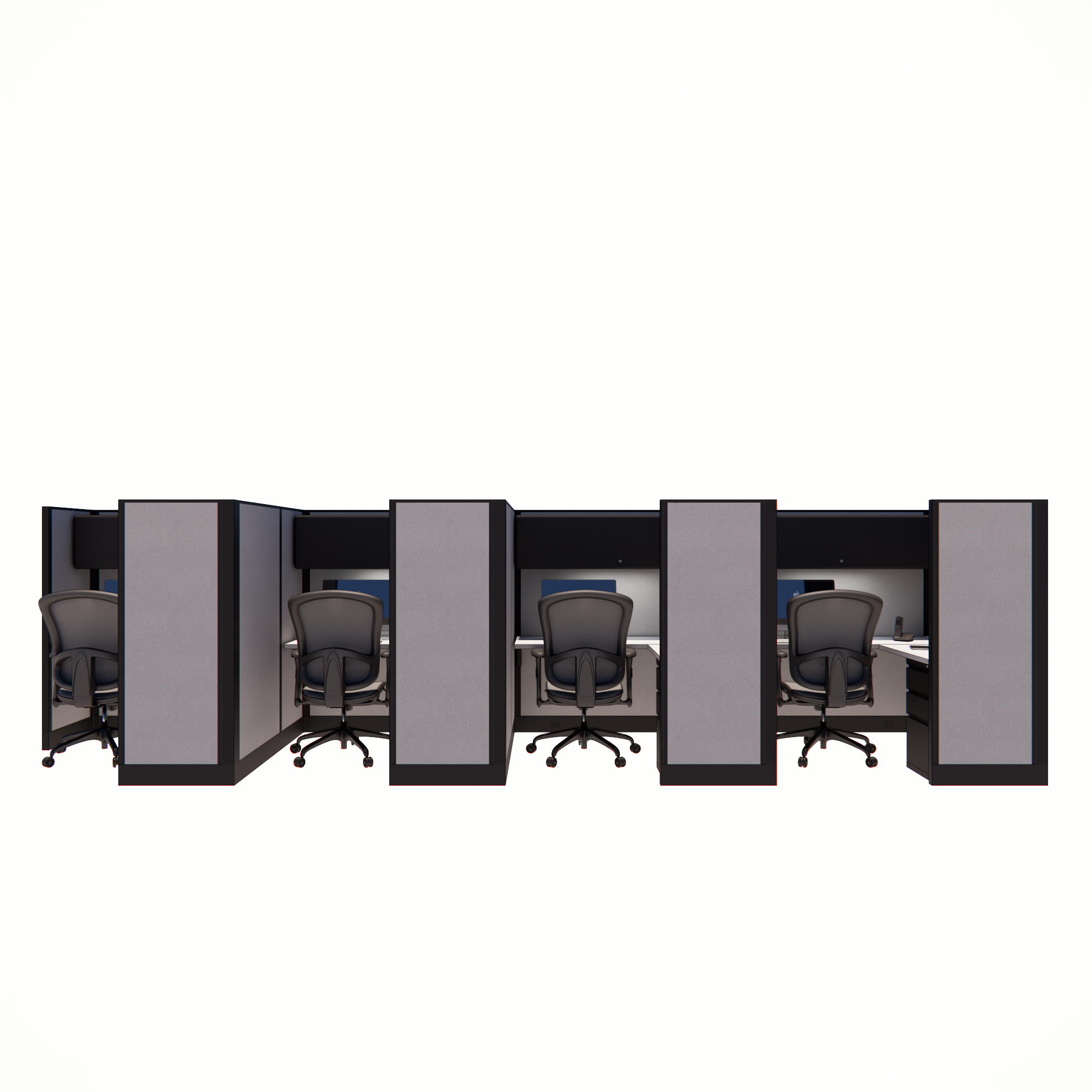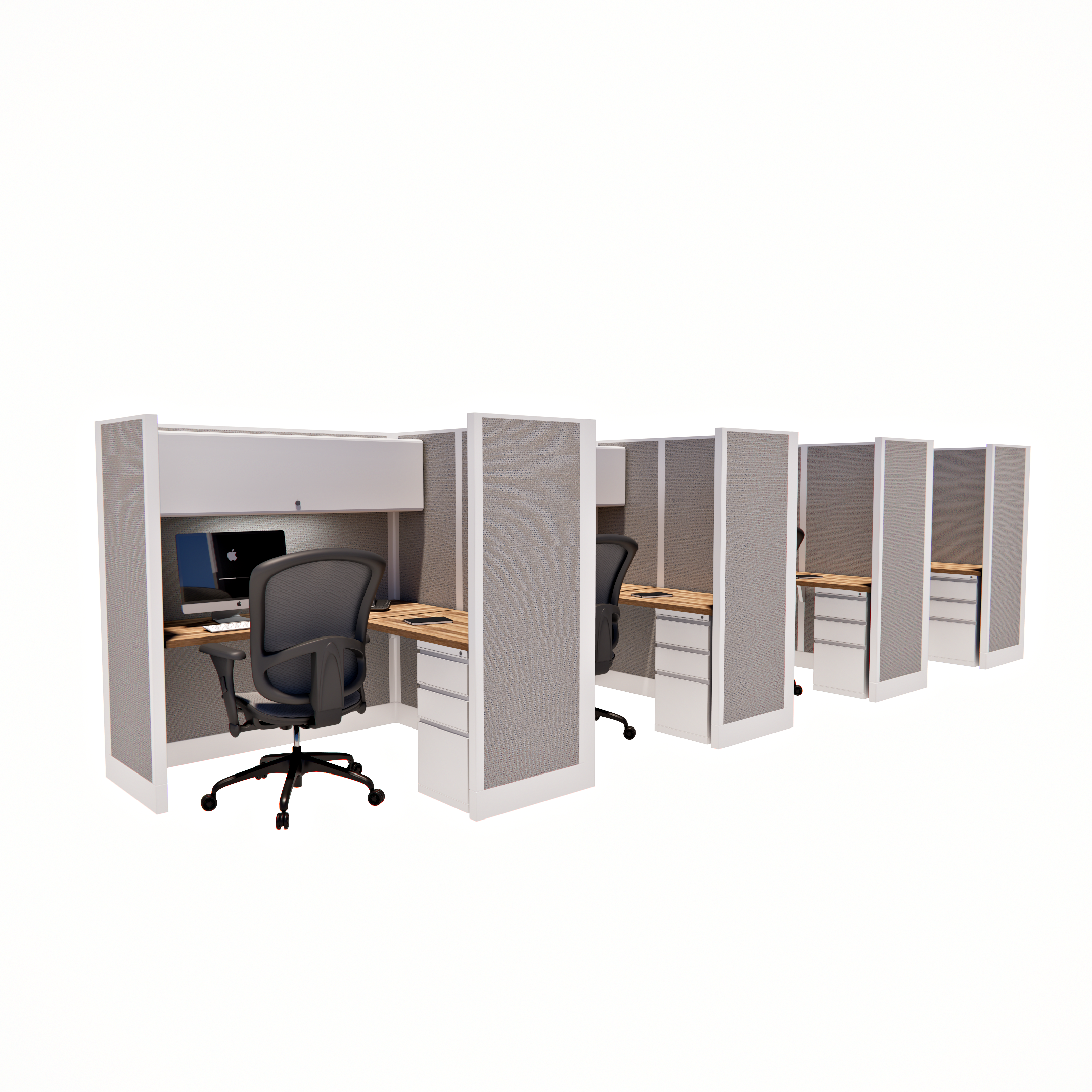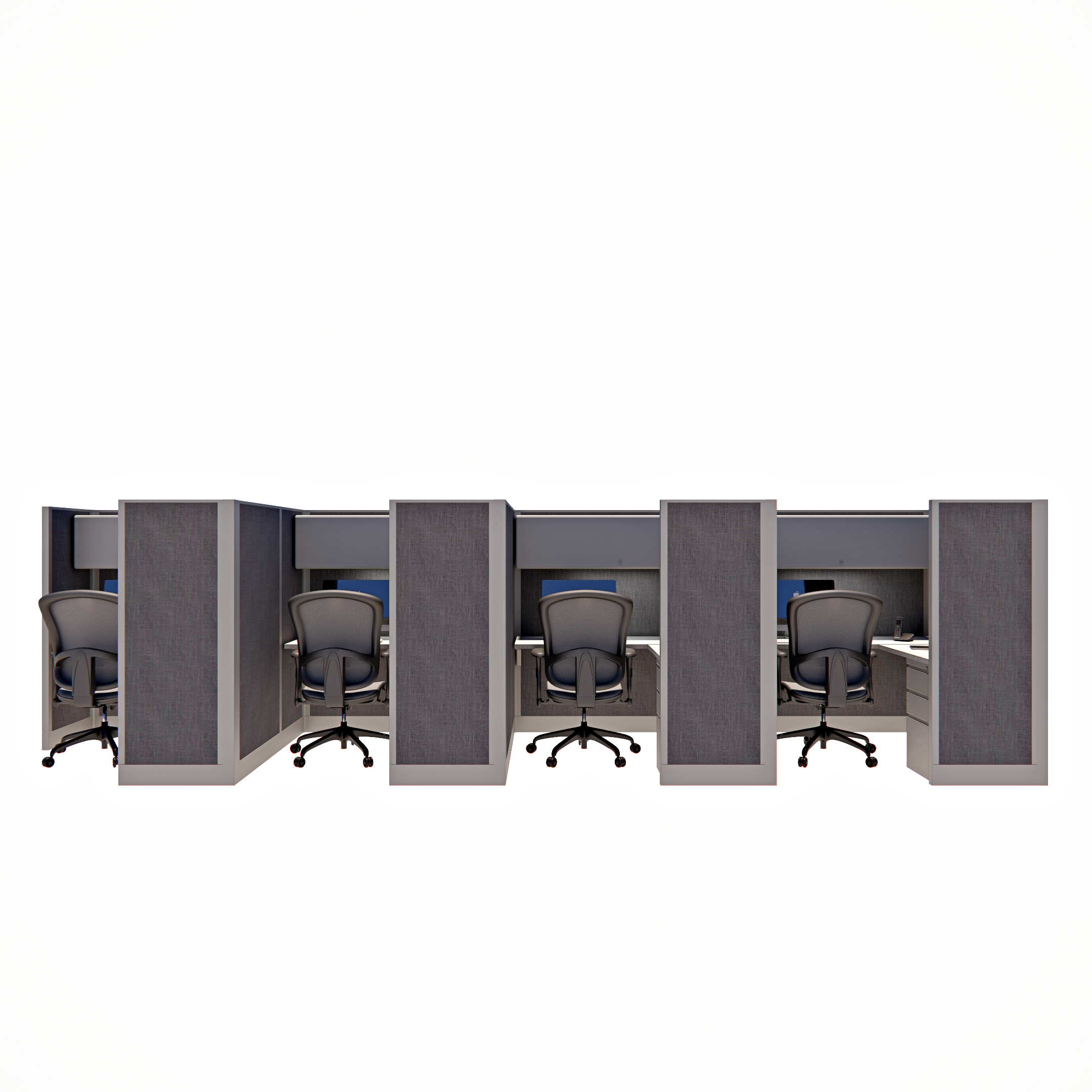This line of four office cubicles, standing 67 inches tall with each cubicle measuring 5 by 5 feet, is designed for efficient, organized workspaces. Each workstation includes a box-box-file pedestal for versatile storage, an overhead bin for additional capacity, and an LED task light to provide focused illumination. This configuration offers a blend of privacy and accessibility, making it a practical choice for collaborative yet individual-focused office settings.