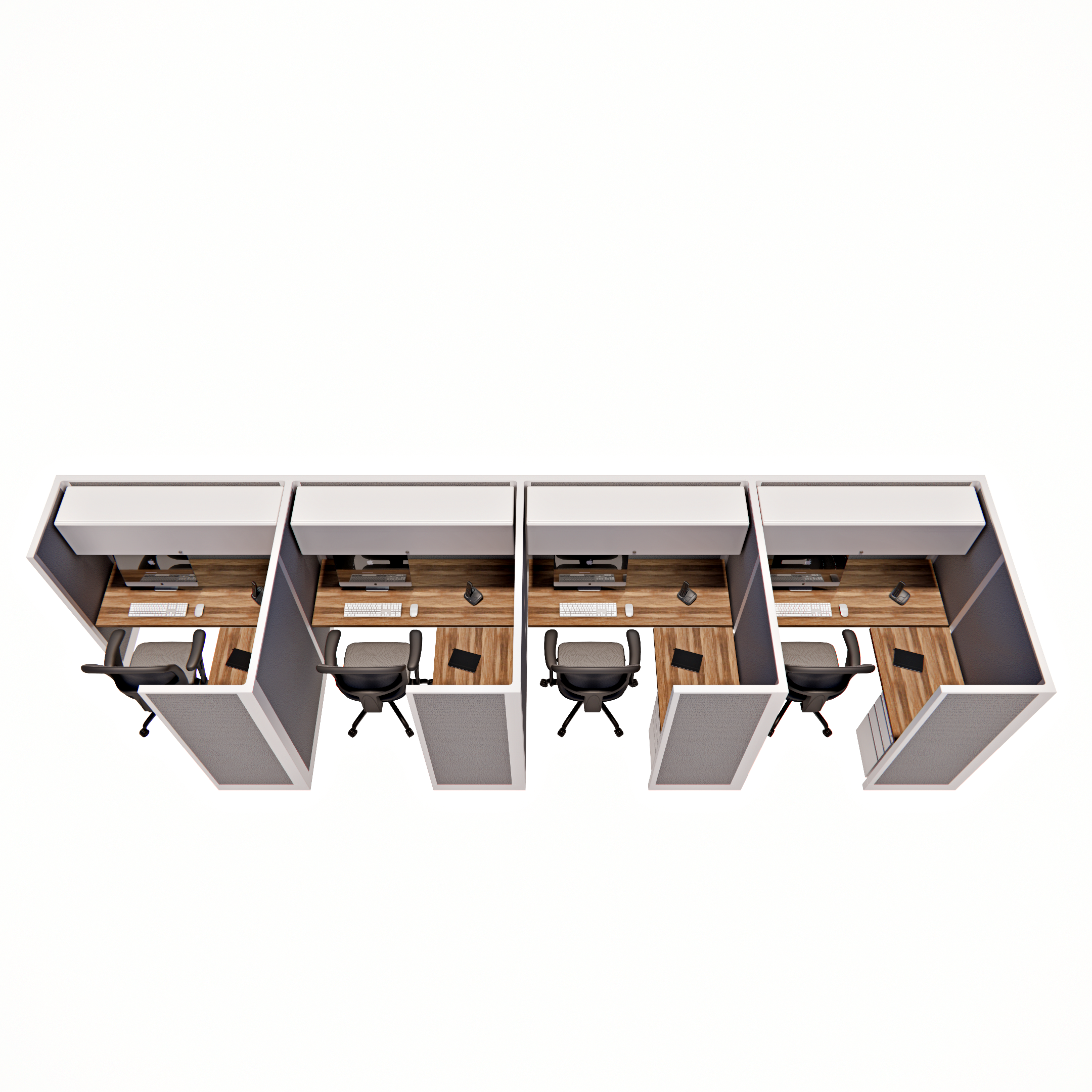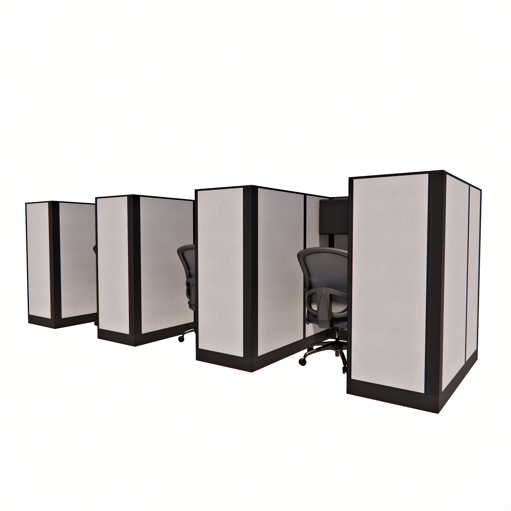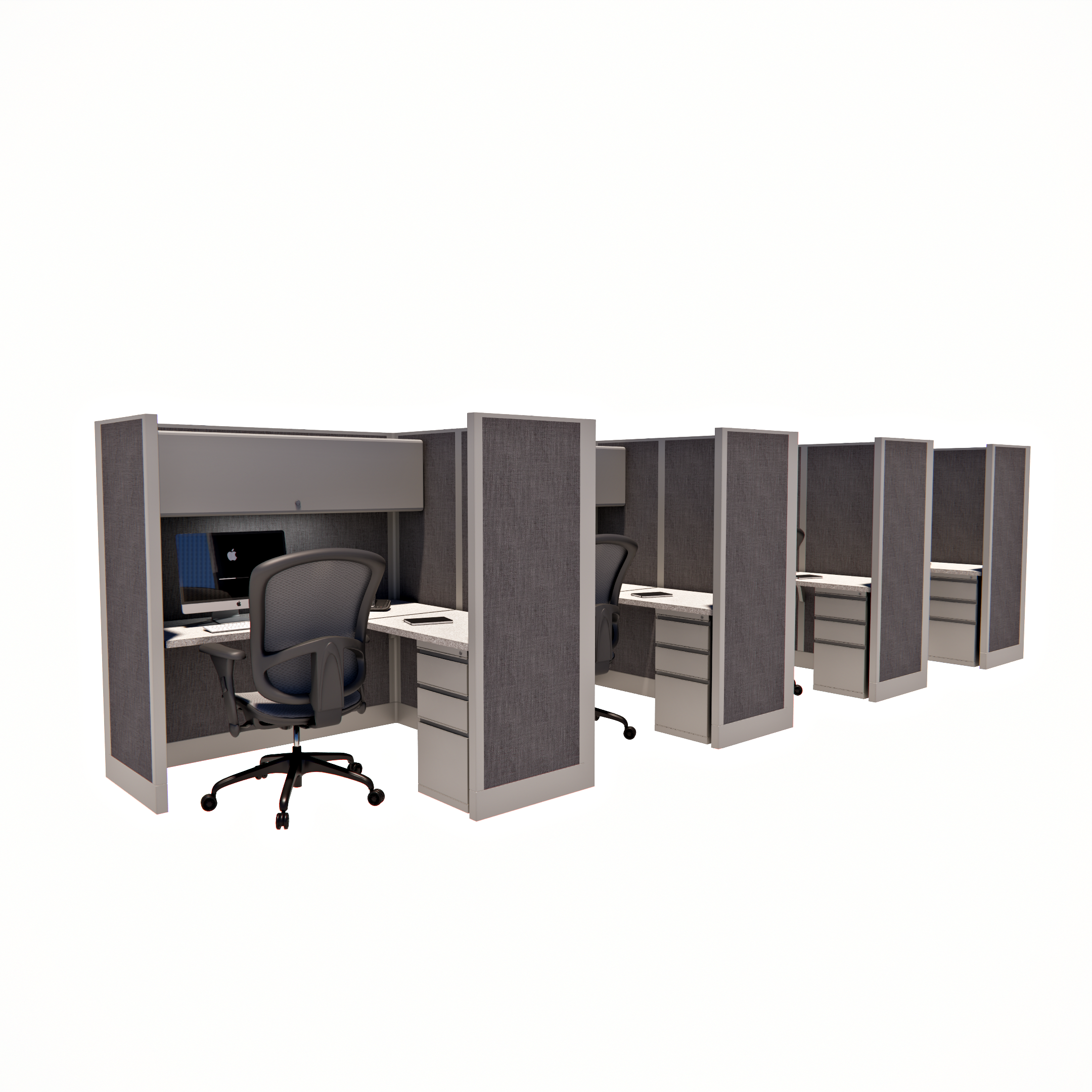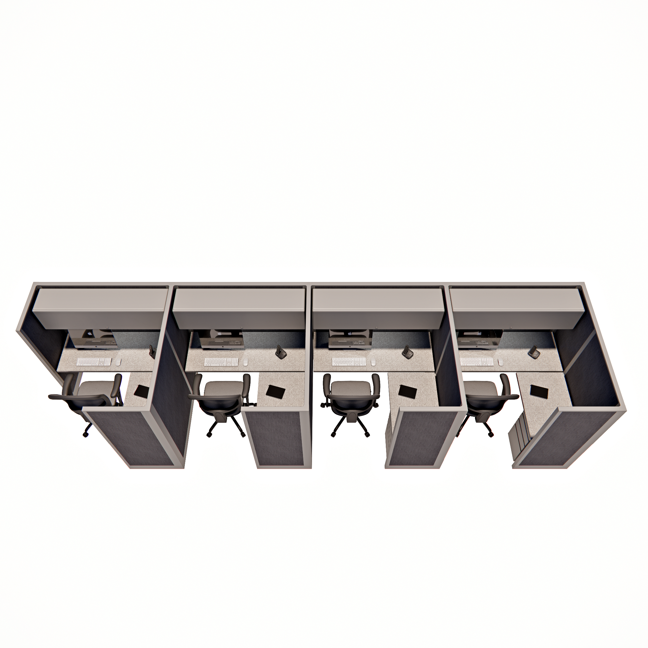 This line of four office cubicles, standing 67 inches tall with each cubicle measuring 5 by 5 feet, is designed for efficient, organized workspaces. Each workstation includes a box-box-file pedestal for versatile storage, an overhead bin for additional capacity, and an LED task light to provide focused illumination. This configuration offers a blend of privacy and accessibility, making it a practical choice for collaborative yet individual-focused office settings.