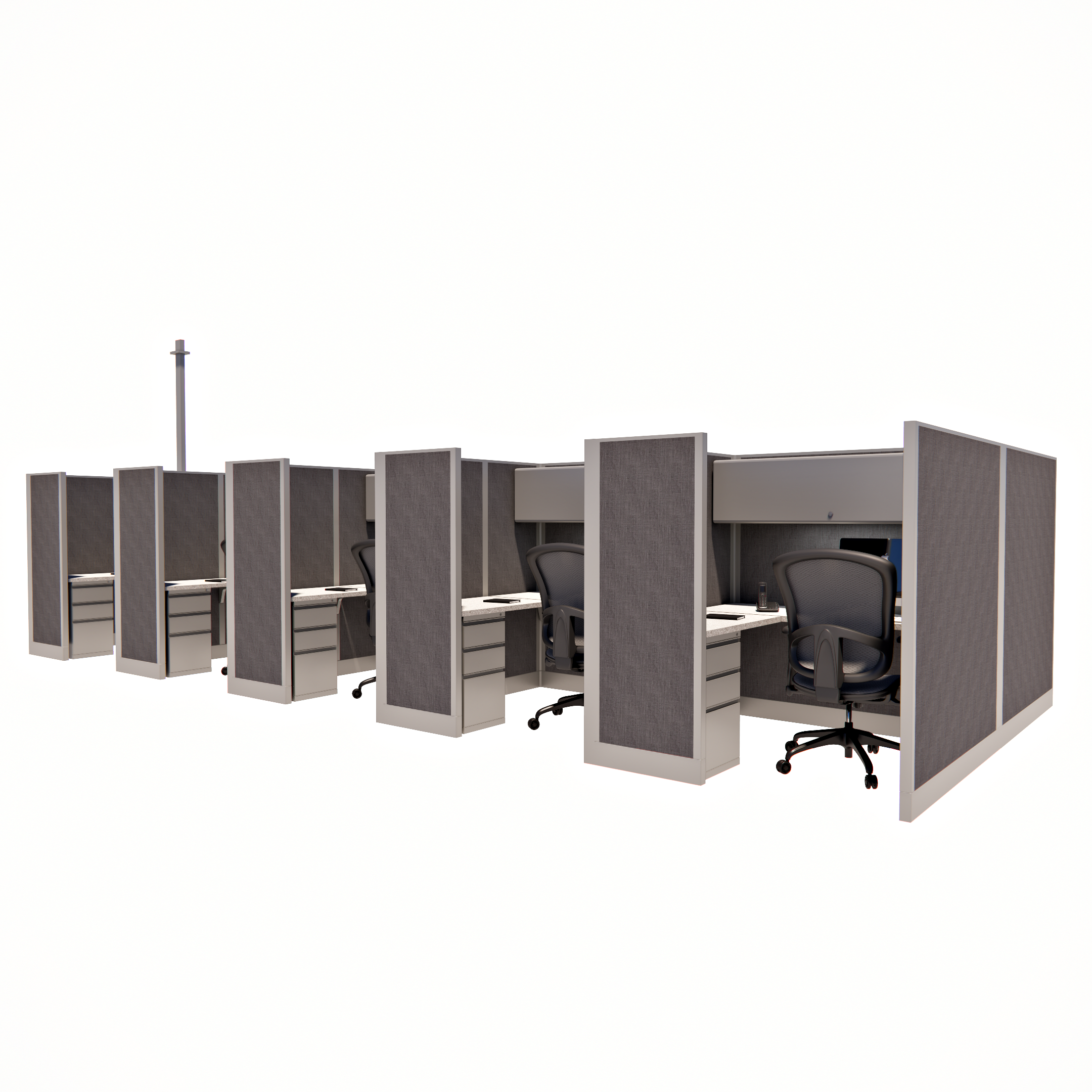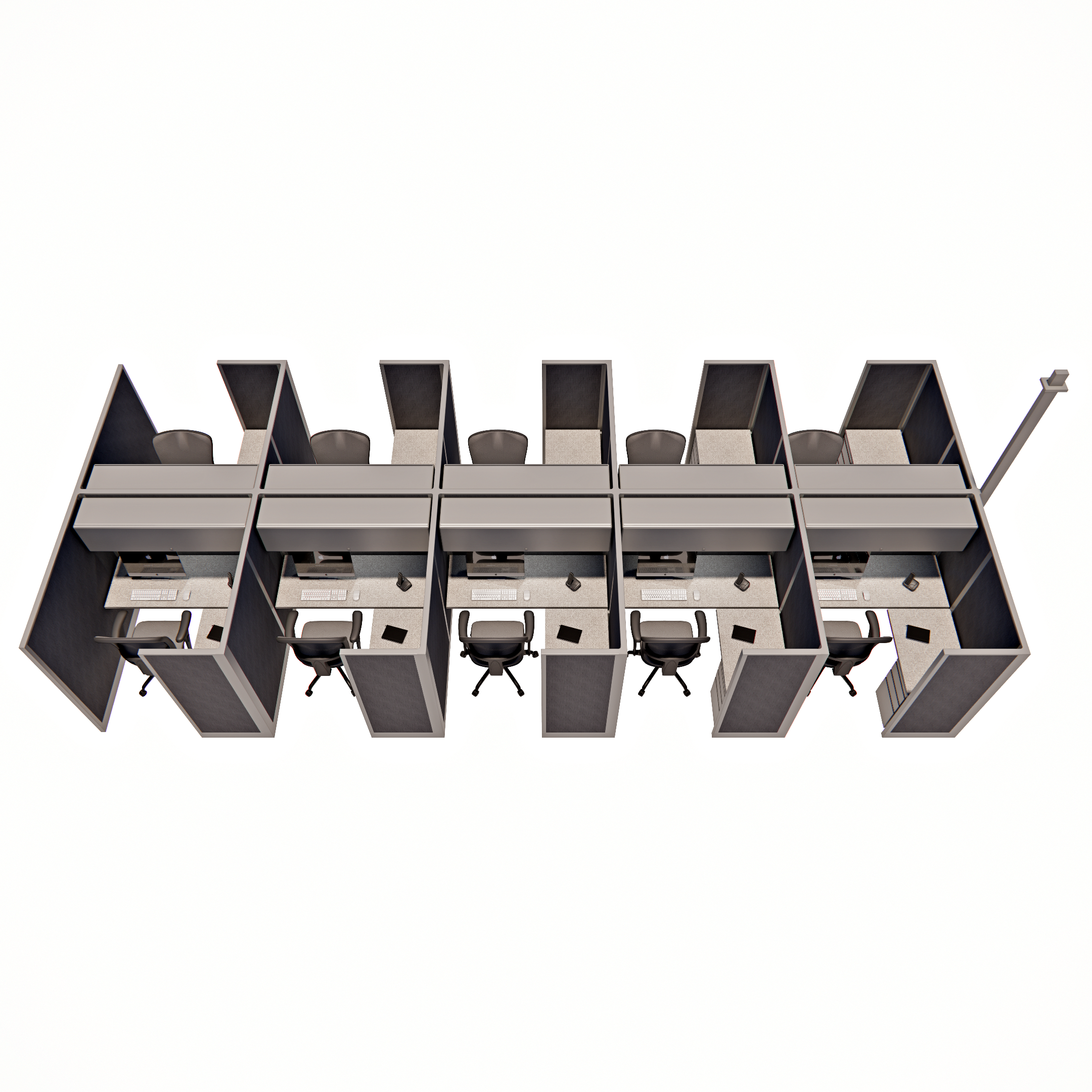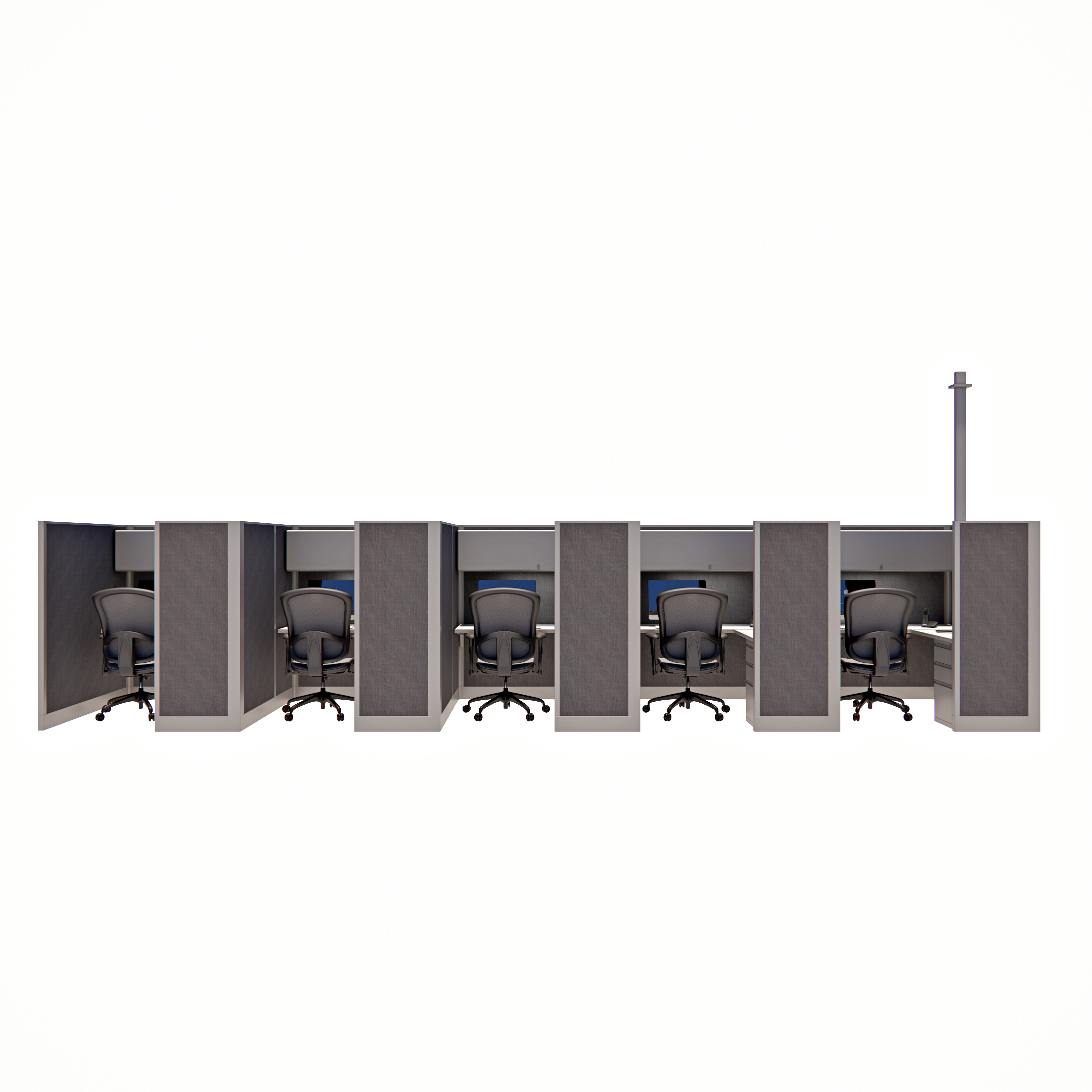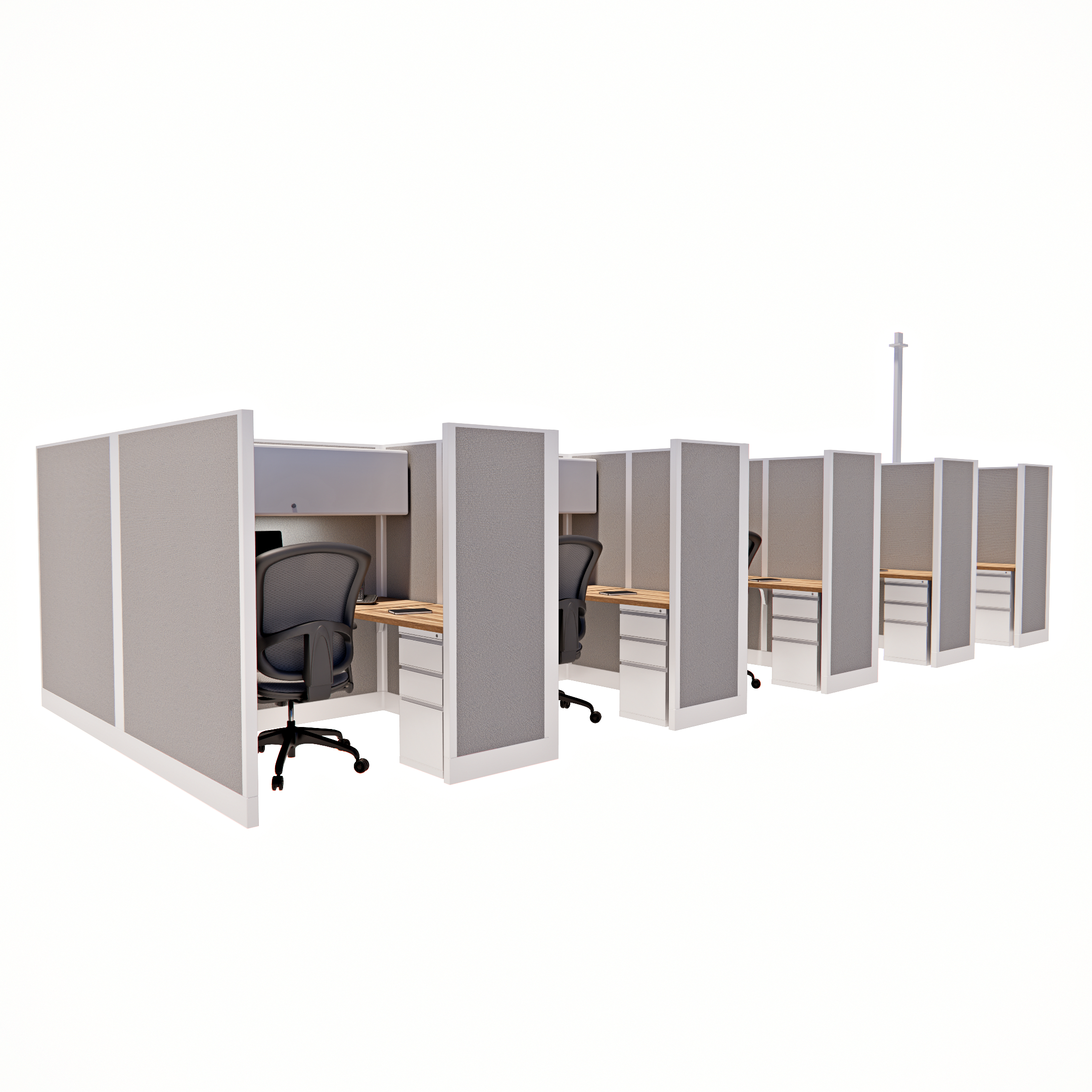 This 67-inch tall pod of ten office cubicles, each with a 5 by 5-foot workspace, is designed to maximize office space while providing employees with privacy and functionality. Each cubicle includes ample room for desks, storage, and essential work items. The 67-inch height offers a balance of privacy and openness, reducing distractions while maintaining a collaborative atmosphere. This setup is ideal for larger teams or departments that need individual workstations with easy access to one another in a shared environment.
