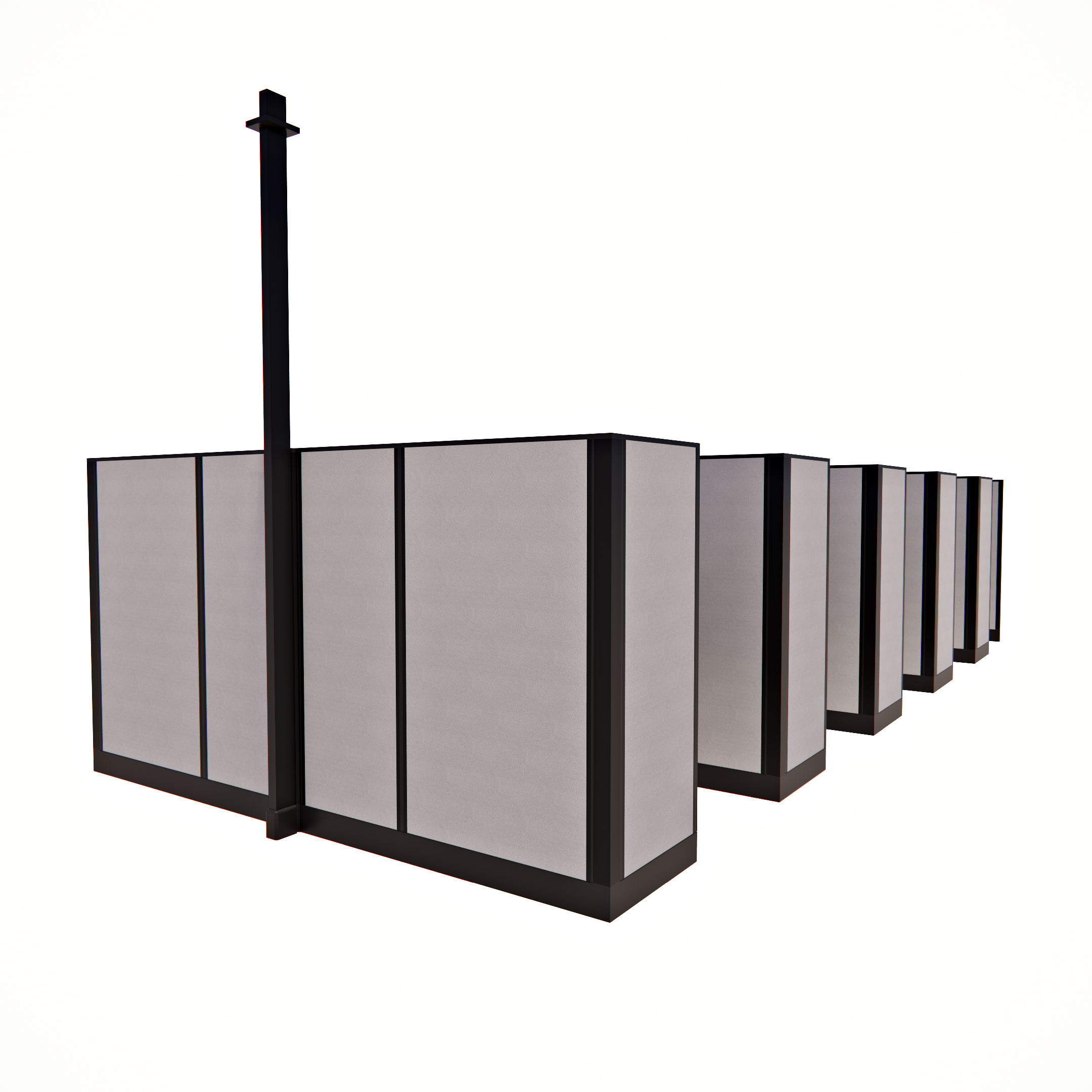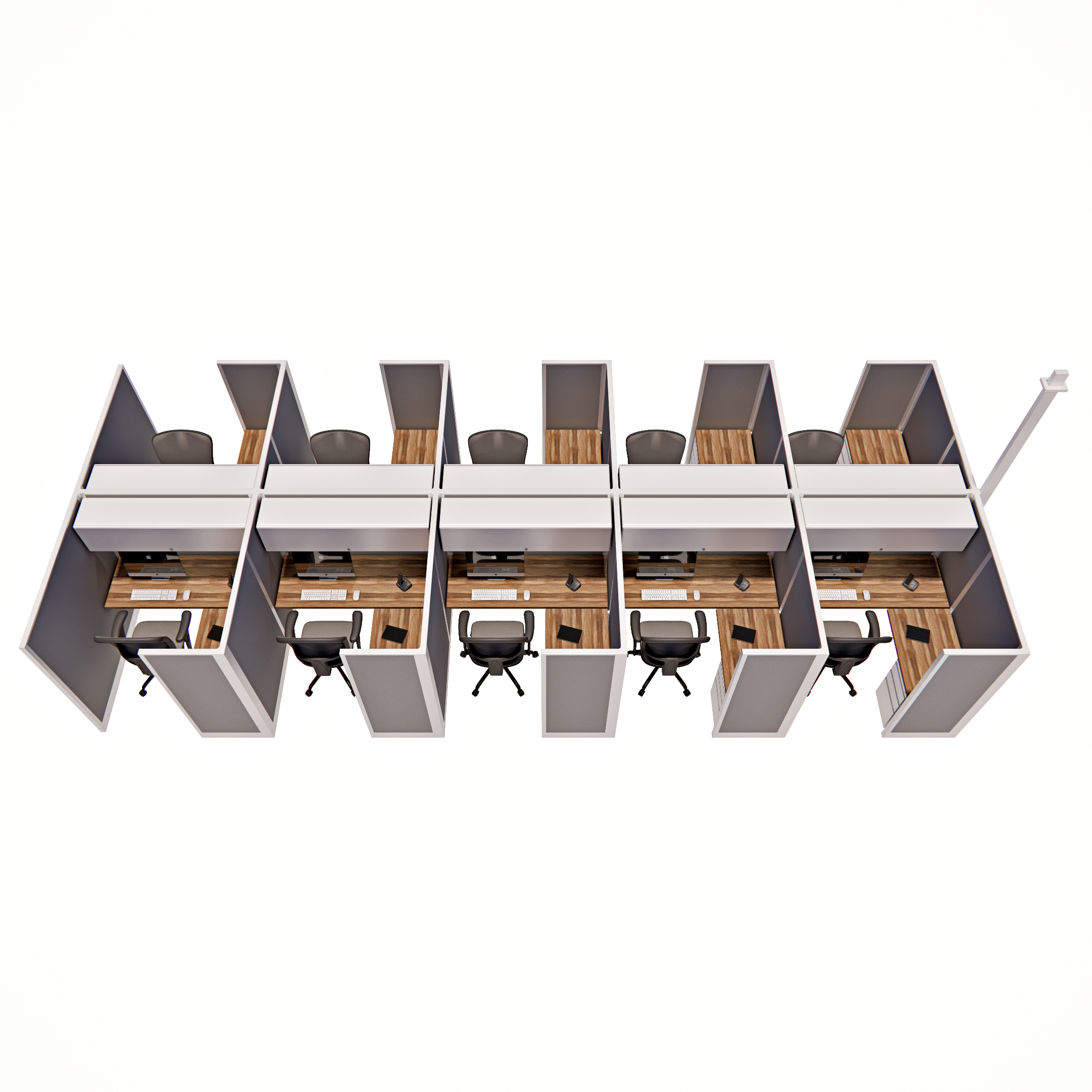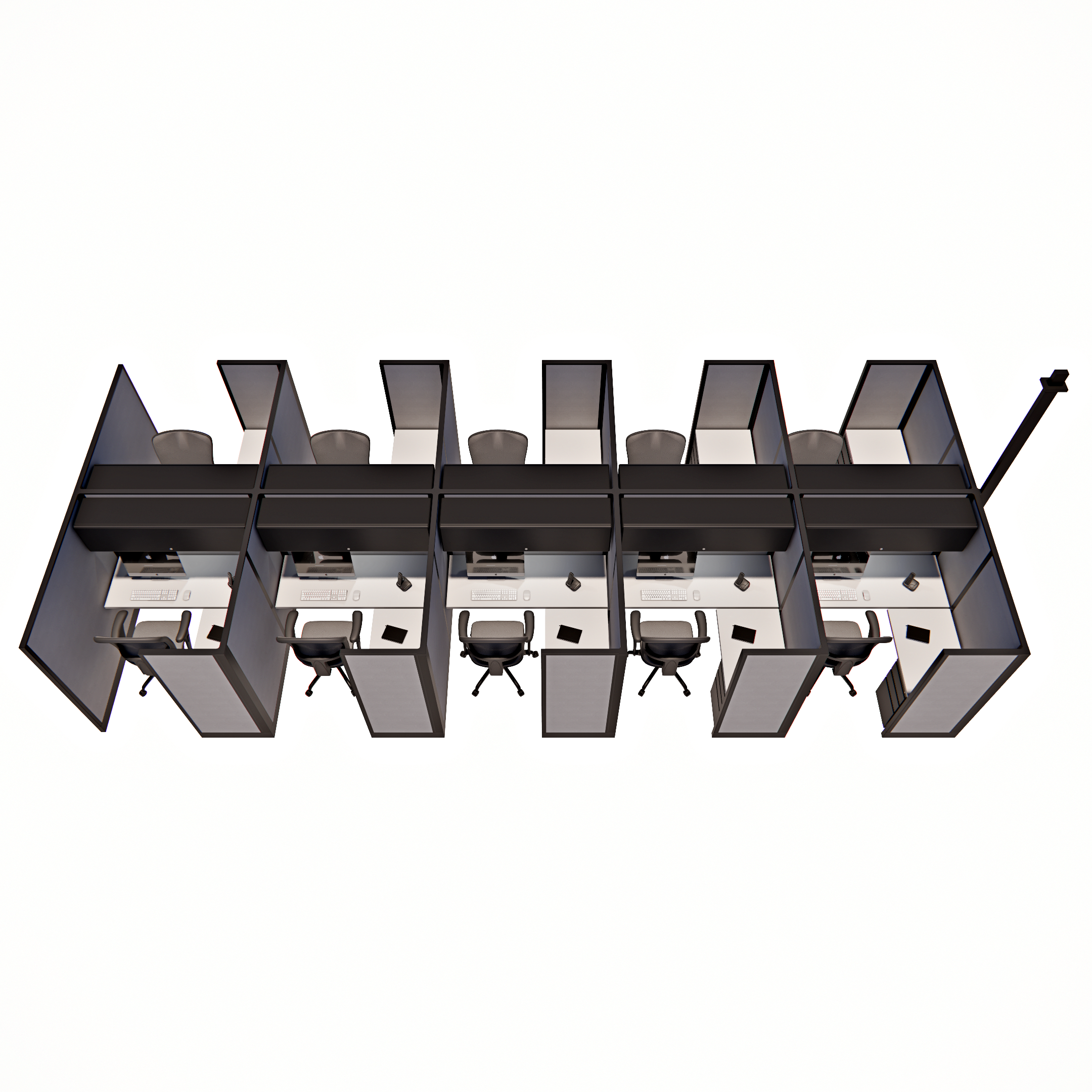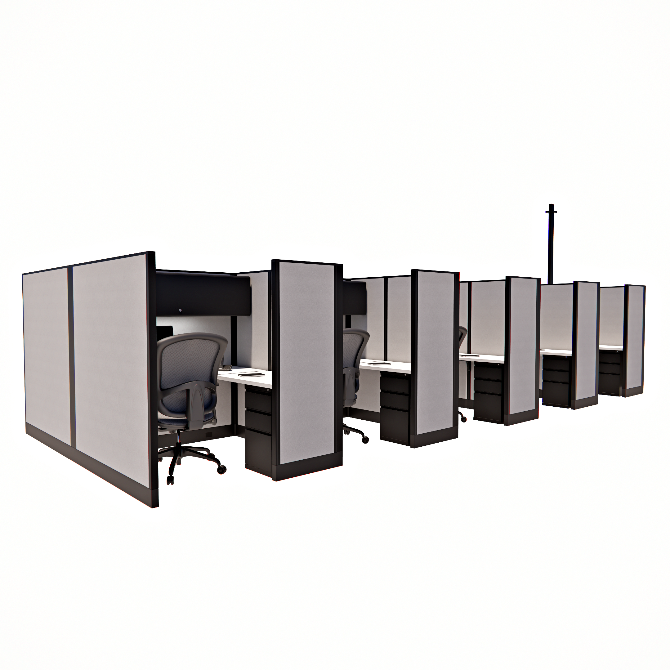 This 67-inch tall pod of ten office cubicles, each with a 5 by 5-foot workspace, is designed to maximize office space while providing employees with privacy and functionality. Each cubicle includes ample room for desks, storage, and essential work items. The 67-inch height offers a balance of privacy and openness, reducing distractions while maintaining a collaborative atmosphere. This setup is ideal for larger teams or departments that need individual workstations with easy access to one another in a shared environment.