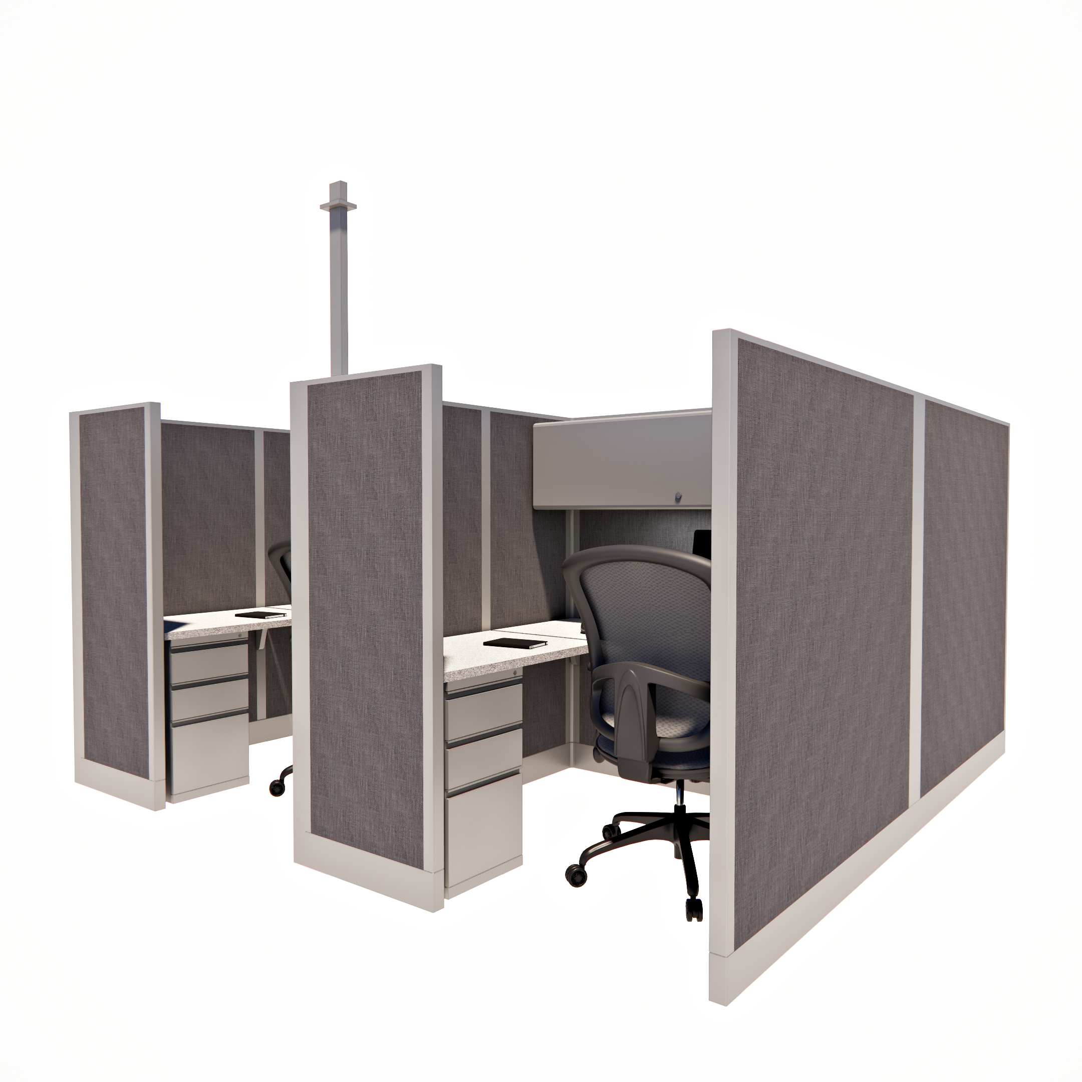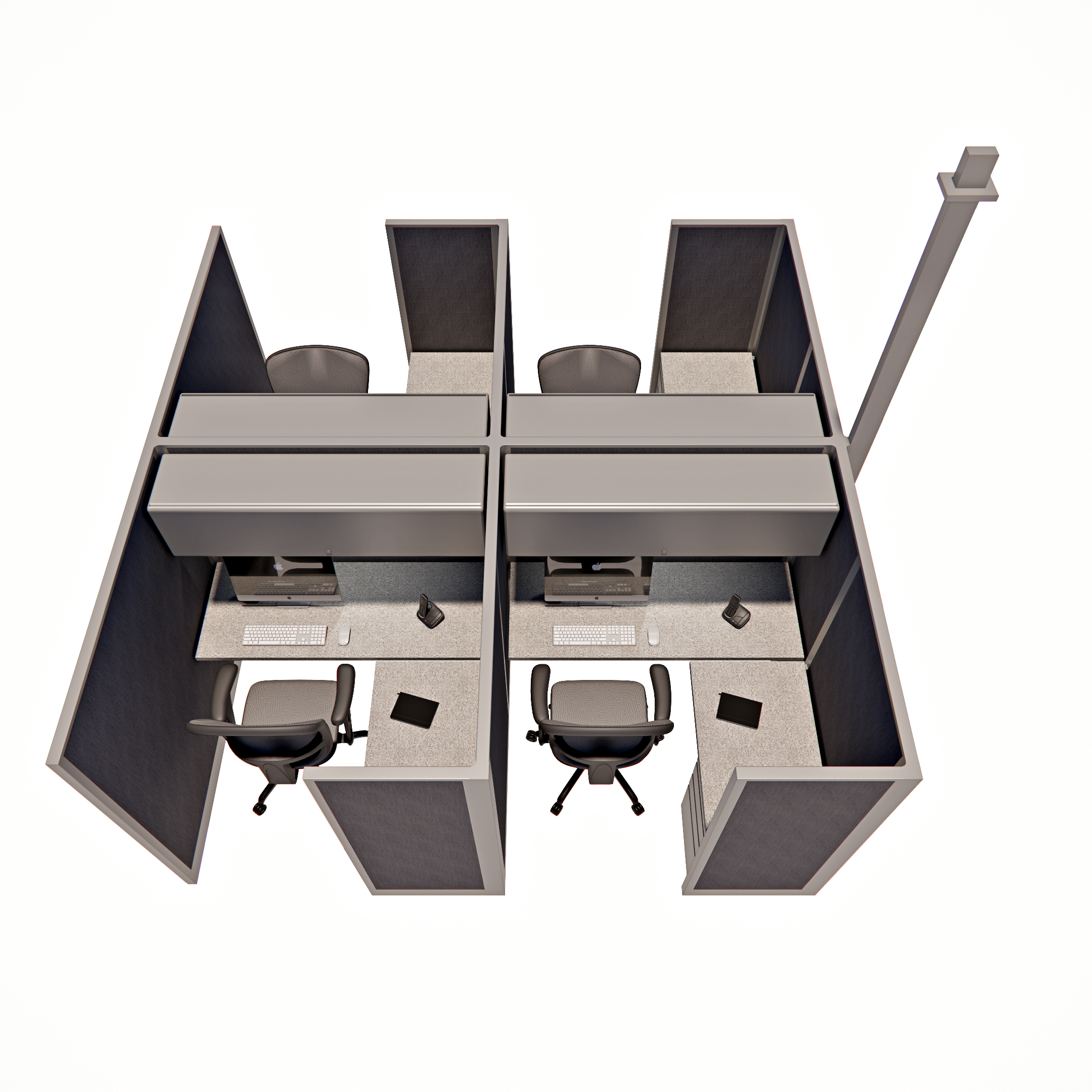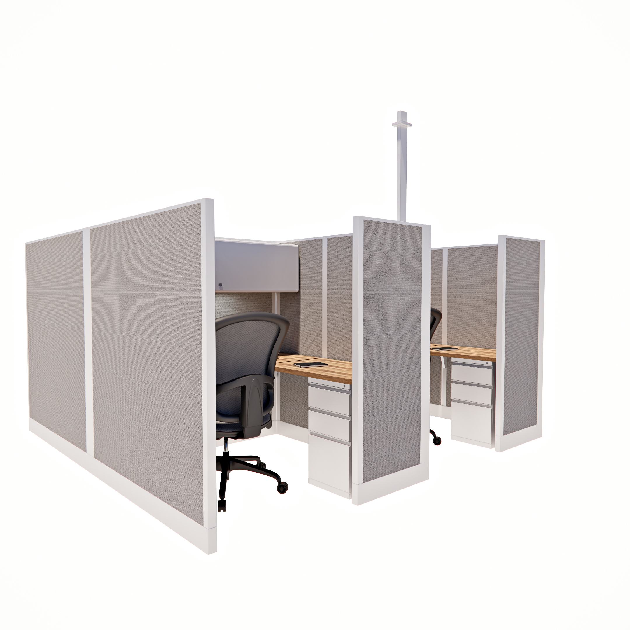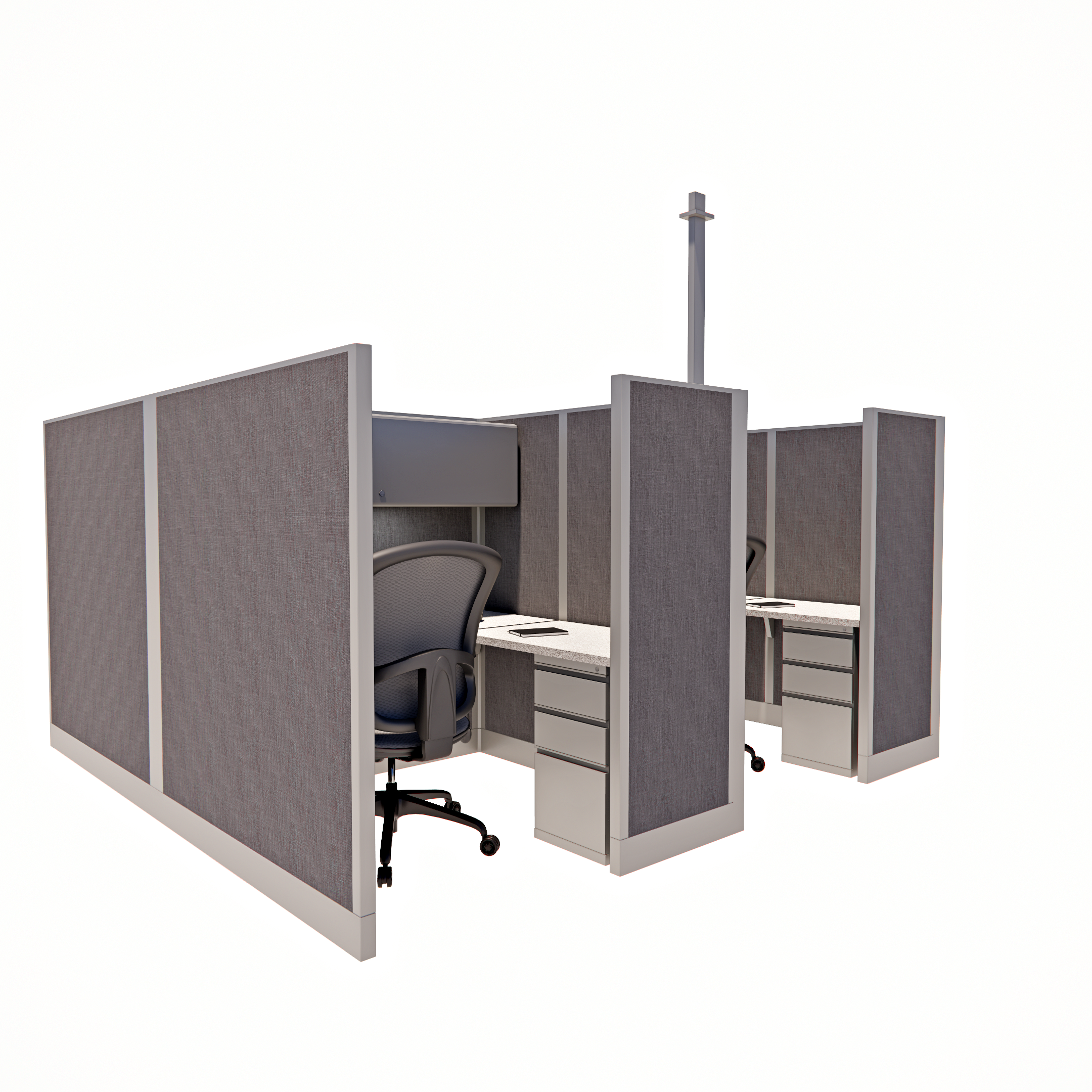 This pod of four 67-inch tall office cubicles, each with a 5 by 5-foot layout, creates a balanced workspace that promotes both collaboration and privacy. Each cubicle offers ample room for desks, storage, and office essentials, while the 67-inch height provides a degree of separation to support focused work. This configuration is ideal for team settings where individuals benefit from both personal workspace and easy accessibility to colleagues.
