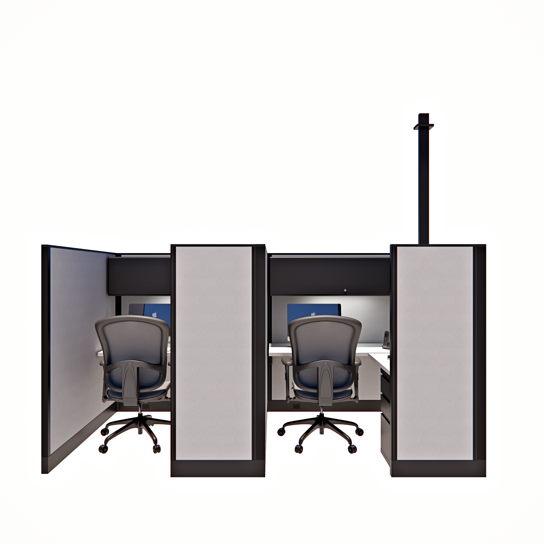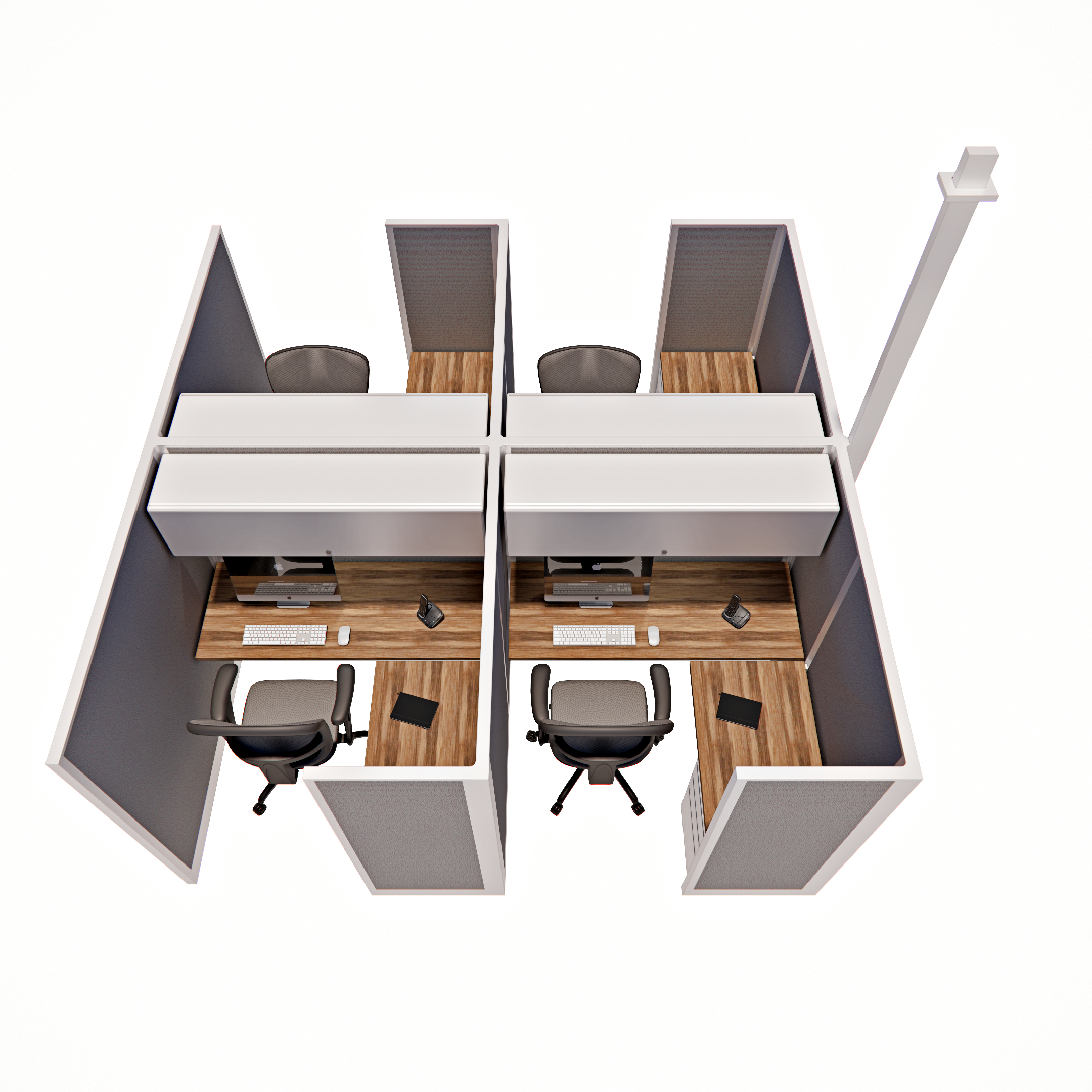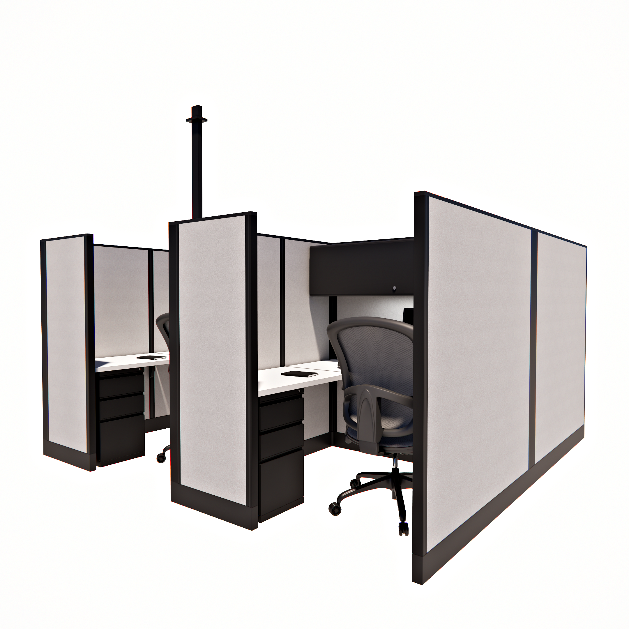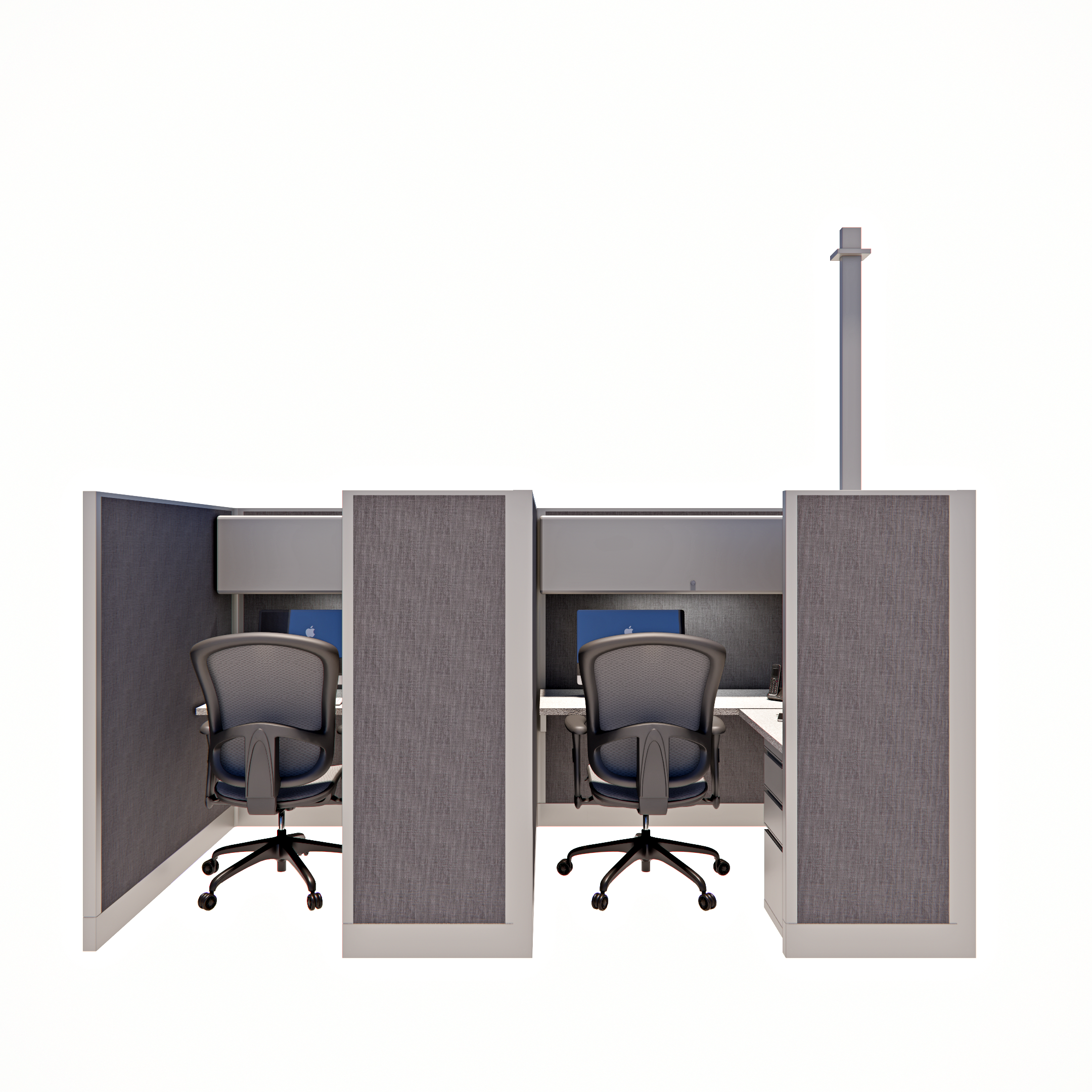 This pod of four 67-inch tall office cubicles, each with a 5 by 5-foot layout, creates a balanced workspace that promotes both collaboration and privacy. Each cubicle offers ample room for desks, storage, and office essentials, while the 67-inch height provides a degree of separation to support focused work. This configuration is ideal for team settings where individuals benefit from both personal workspace and easy accessibility to colleagues.