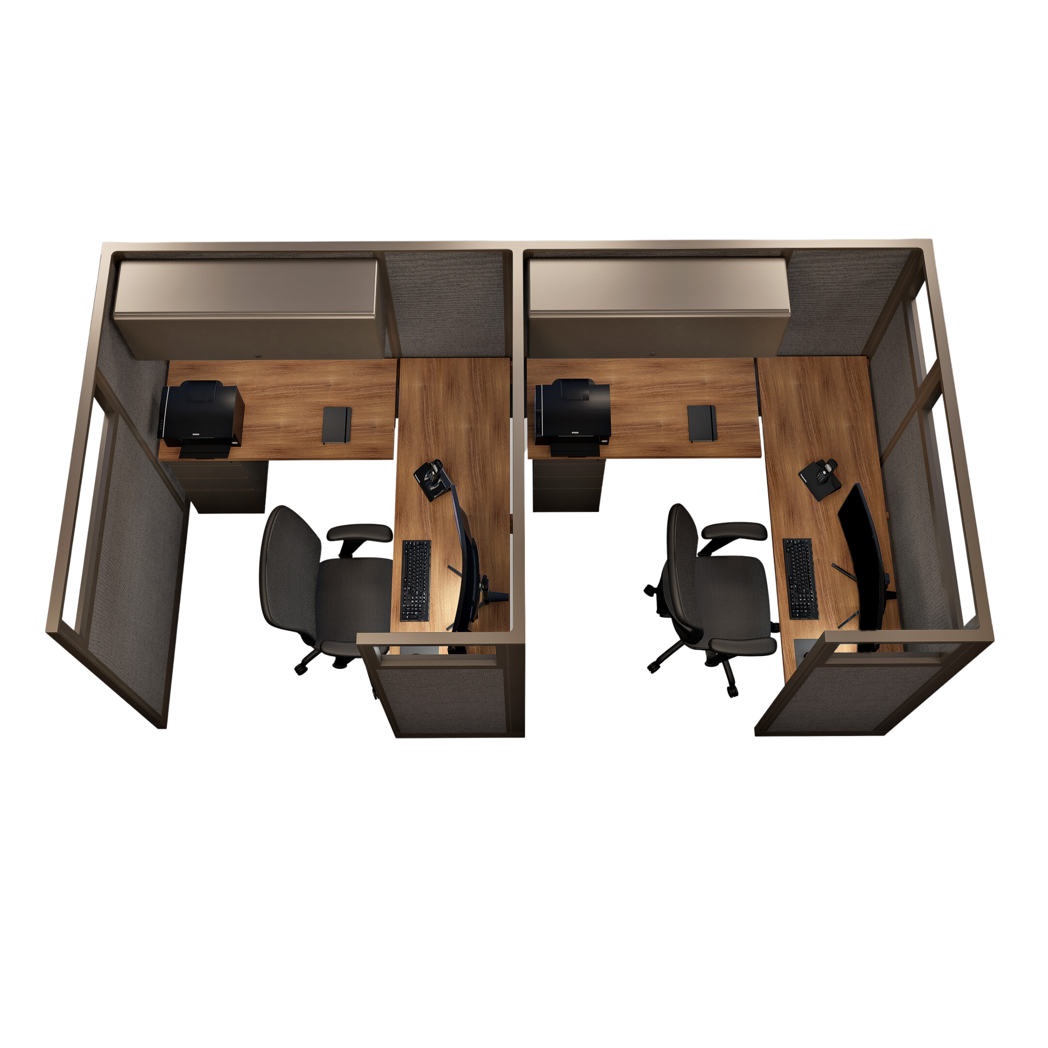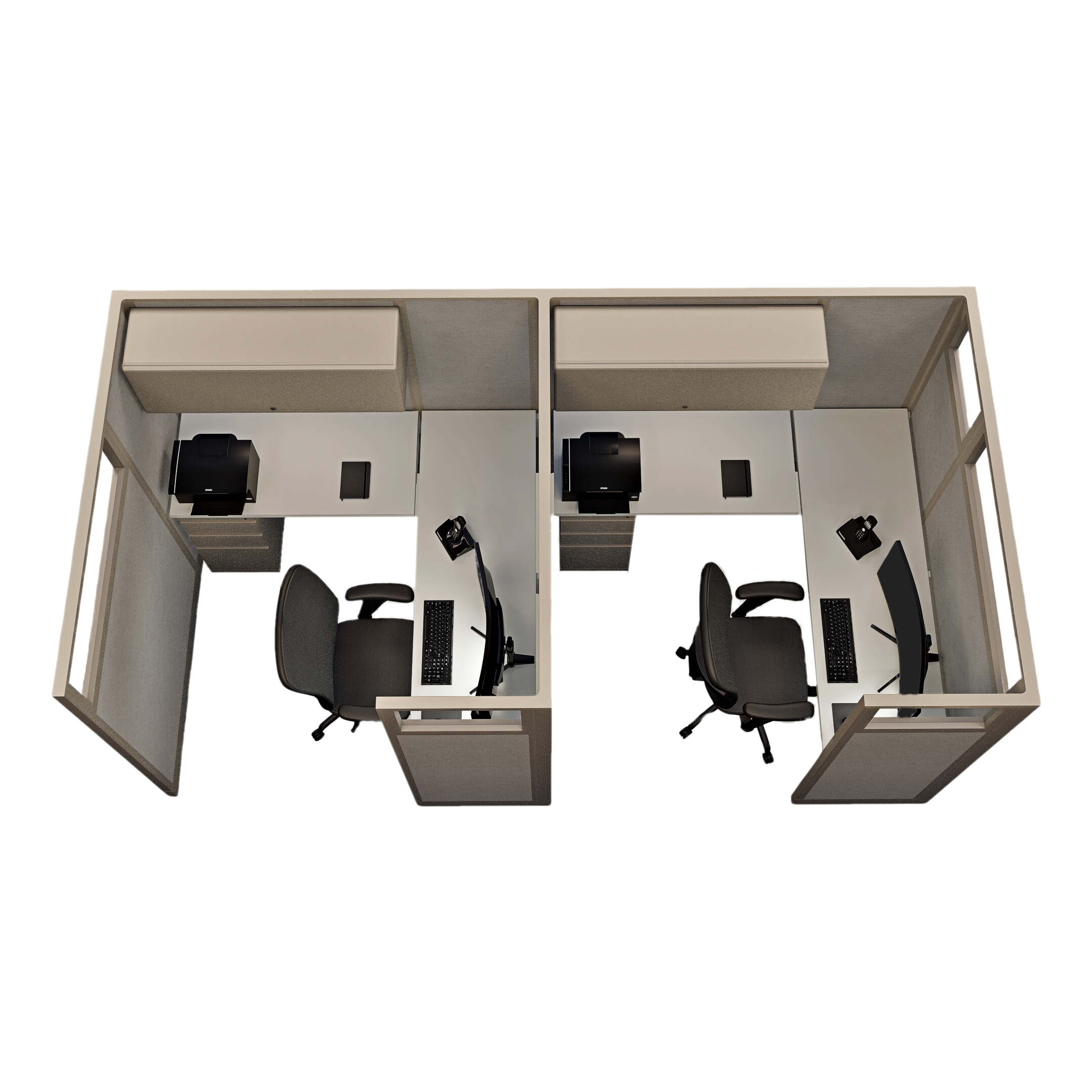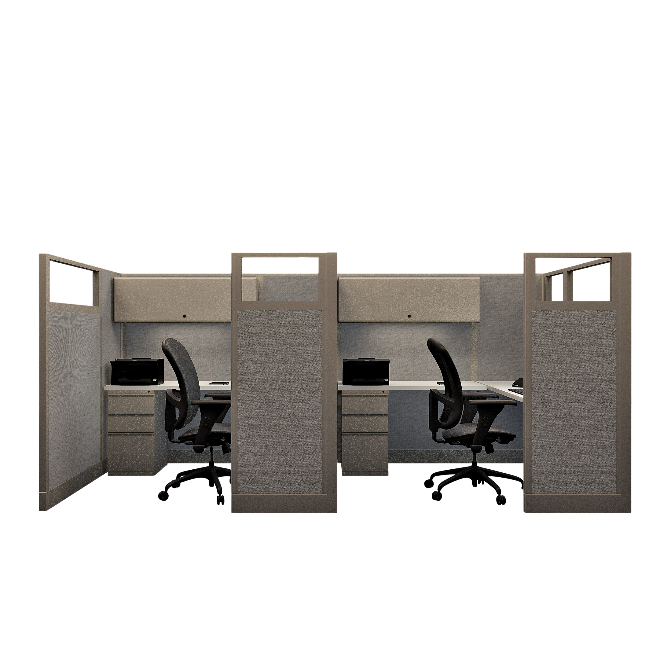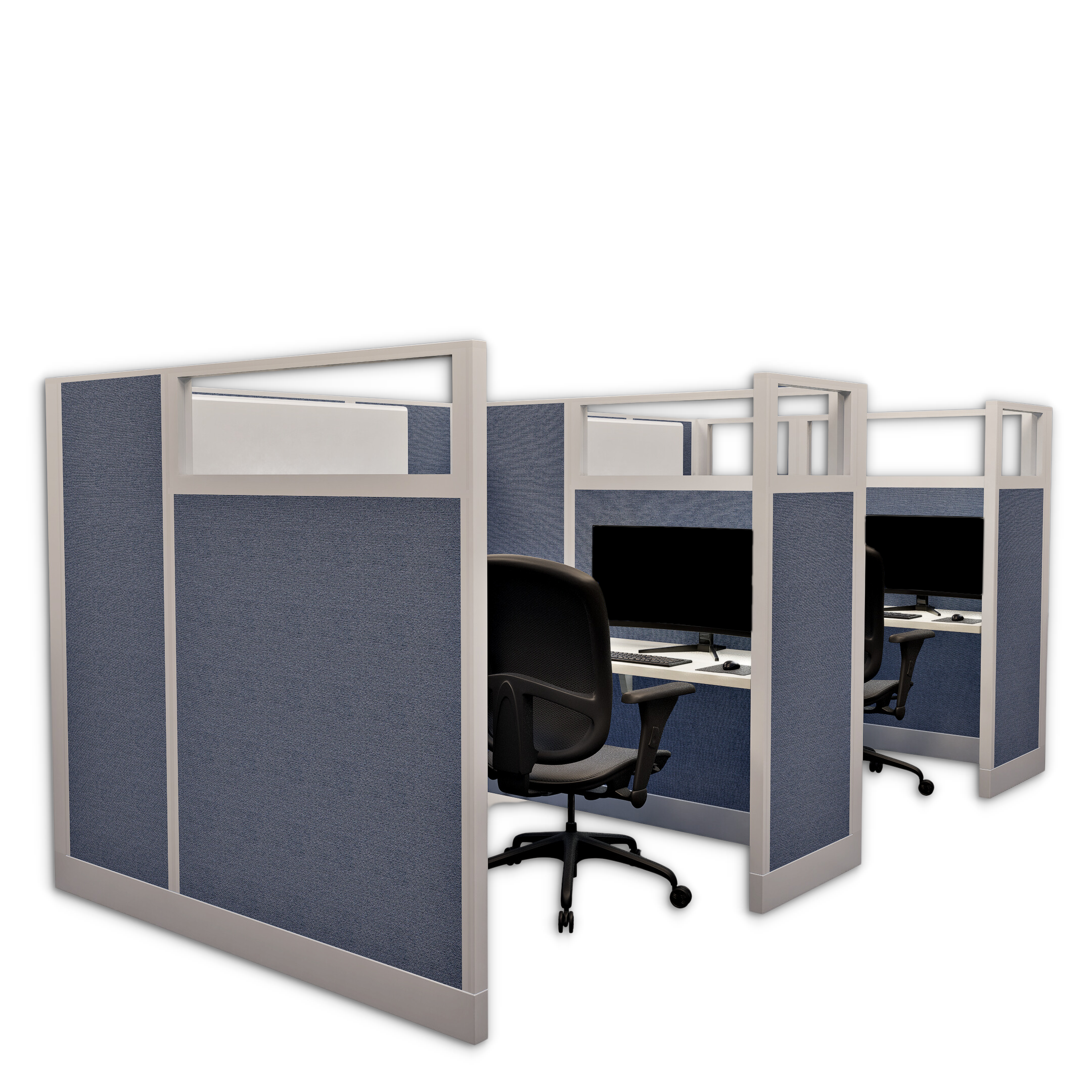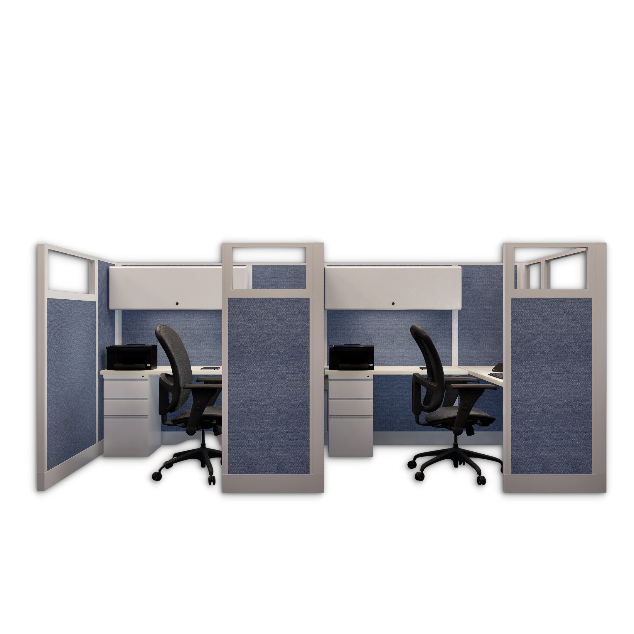 This line of two 67-inch tall office cubicles, each measuring 6 by 6 feet, offers a private and spacious setup with glass panels that allow natural light to enhance the workspace. Each cubicle is equipped with a pedestal for organized storage, an enclosed overhead bin for additional space, and an LED task light to improve visibility and focus. This configuration is ideal for pairs who need individual workstations with ample room and privacy while benefiting from a connected, open feel.