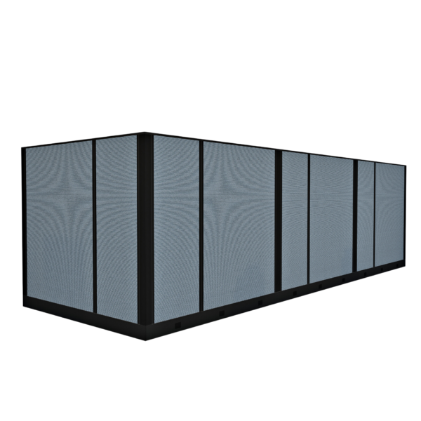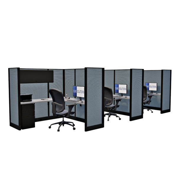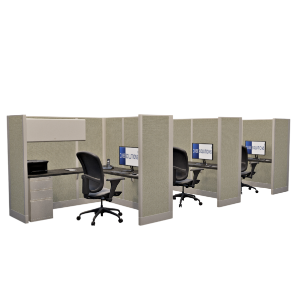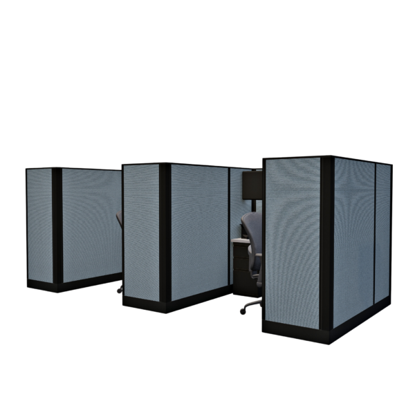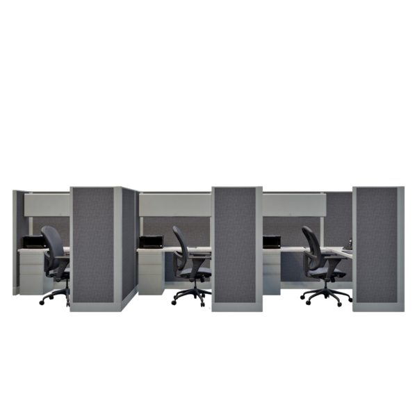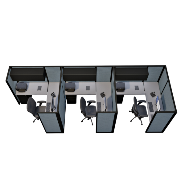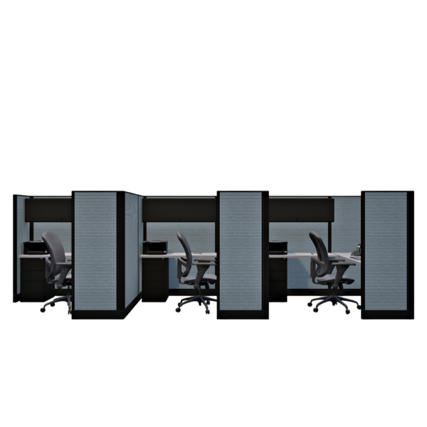 This line of three 67-inch tall office cubicles, each with a 6 by 6-foot workspace, offers a combination of privacy and collaboration for small teams. Each cubicle provides ample room for desks, storage, and office essentials, while the 67-inch height helps reduce noise and distractions. This configuration is perfect for teams that need individual workspaces with easy access to one another, creating an ideal balance of personal focus and team interaction in a shared office environment.