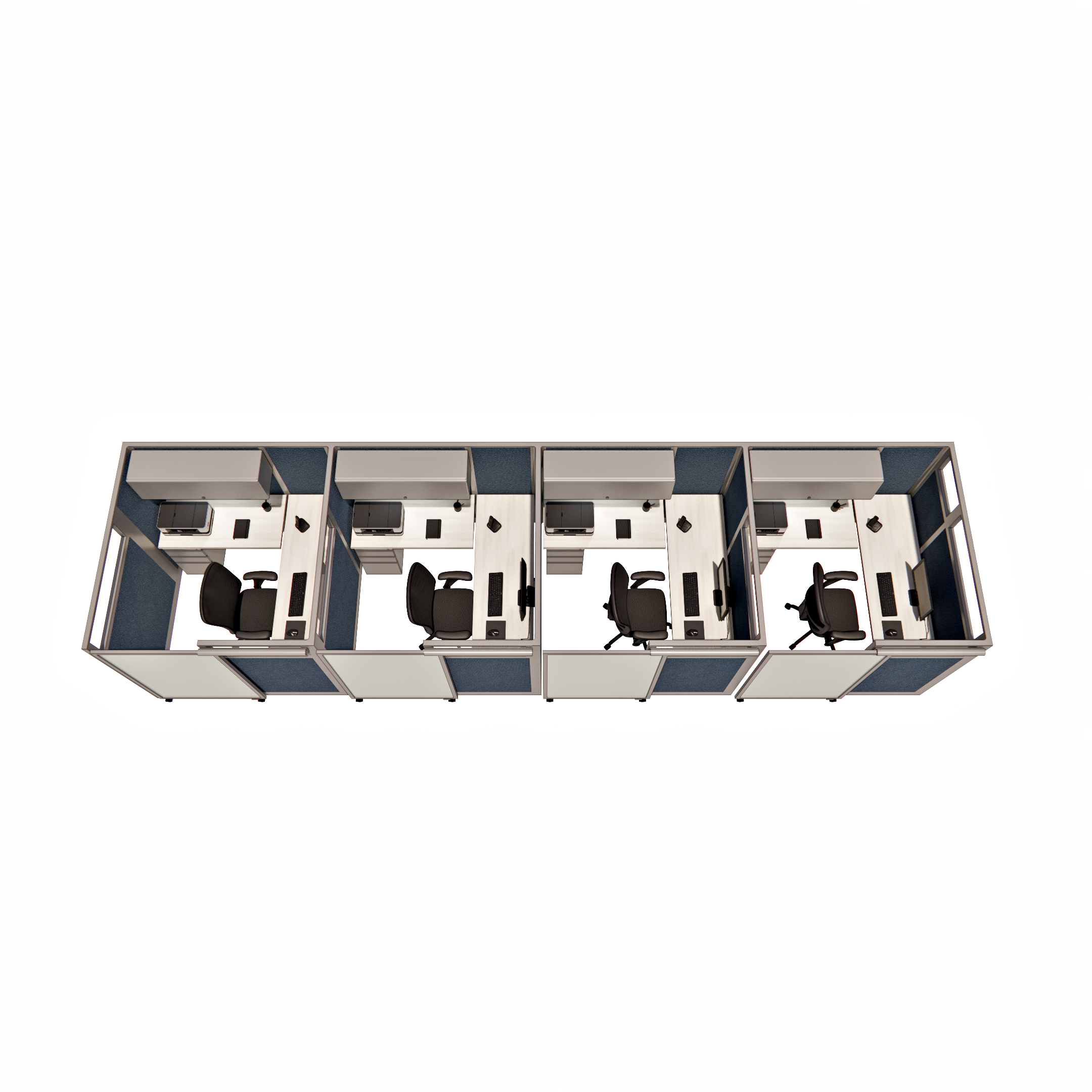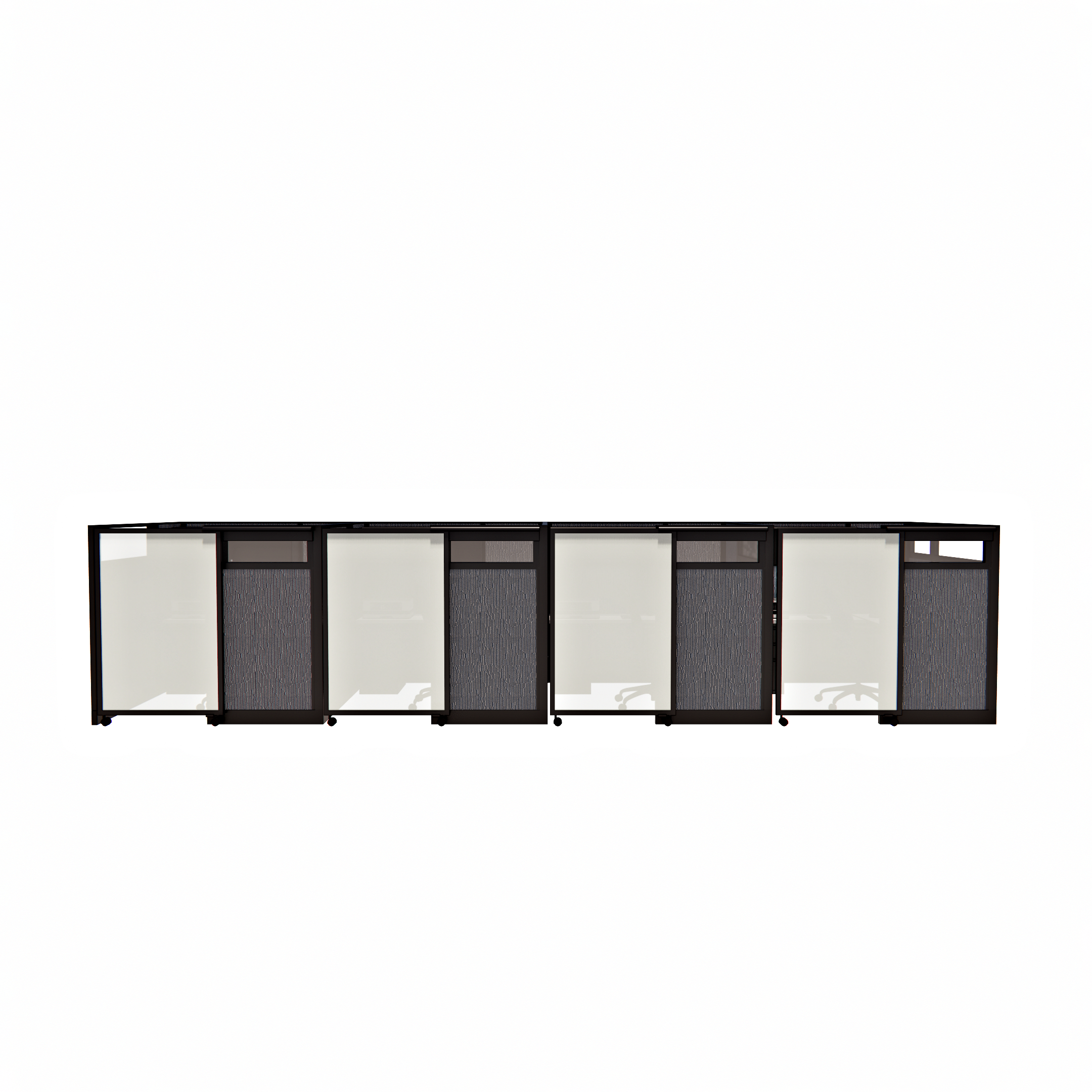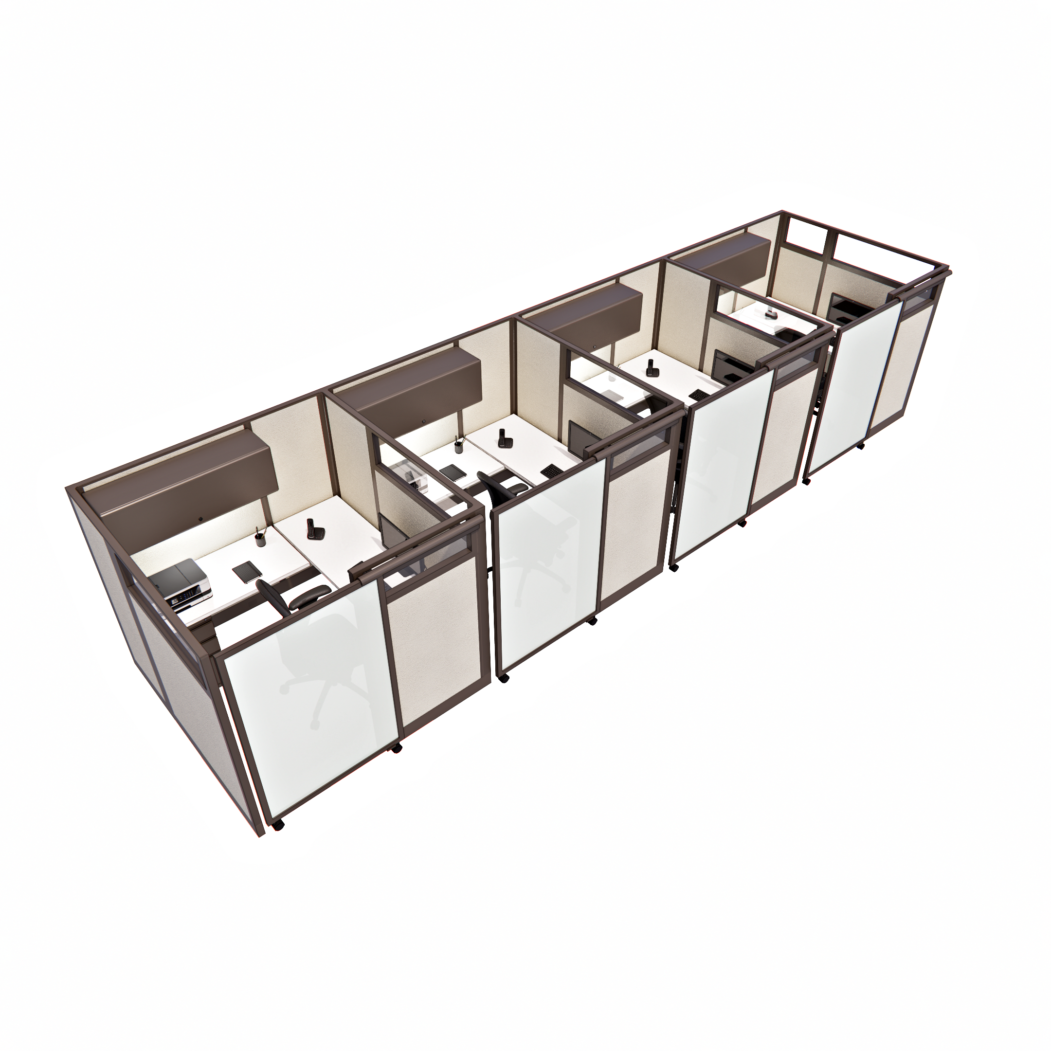 This line of four 67-inch tall glass office cubicles, each with a 6 by 6-foot layout, combines transparency with privacy through glass panels and sliding plexiglass doors for each cubicle. The non-locking sliding doors provide convenient access while minimizing floor space usage, allowing each workstation to feel open yet private. Ideal for teams who need individual, enclosed workspaces, this configuration brings in natural light, supporting a professional, collaborative environment with a modern, streamlined design.