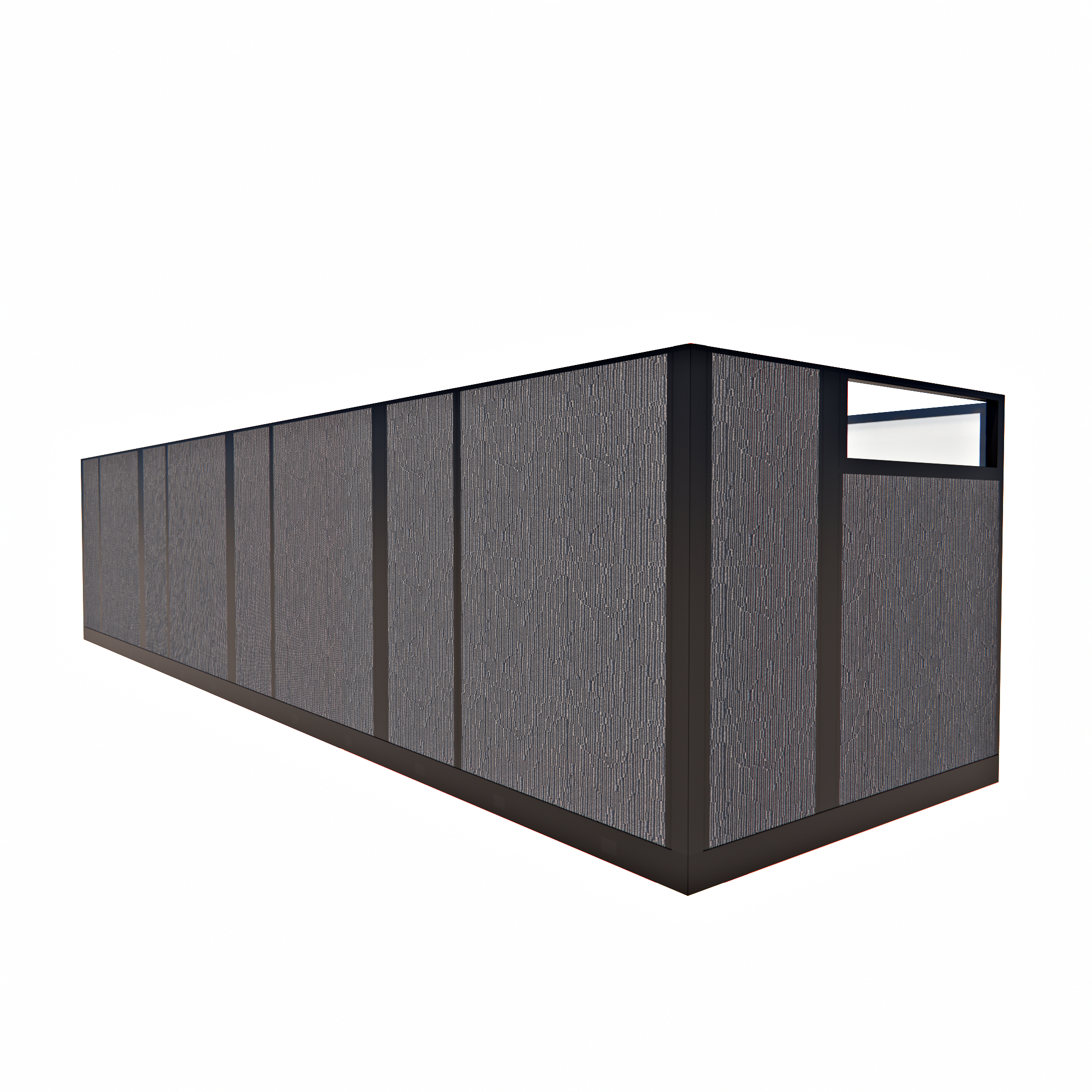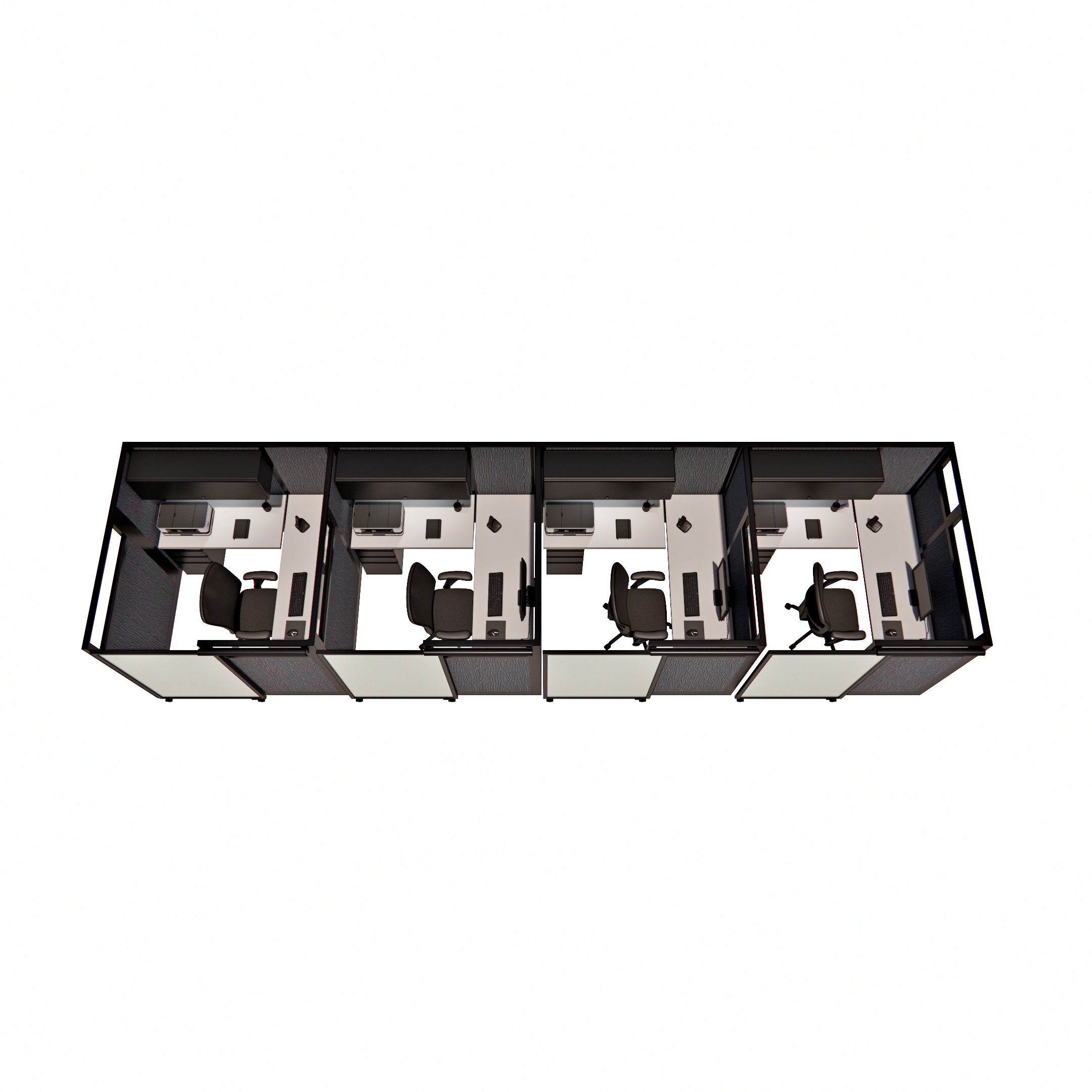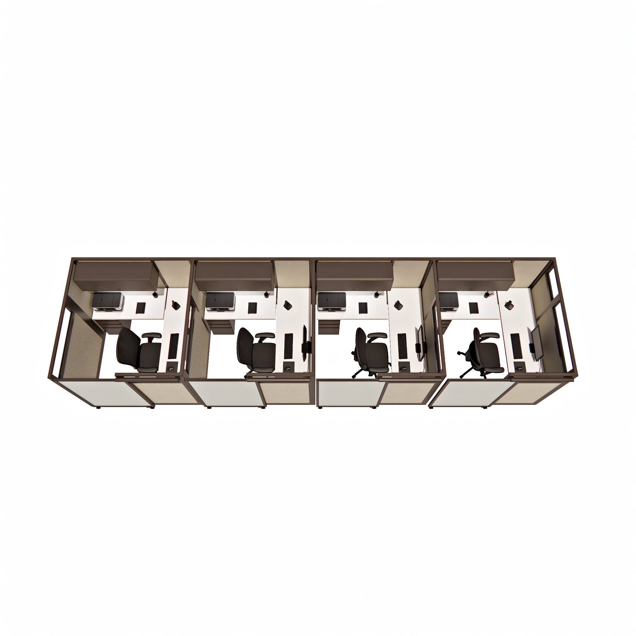 This line of four 67-inch tall glass office cubicles, each with a 6 by 6-foot layout, combines transparency with privacy through glass panels and sliding plexiglass doors for each cubicle. The non-locking sliding doors provide convenient access while minimizing floor space usage, allowing each workstation to feel open yet private. Ideal for teams who need individual, enclosed workspaces, this configuration brings in natural light, supporting a professional, collaborative environment with a modern, streamlined design.