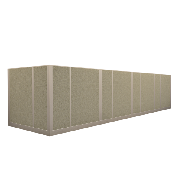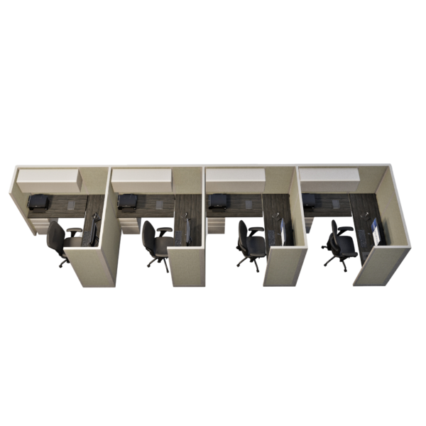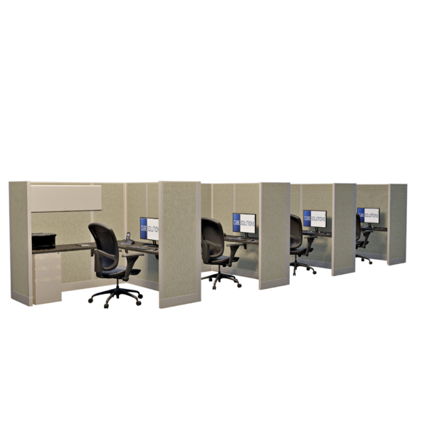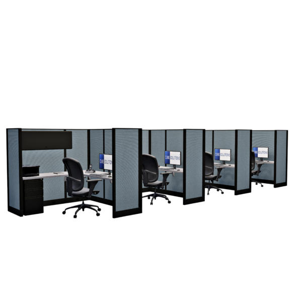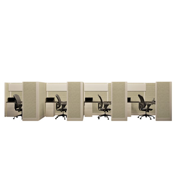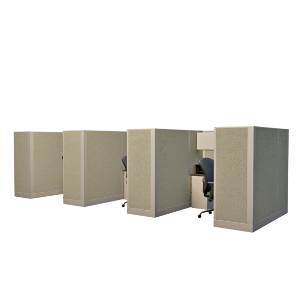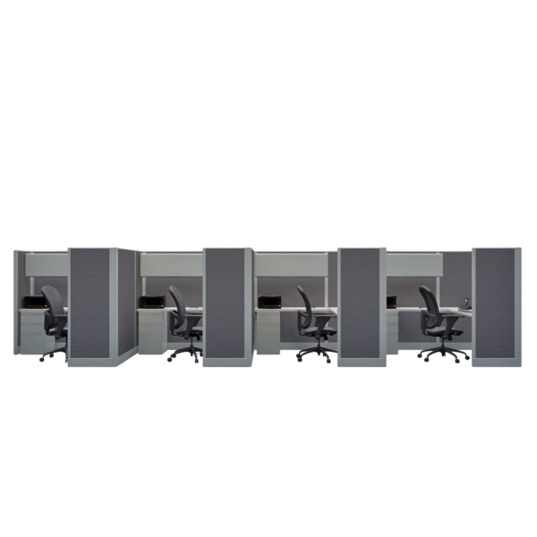 This line of four 67-inch tall office cubicles, each measuring 6 by 6 feet, is designed to provide ample workspace while maintaining privacy for each individual. The layout offers enough room for a complete desk setup, storage, and office essentials, with the 67-inch height helping to reduce distractions and enhance focus. This configuration is ideal for small teams or departments that require separate workstations within a shared, collaborative environment, offering a good balance of privacy and team accessibility.