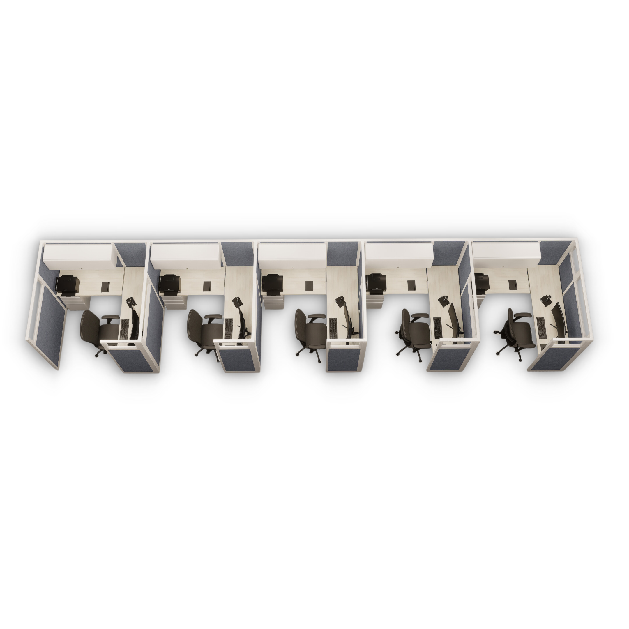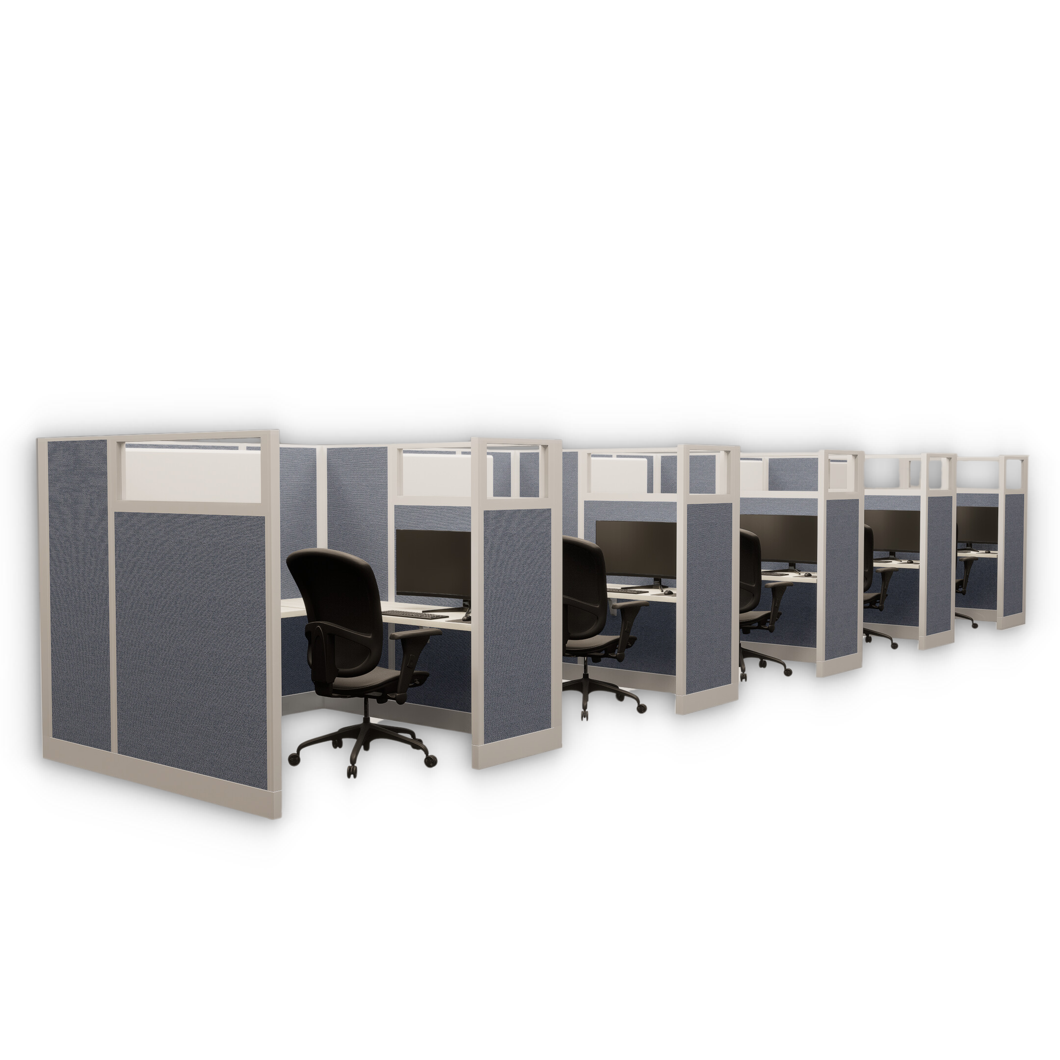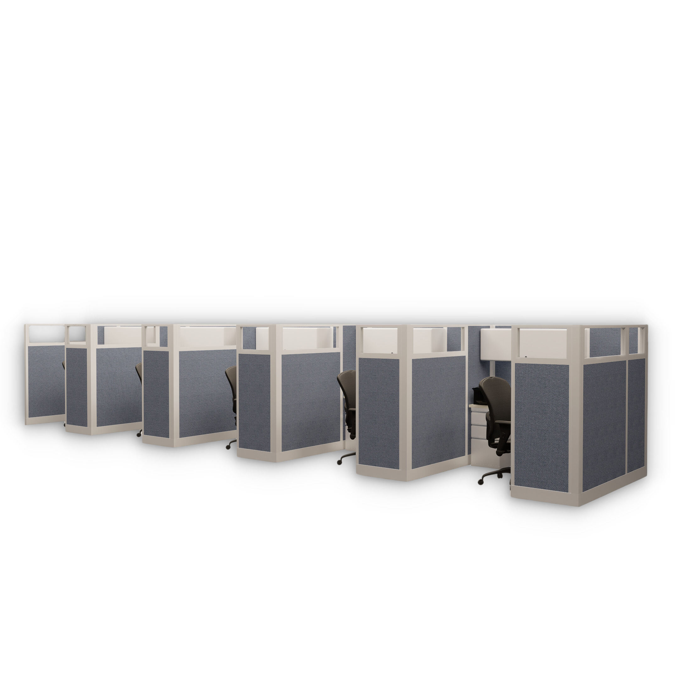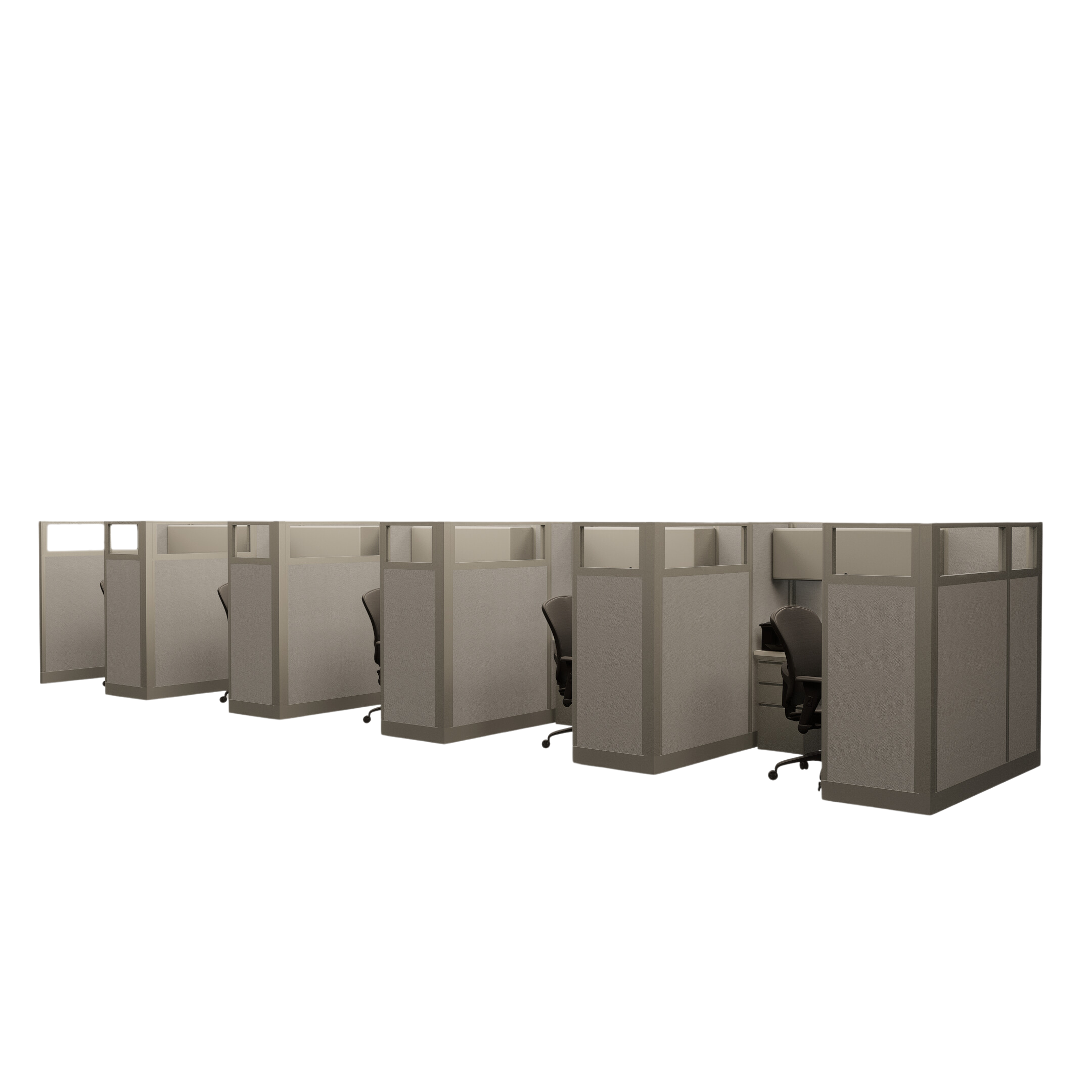 This line of five 67-inch tall office cubicles, each measuring 6 by 6 feet, is designed to provide privacy and an open feel with glass panels that allow natural light to flow through the workspace. Ideal for teams who need individual workstations while maintaining a sense of connection, each cubicle offers ample space for focused work within a sleek, modern design. This configuration is perfect for creating a row of private yet visually open offices, enhancing both productivity and collaboration in a shared office environment.