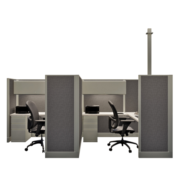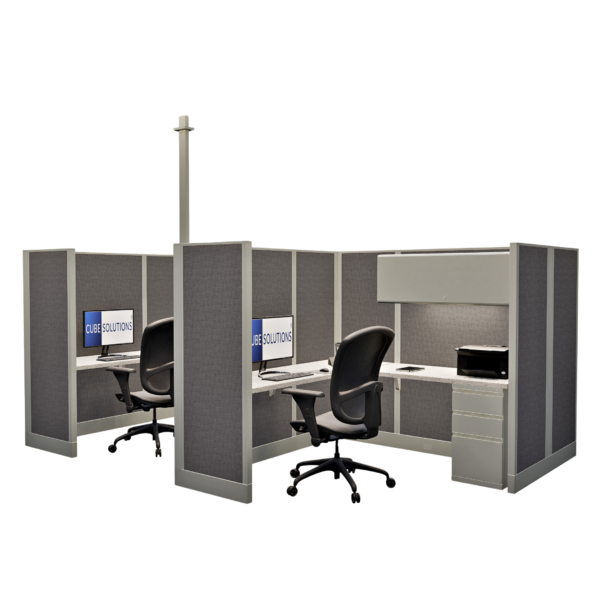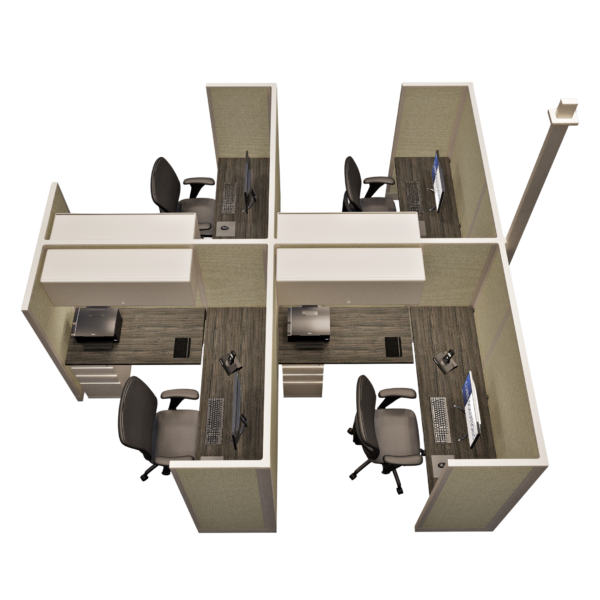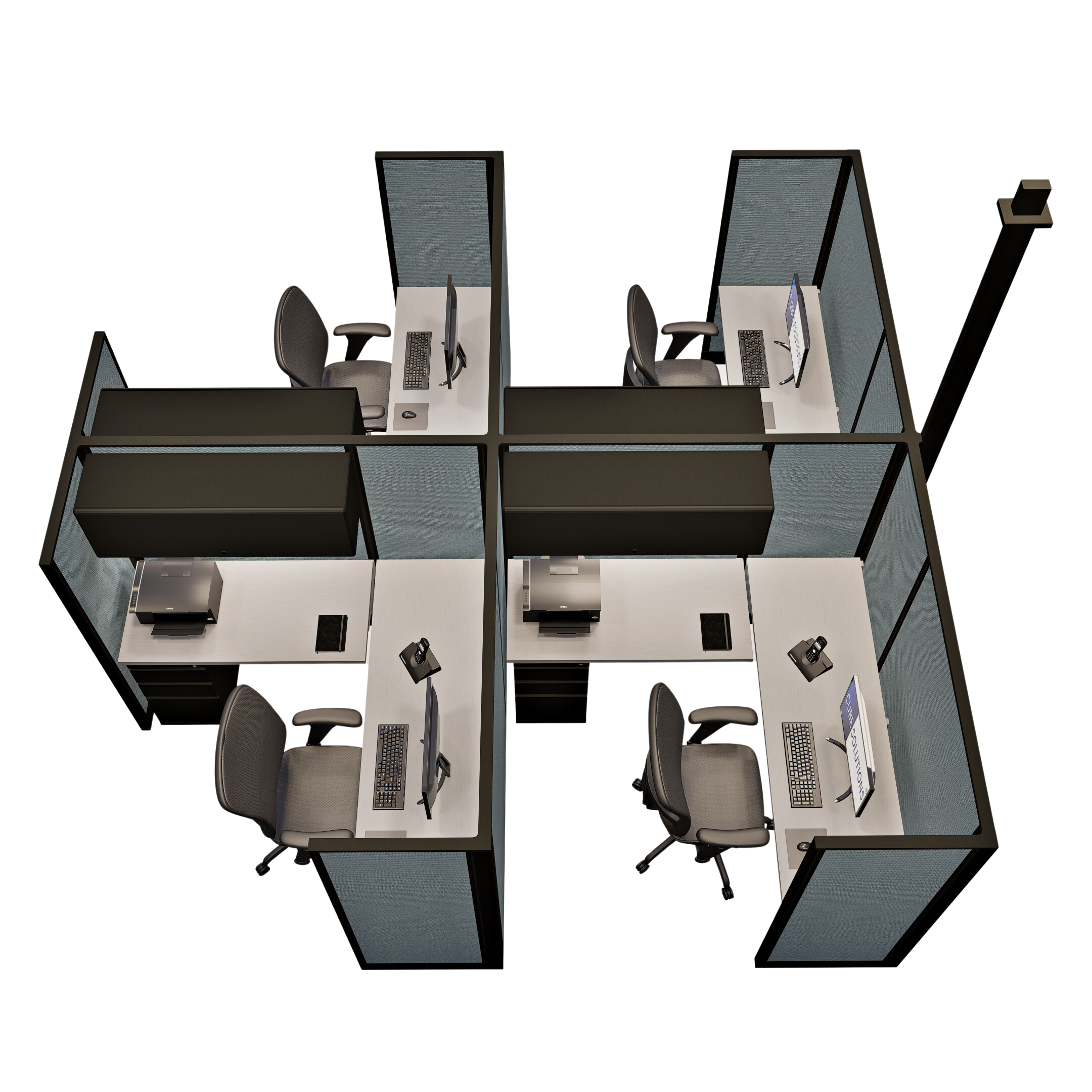 This pod of four 67-inch tall office cubicles, each measuring 6 by 6 feet, offers a spacious yet private workspace for a small team. The 6×6 layout provides ample room for desks, storage, and essential office items, while the 67-inch height offers privacy and reduces distractions. This configuration is perfect for departments or small teams that require individual workstations while still benefiting from a collaborative, accessible environment.