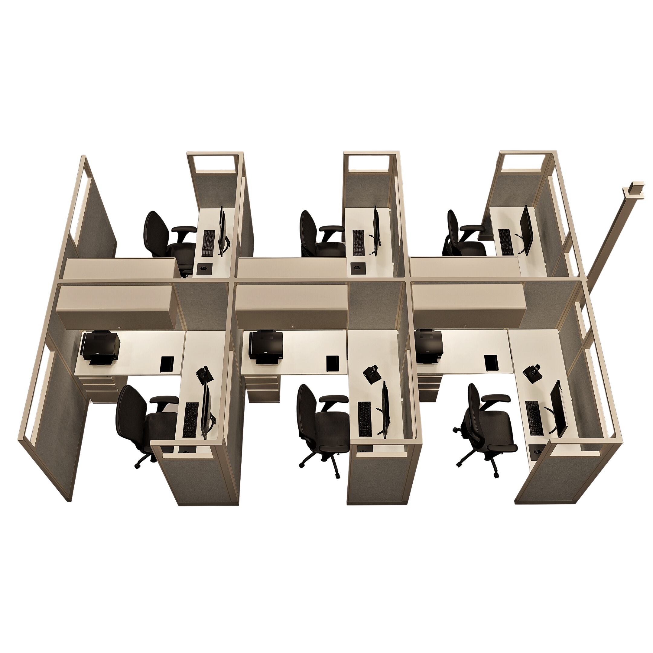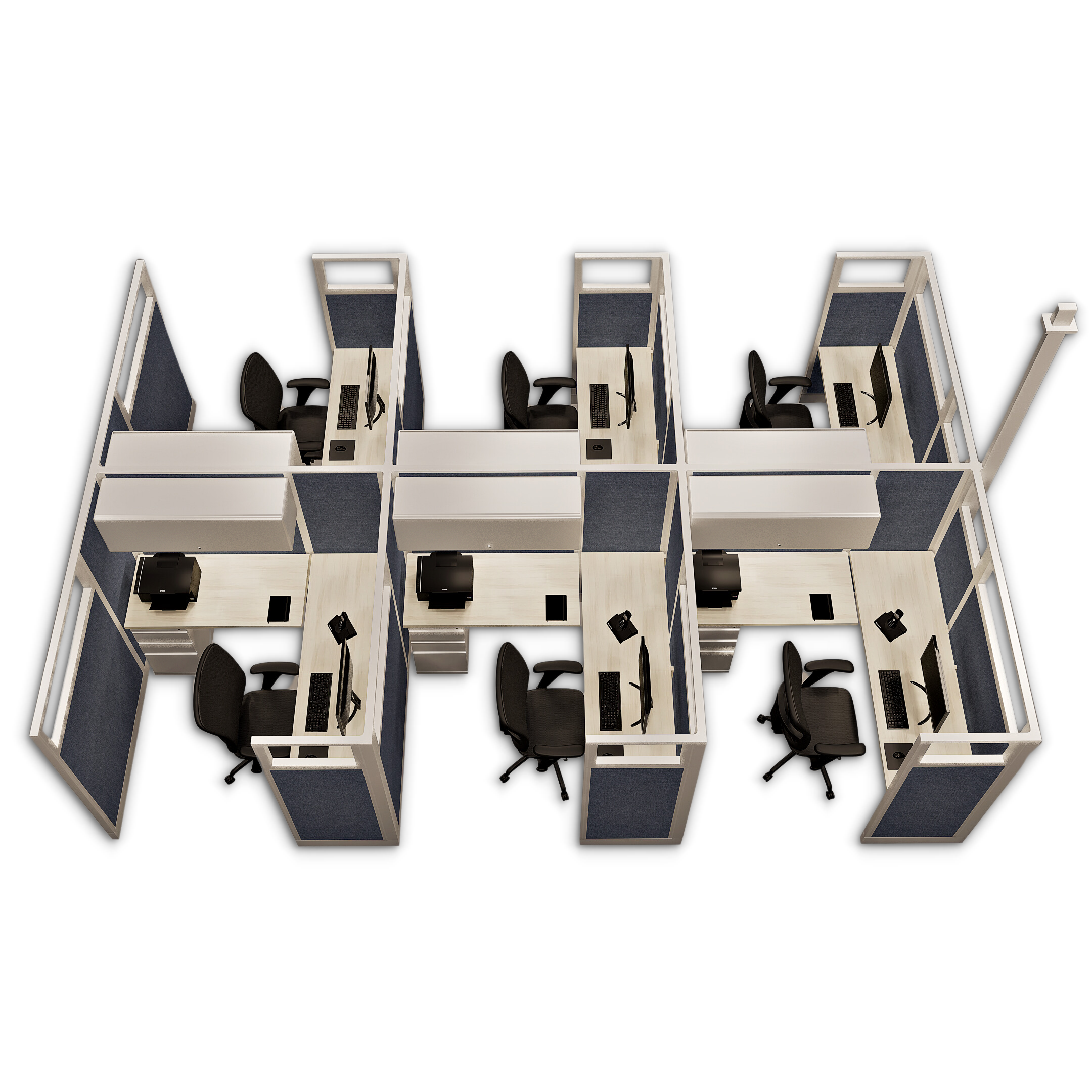 This pod of six 67-inch tall office cubicles, each measuring 6 by 6 feet, features glass panels that help bring in natural light and create an open, airy workspace while maintaining privacy. Each cubicle is equipped with a pedestal for organized storage, an enclosed overhead bin for additional space, and an LED task light to improve visibility and focus. This configuration is perfect for larger teams or departments, offering individual workstations that combine privacy with a sense of openness and connectivity, which is ideal for a collaborative office environment.