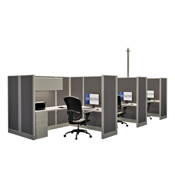 This is a standard cubicle configuration available in any quantity, with a combination of configurations and heights. They can be customized and modified to perfectly suit your space and specific needs. We offer discounts; options can be added or removed to accommodate your budget. Standard configurations provide a clear cost, while a space plan delivers a tailored solution.