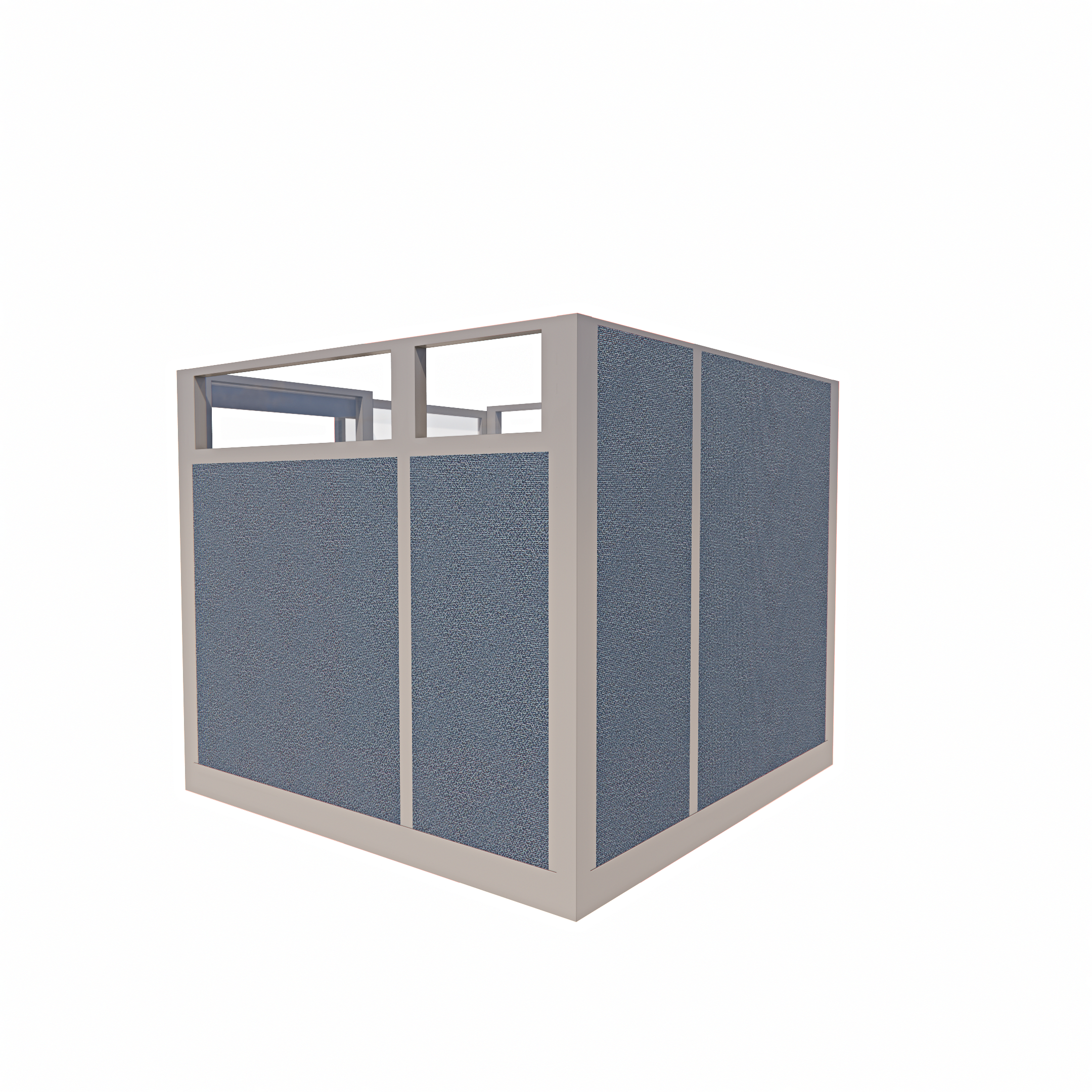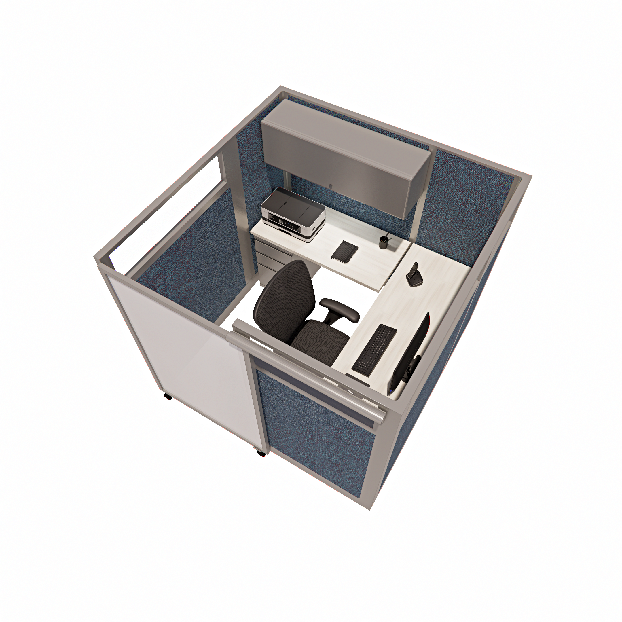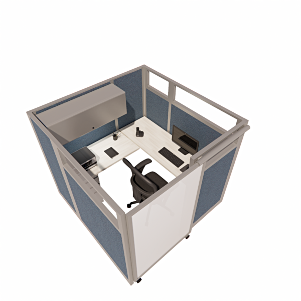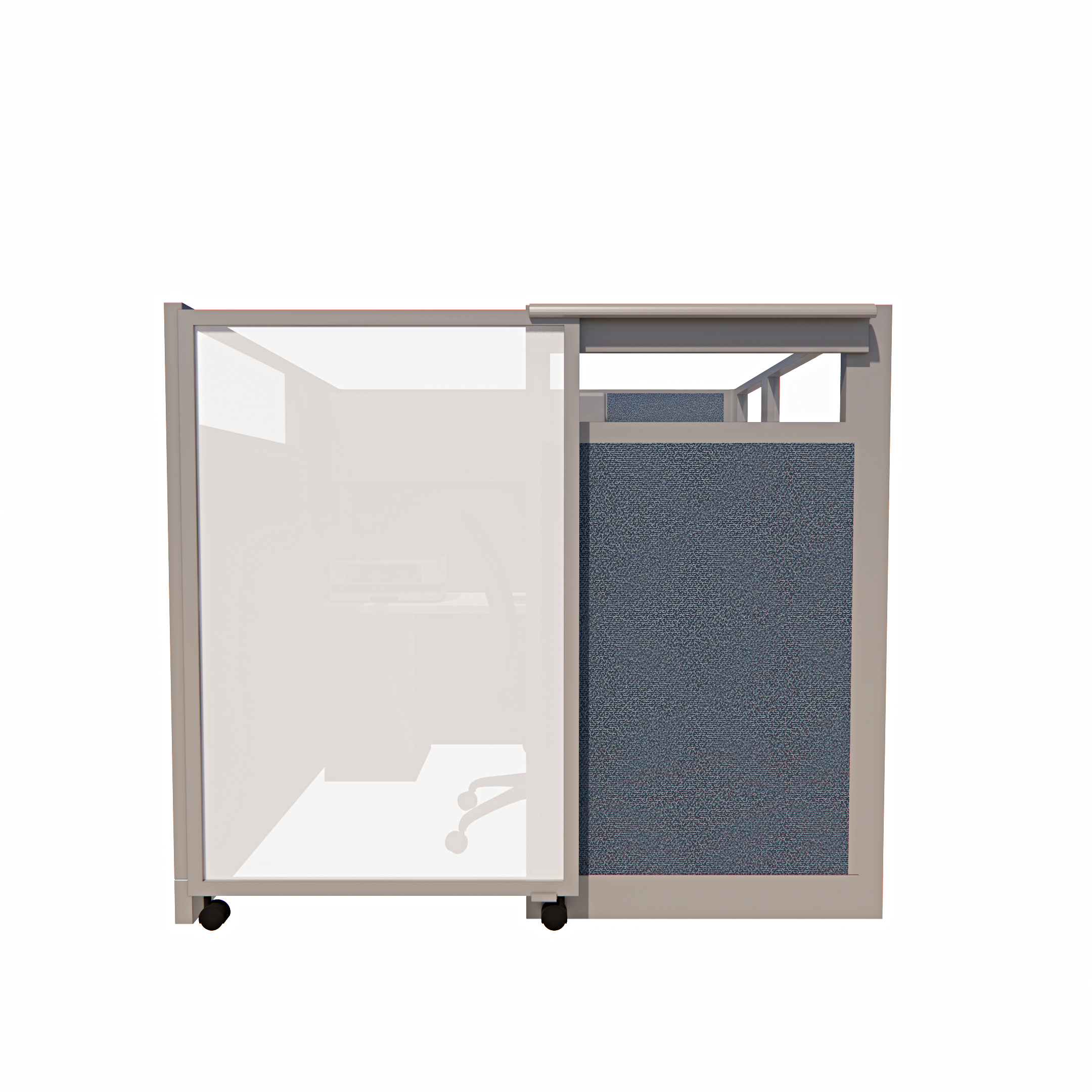 This 67-inch tall single office cubicle, sized at 6 by 6 feet, features sleek glass panels and a sliding plexiglass door. The non-locking plexiglass door minimizes impact on floor space while offering easy access and a degree of privacy. Ideal for individual workspaces, this configuration combines a private office feel with a modern, open design that allows natural light to flow, enhancing both comfort and productivity.