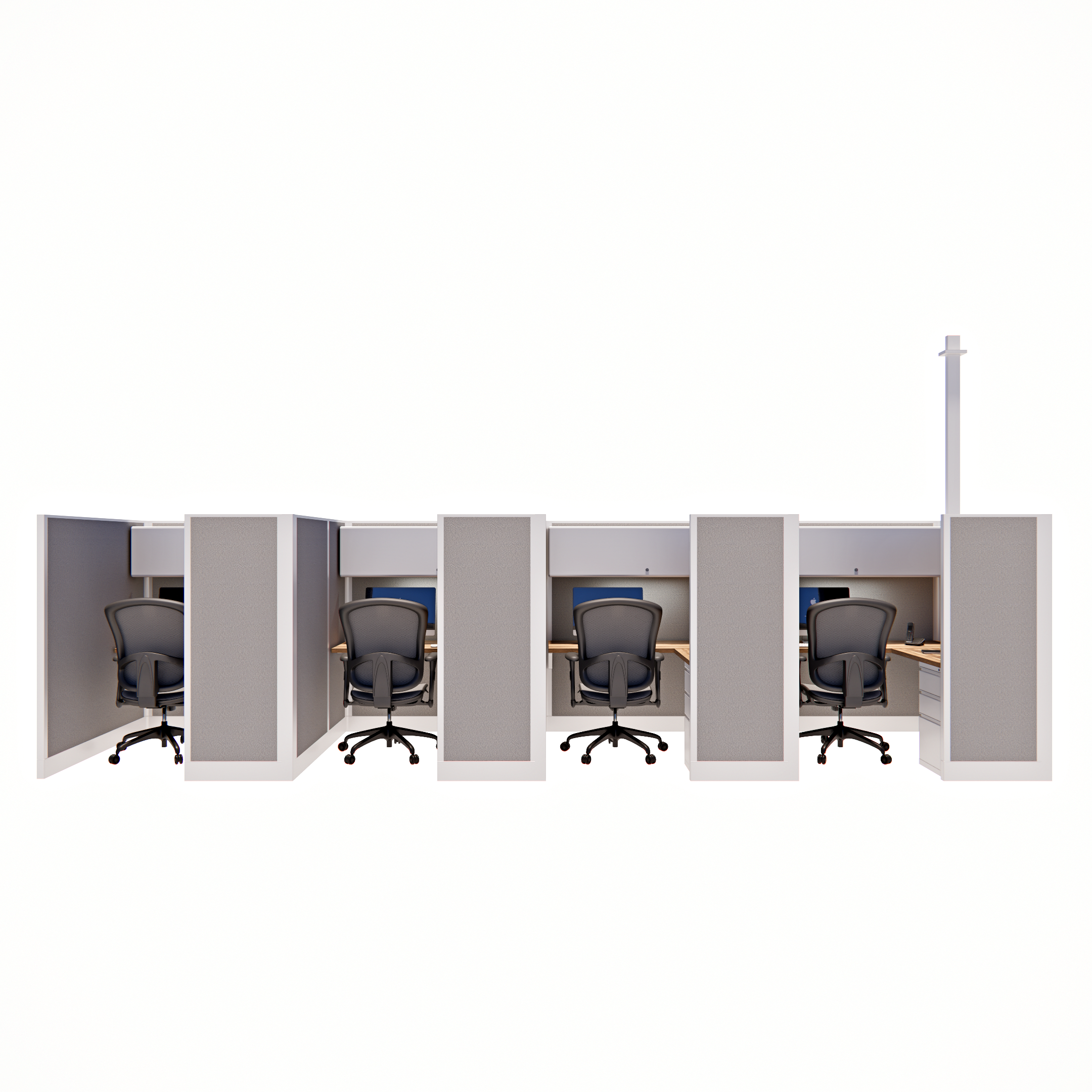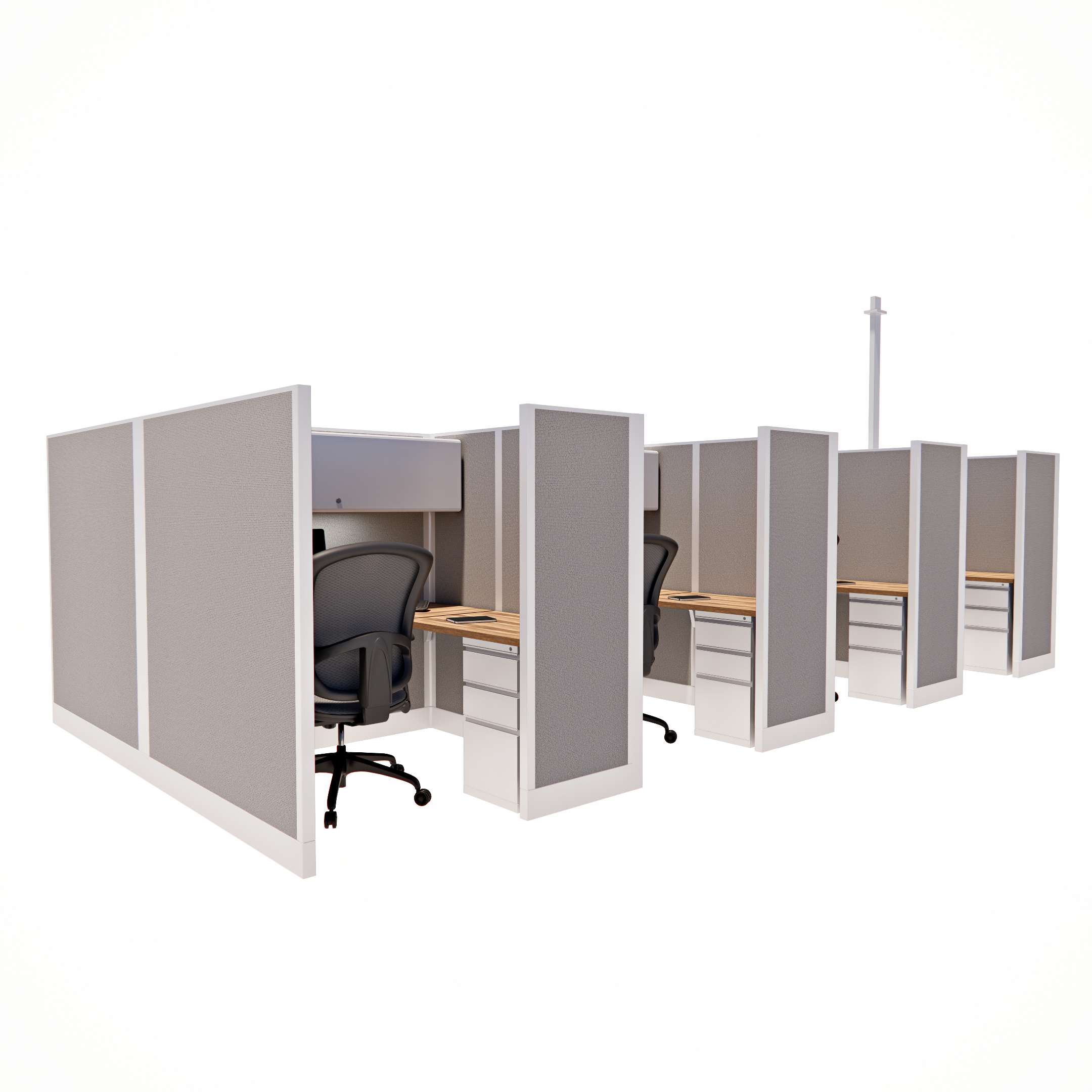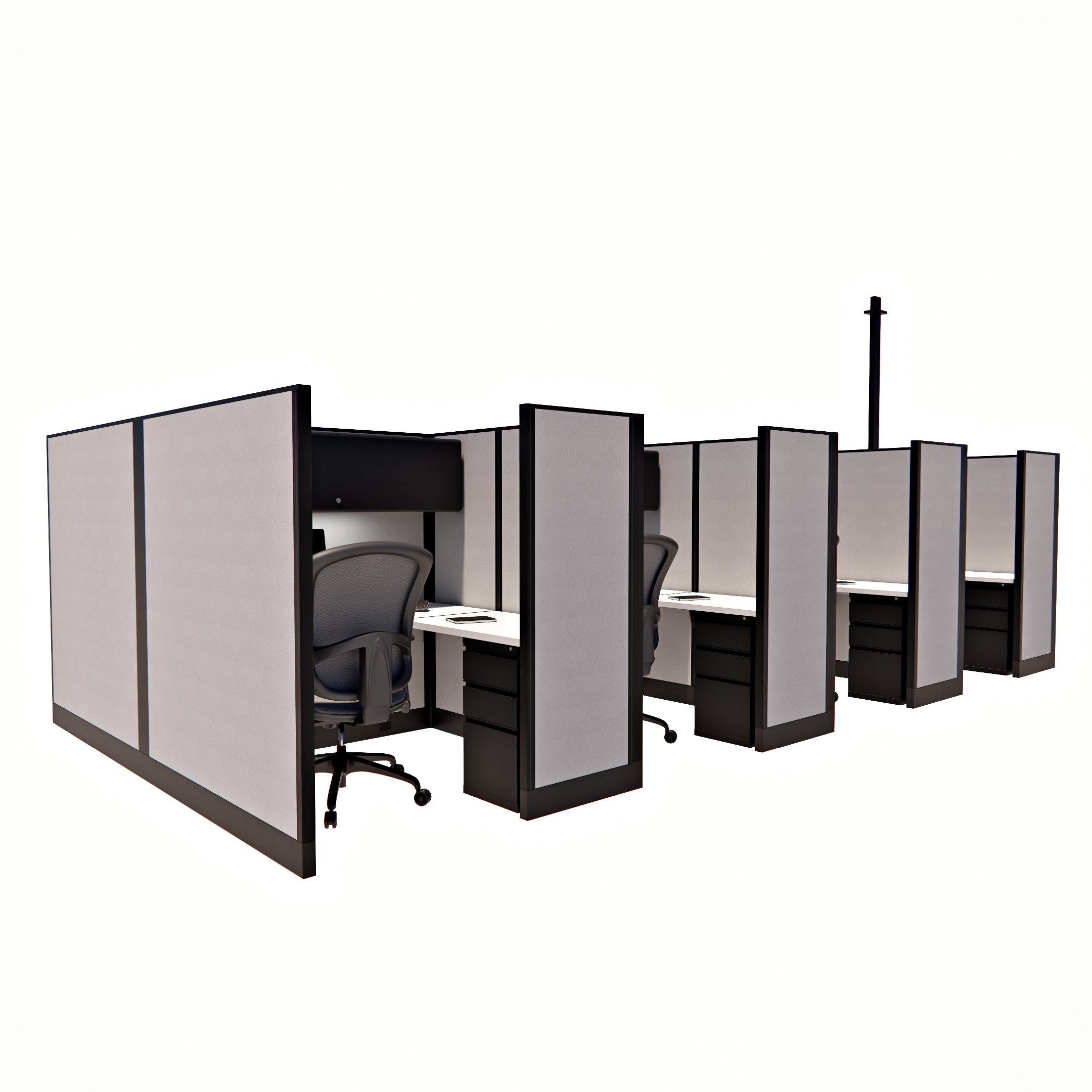 This pod of eight 67-inch tall office cubicles, each measuring 5 by 5 feet, is a popular choice for standard office environments. Each cubicle is equipped with a powered spine panel for convenient access to electrical outlets, a pedestal drawer unit for personal storage, closed overhead storage for additional organization, and an LED task light to enhance workspace visibility. This setup provides a balance of privacy and functionality, making it ideal for focused work while meeting the needs of a busy office. Additional configurations are available at comparable savings.